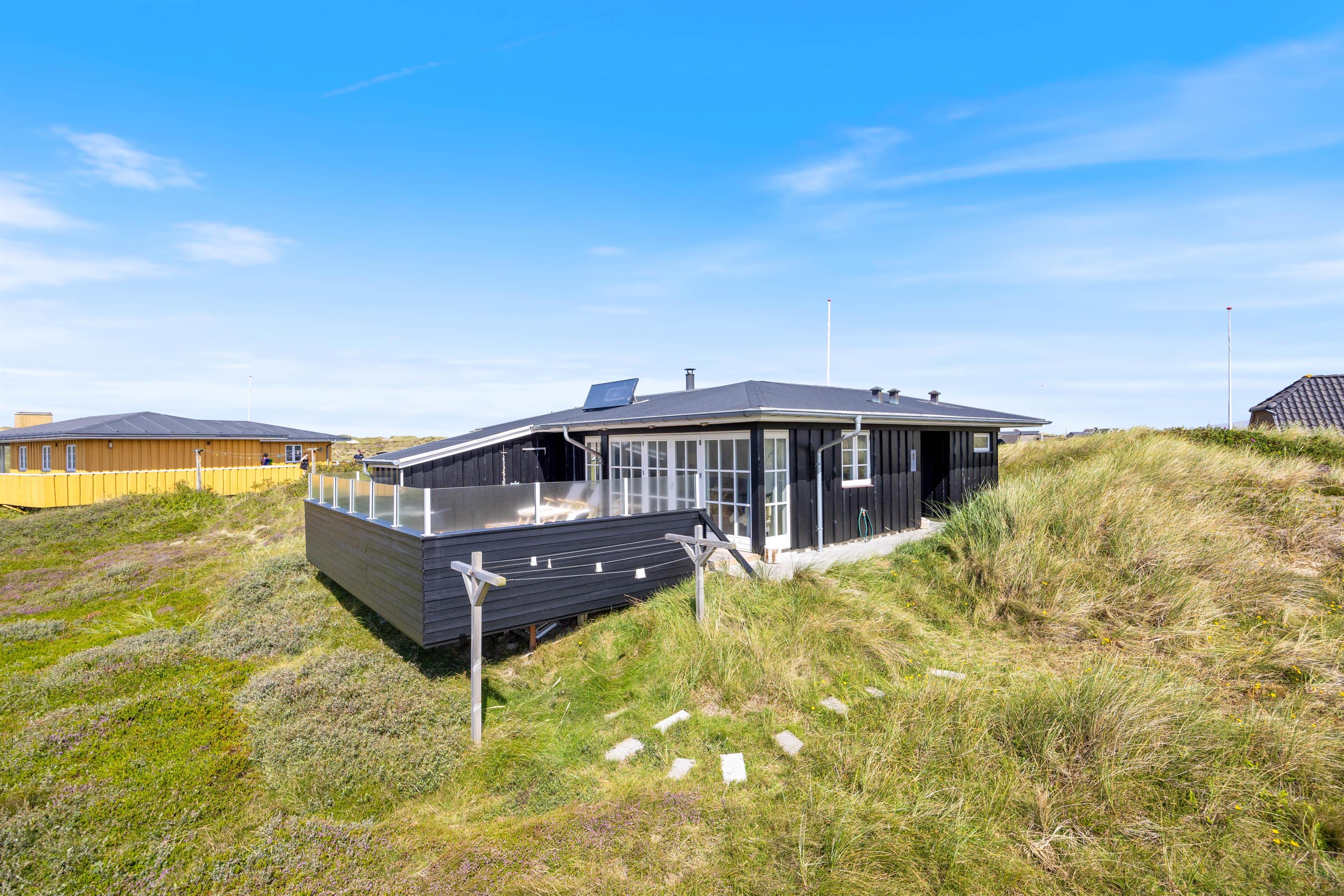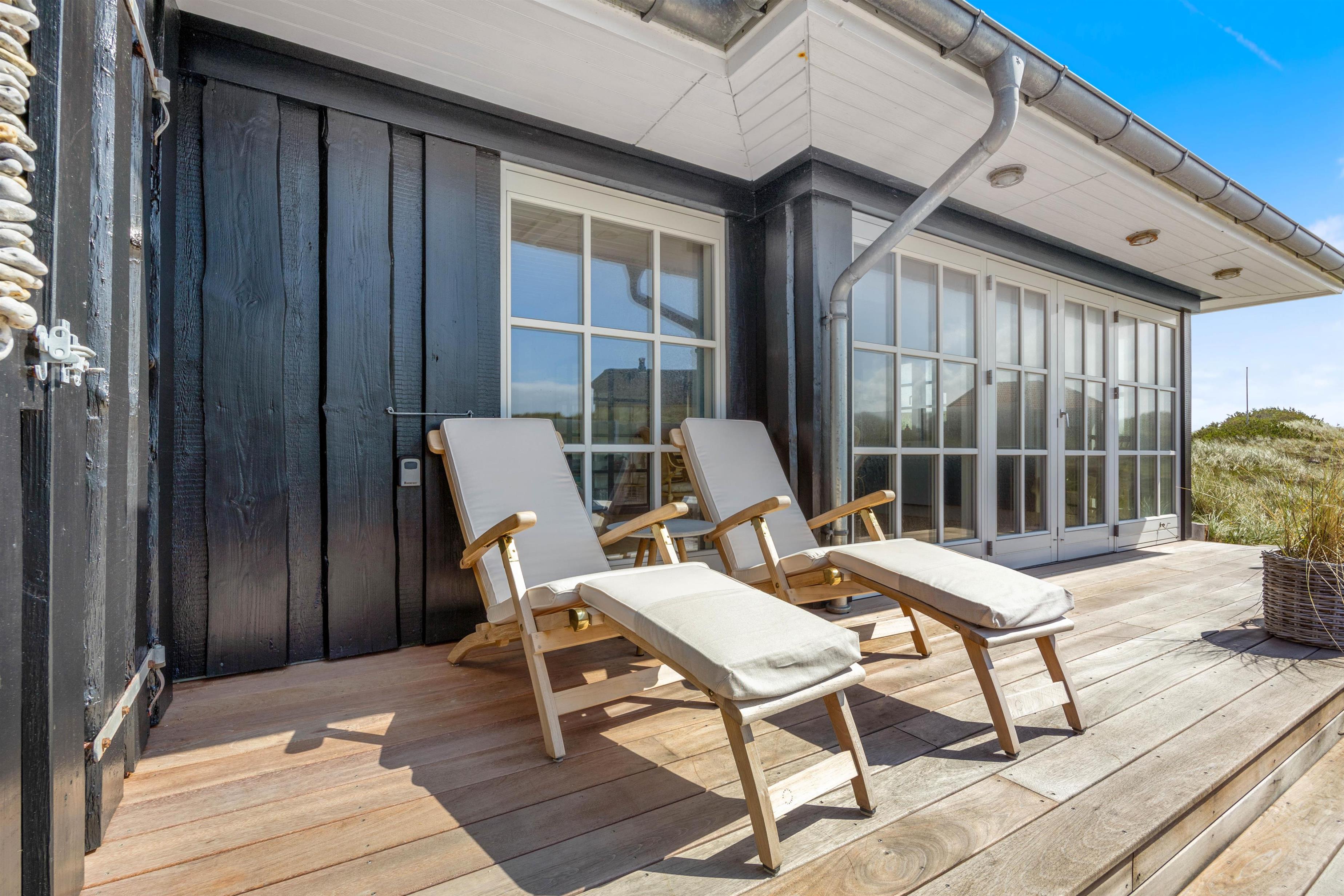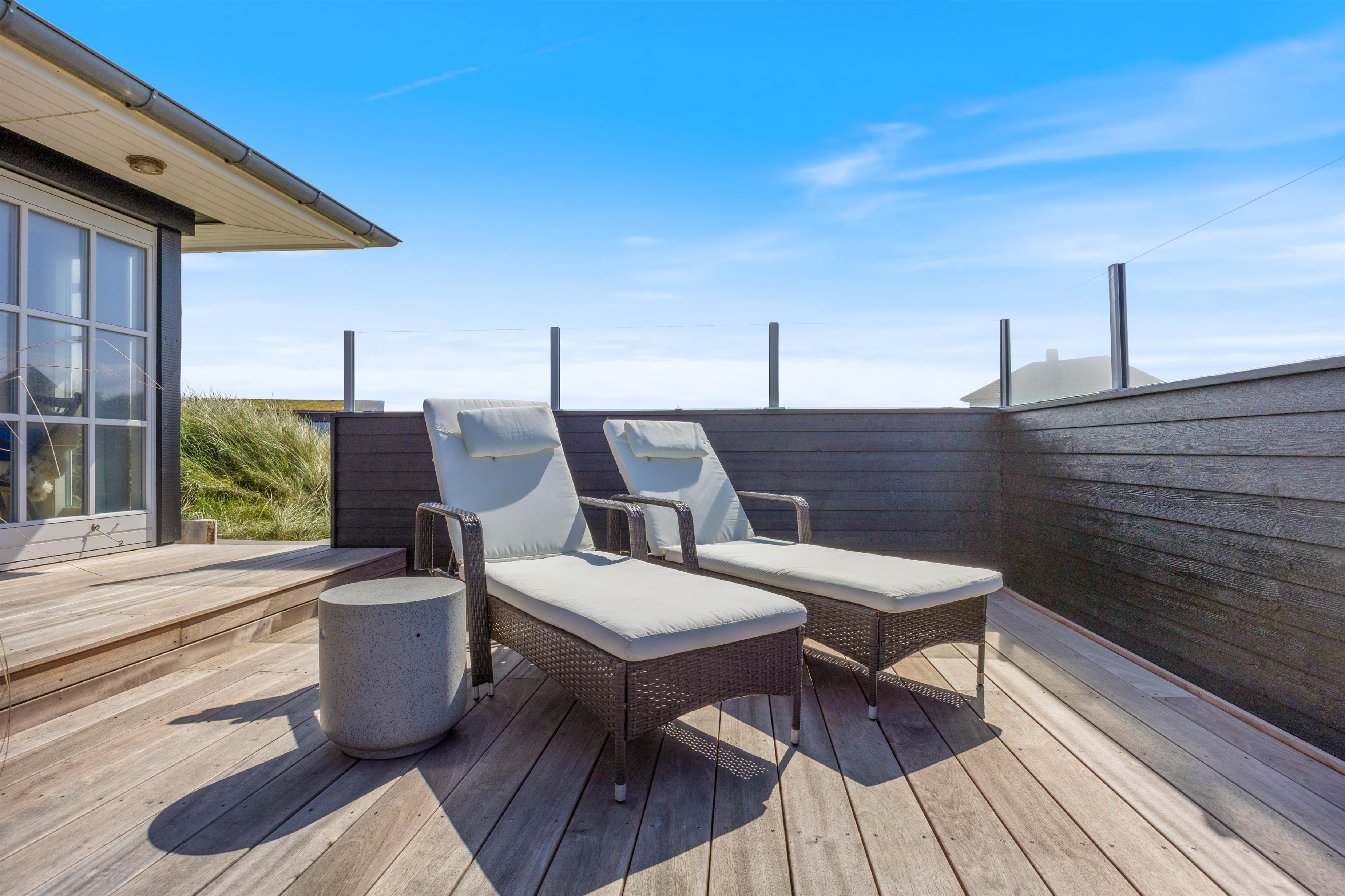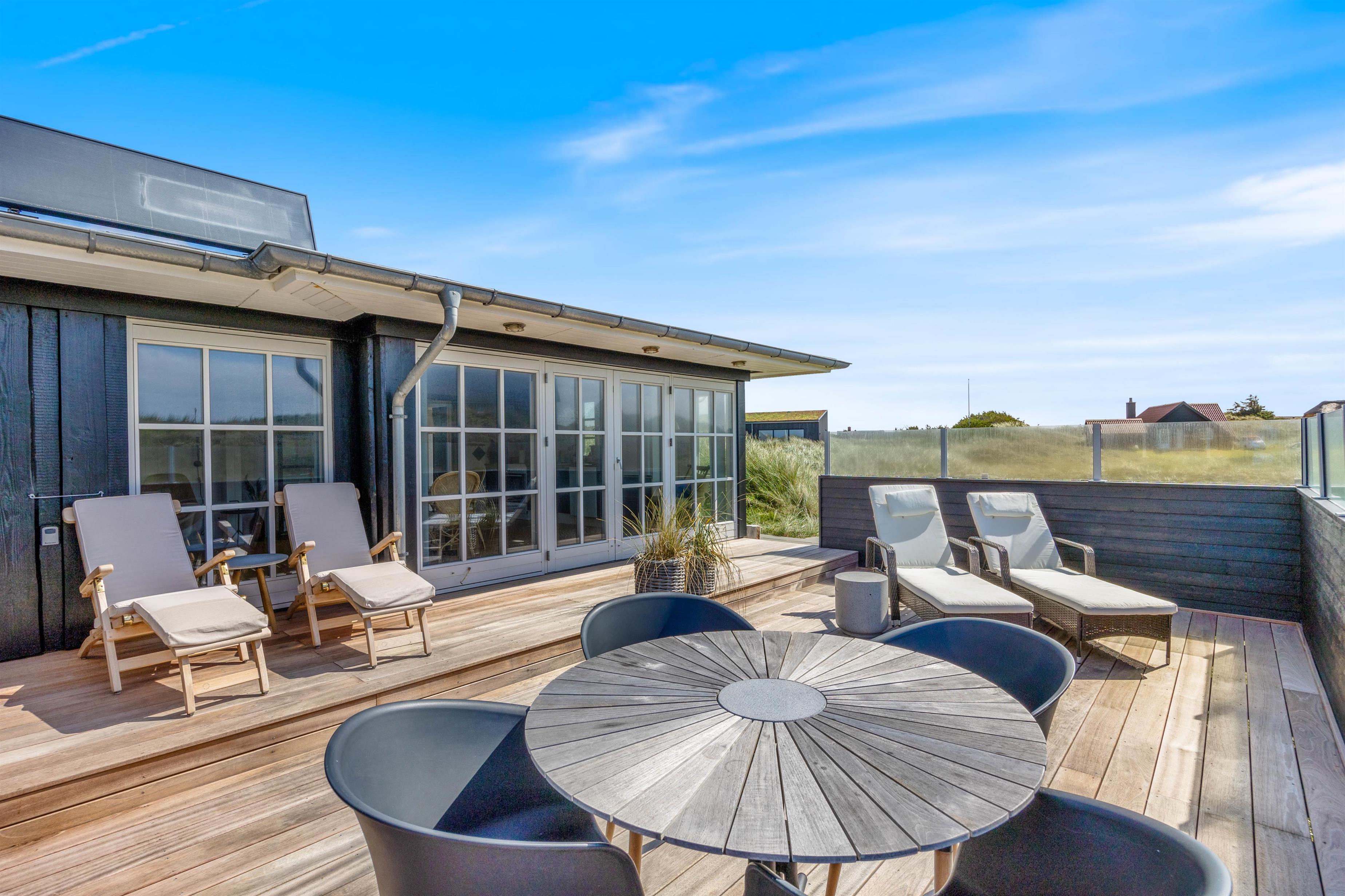 Stor sydvendt træterrasse med læ og udsigt til klitlandskabet