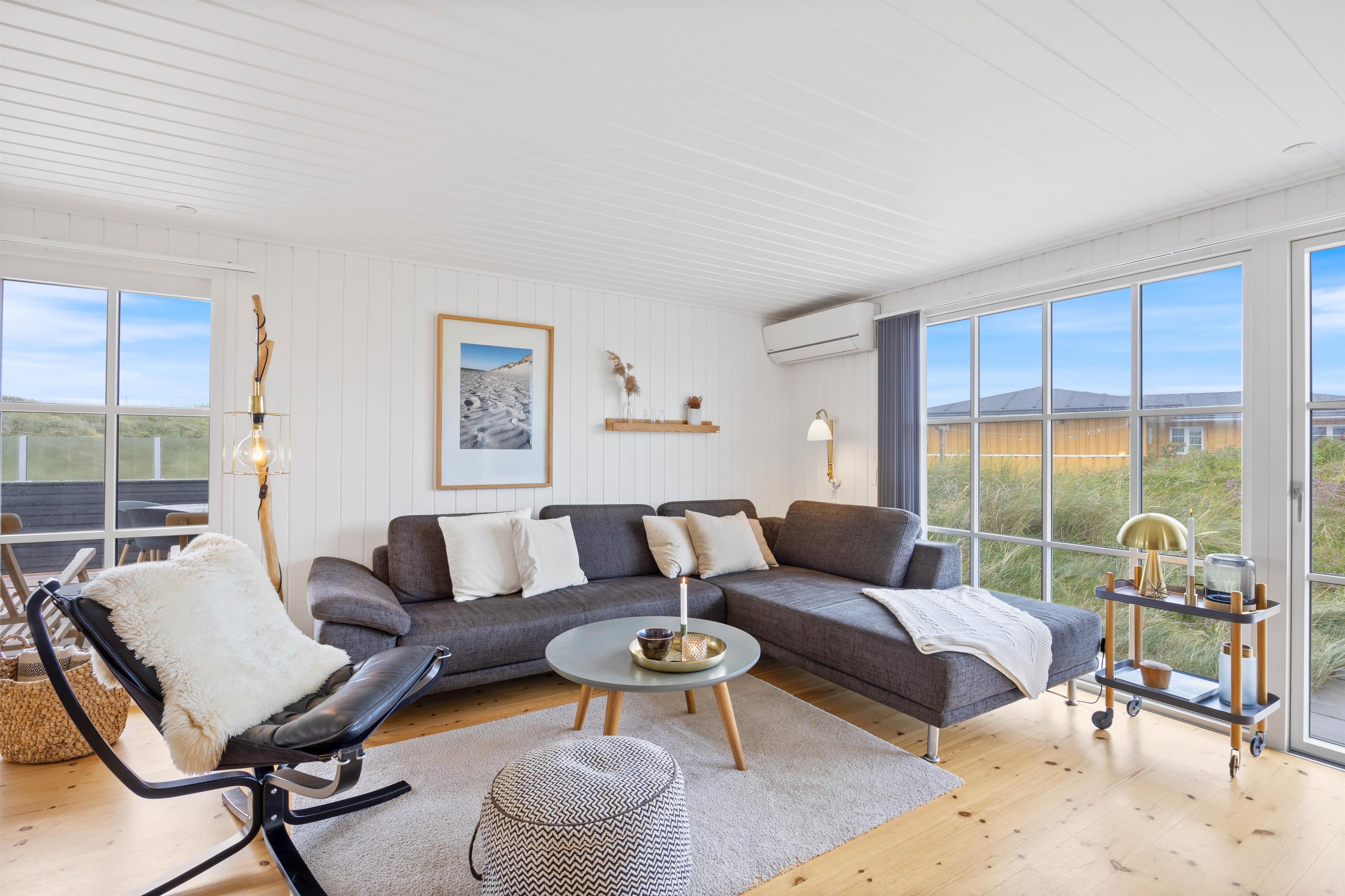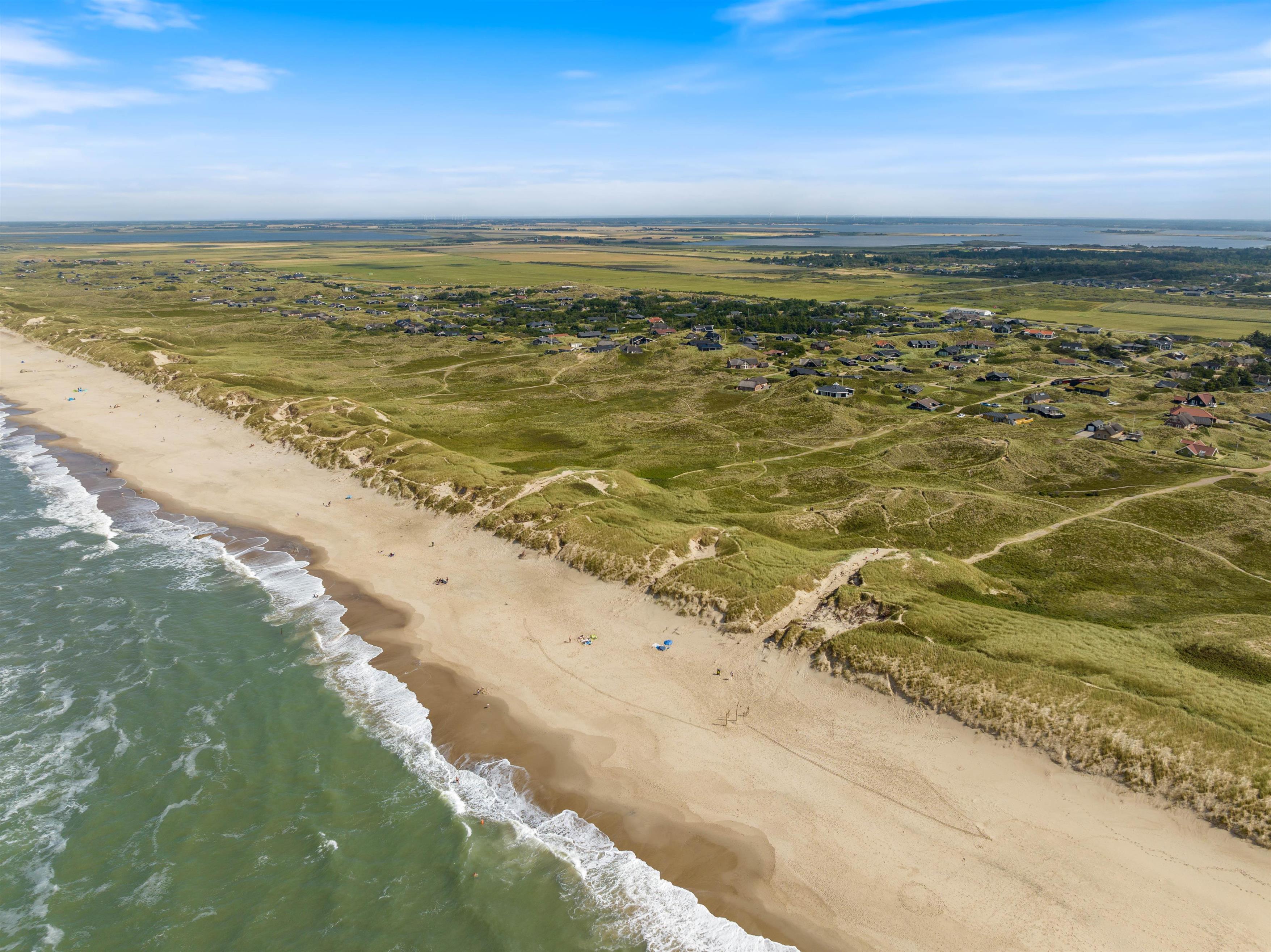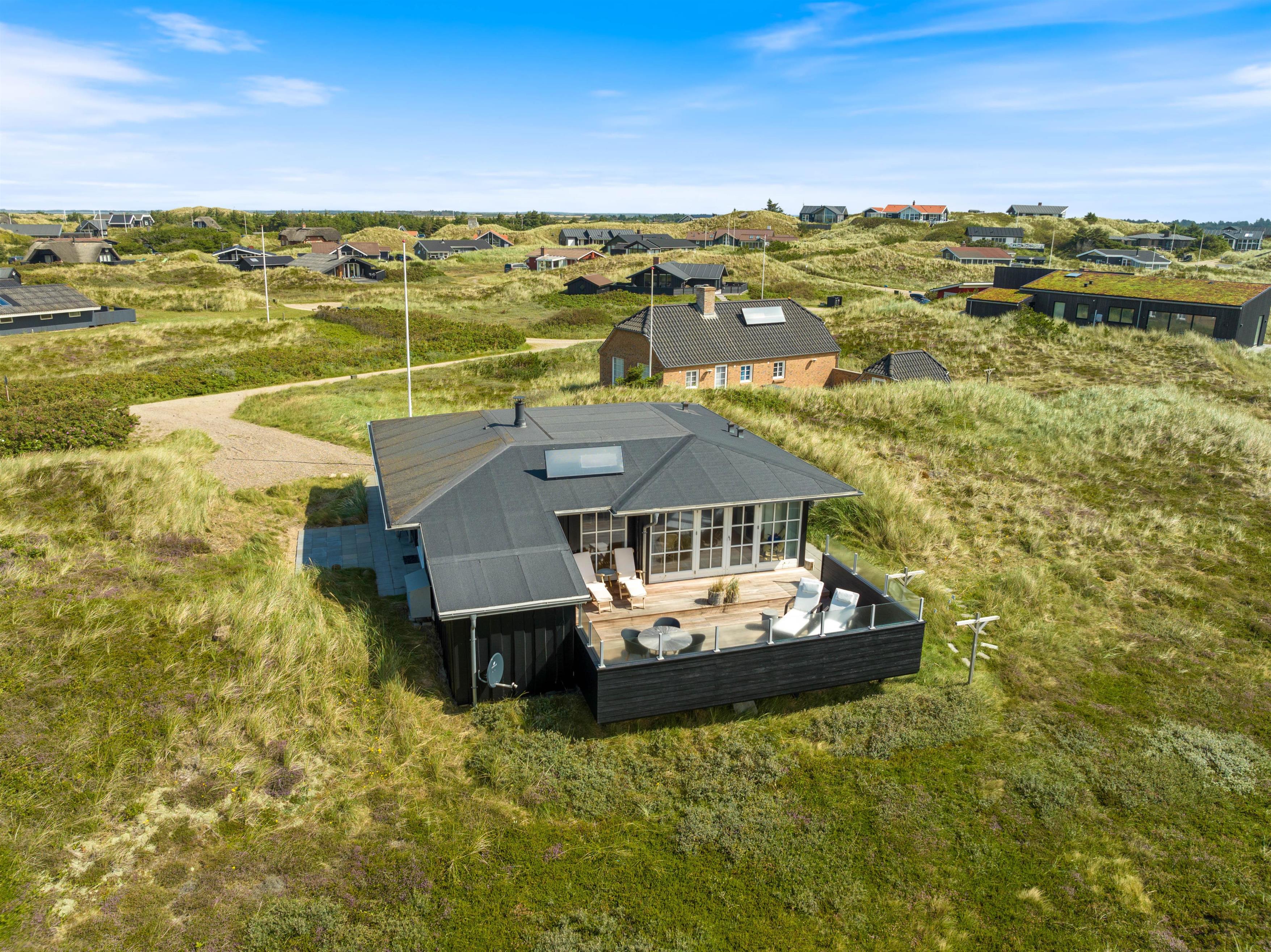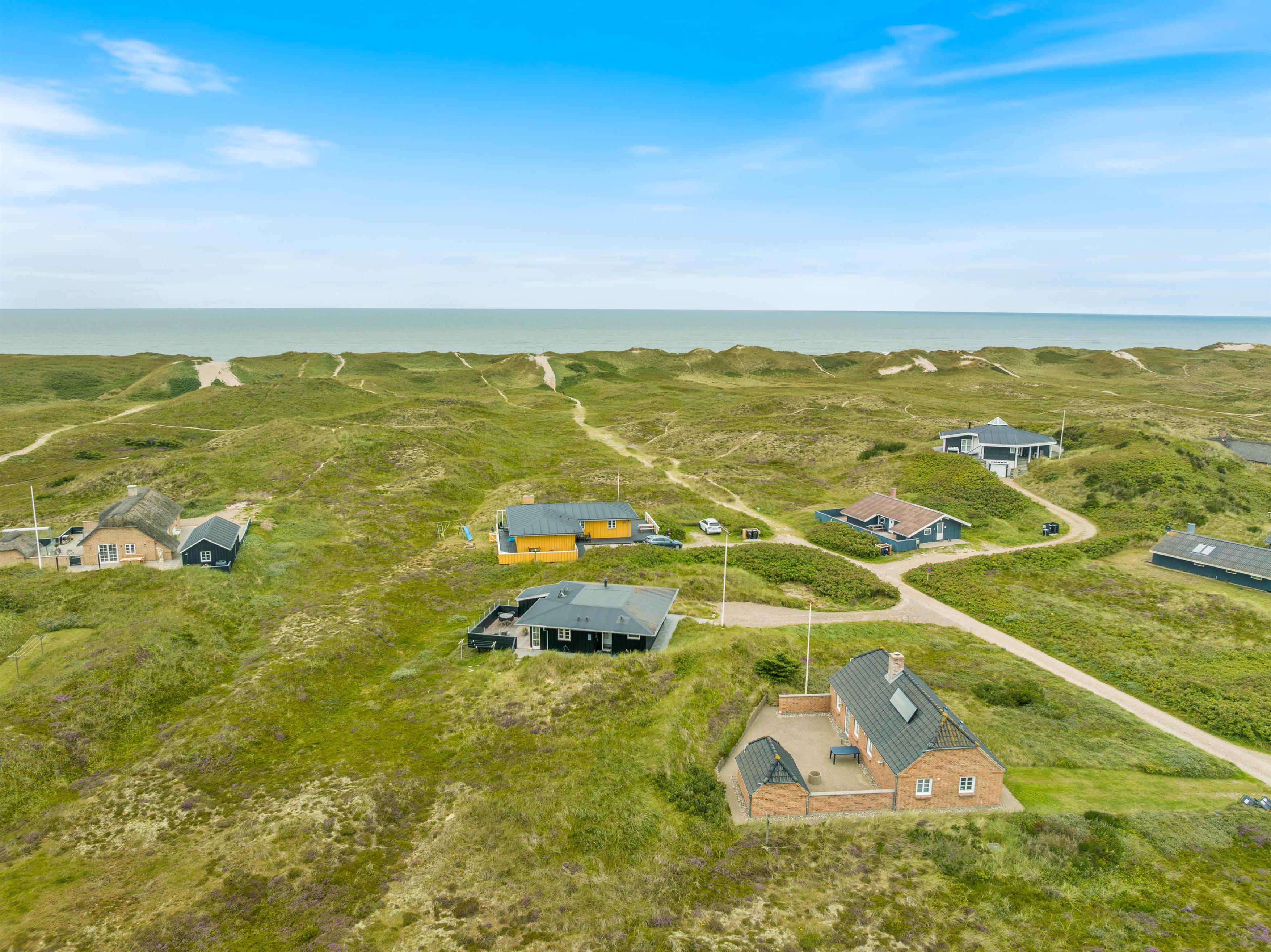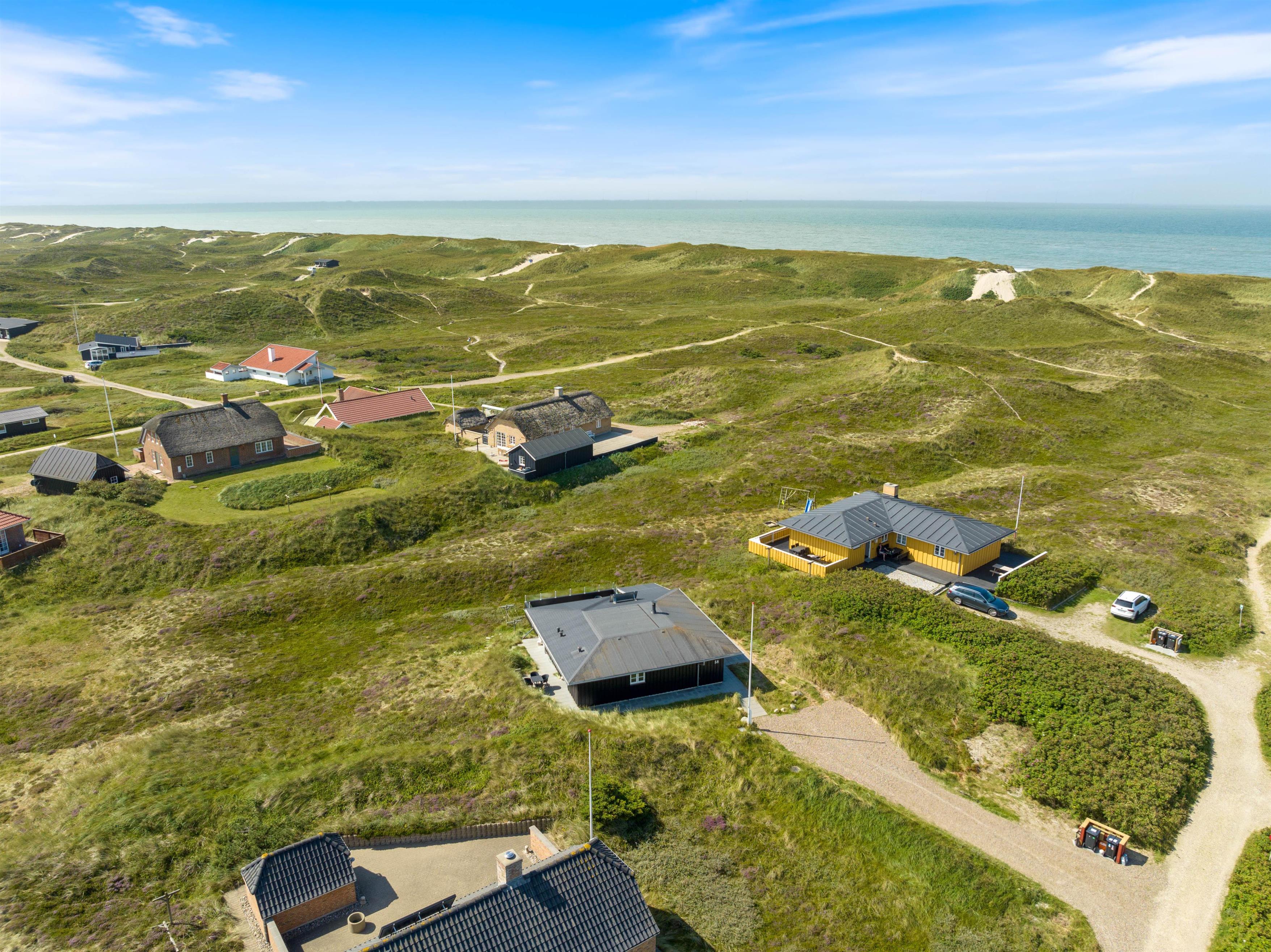 Feriehuset ligger på en 1.400 m2 stor naturgrund kun 250 meter fra stranden. Turen til stranden på gåben tager kun 3 minutter gennem det flotte klitlandskab. I Houvig har i mulighed for at handle lokale delikatesser i gårdbutikken, der også rummer en café. Få minutters kørsel fra sommerhuset ligger feriebyen Søndervig, der byder på masser af aktivitetsmuligheder, restauranter og forskellige forretninger.