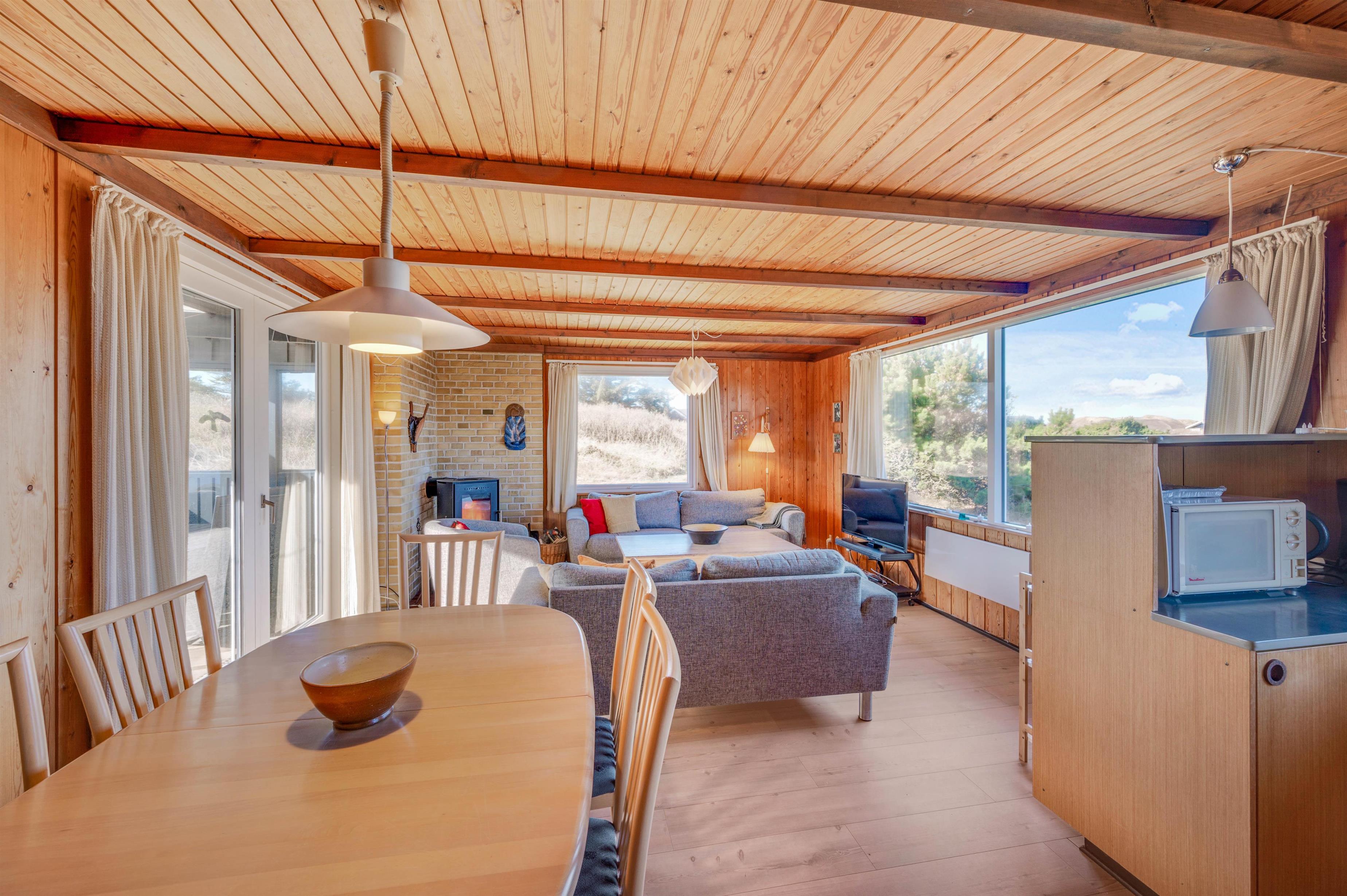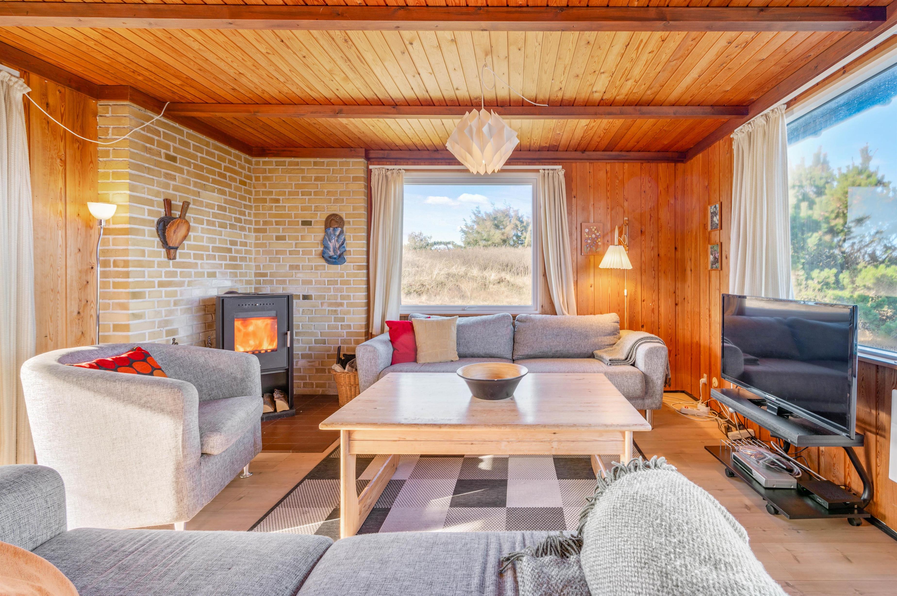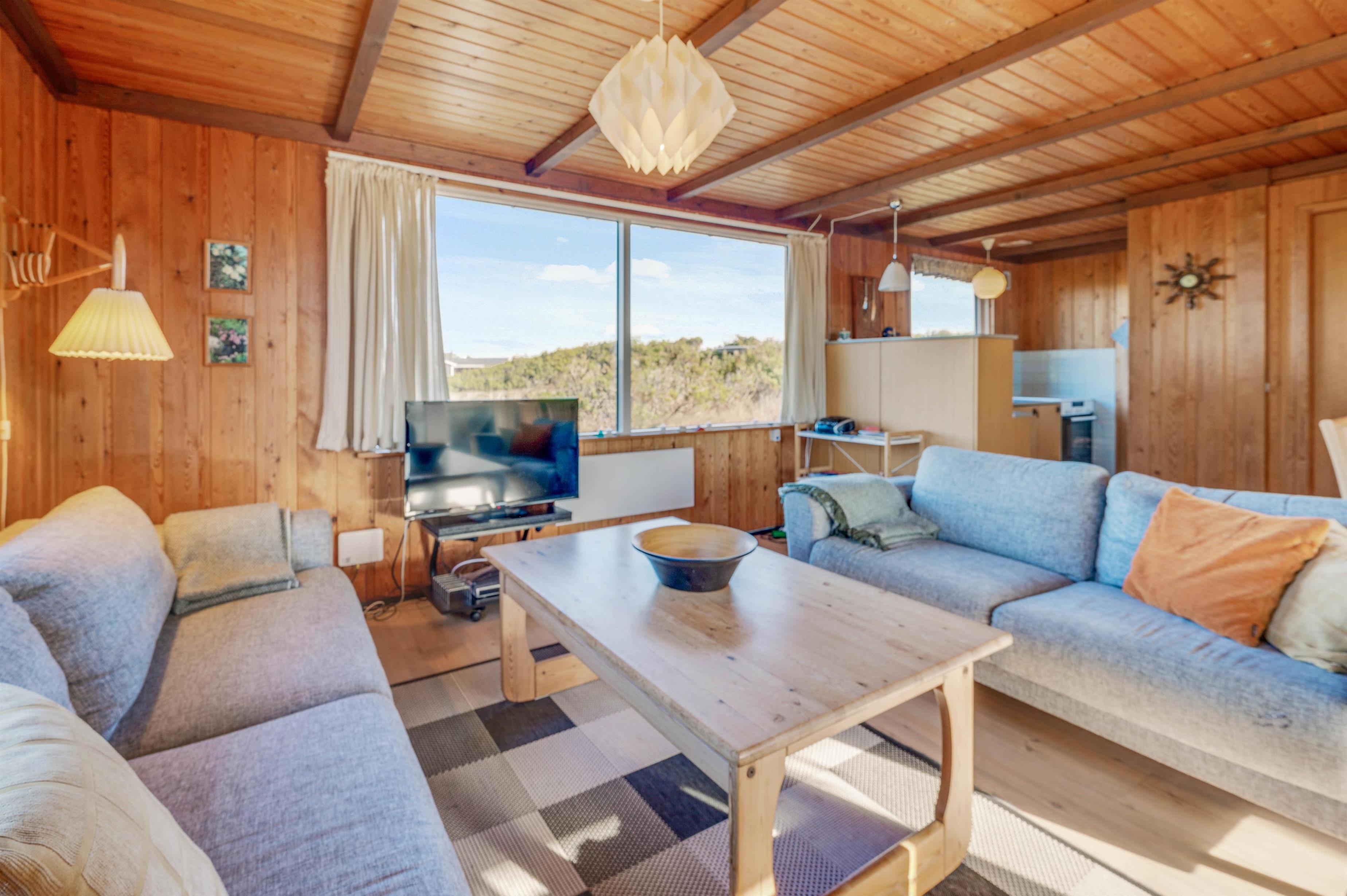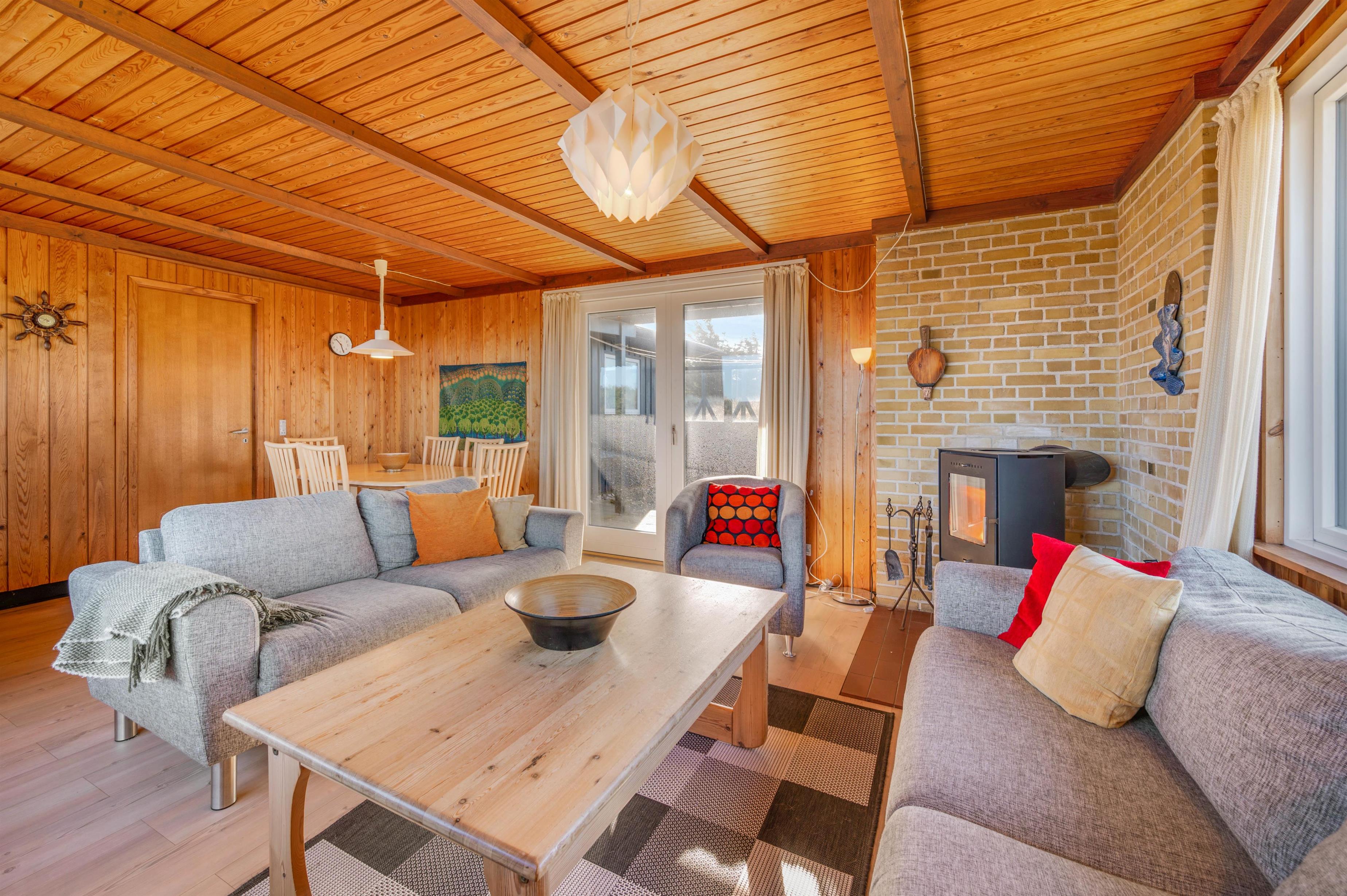 Huset rummer alt det, man forbinder med et hyggelig, dansk sommerhus. Her er der træpaneler på vægge og lofter, bløde sofaer, gulvtæpper i stue og på værelser samt en knitrende brændeovn, der sætter prikken over i’et. Stuen er kombineret med spiseafdelingen og udstyret med gode møbler, TV, gratis internet, radio og CD.