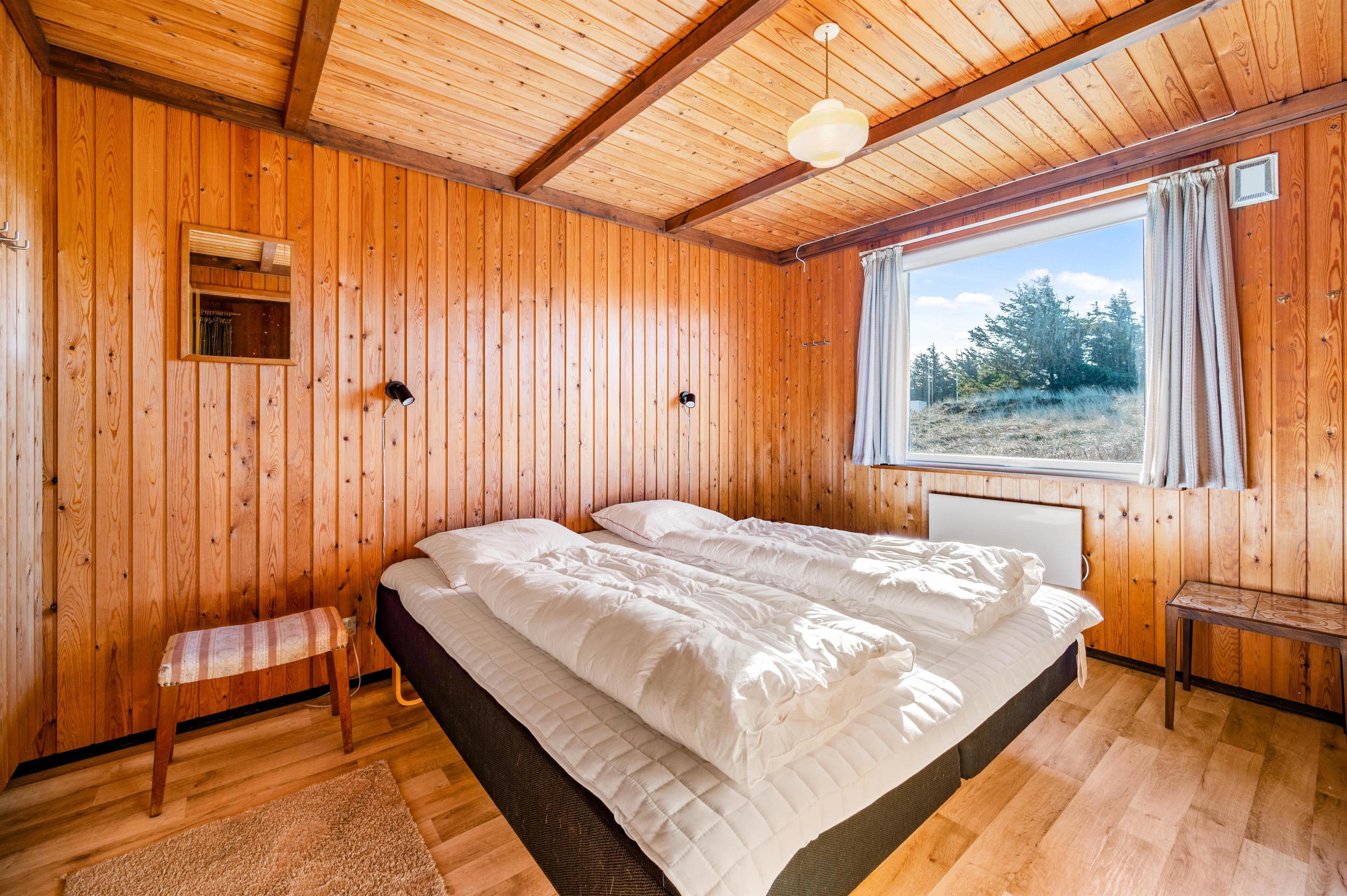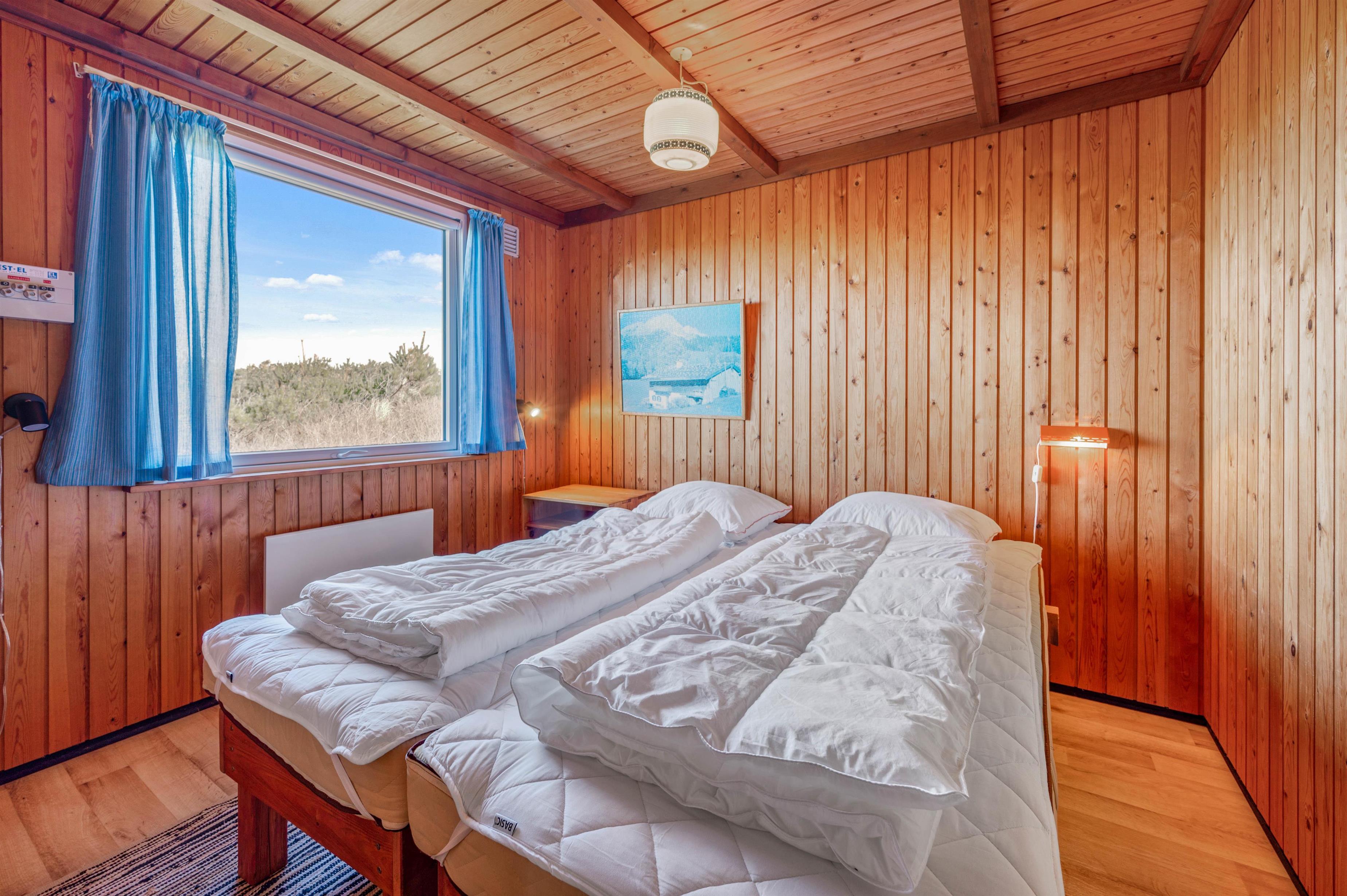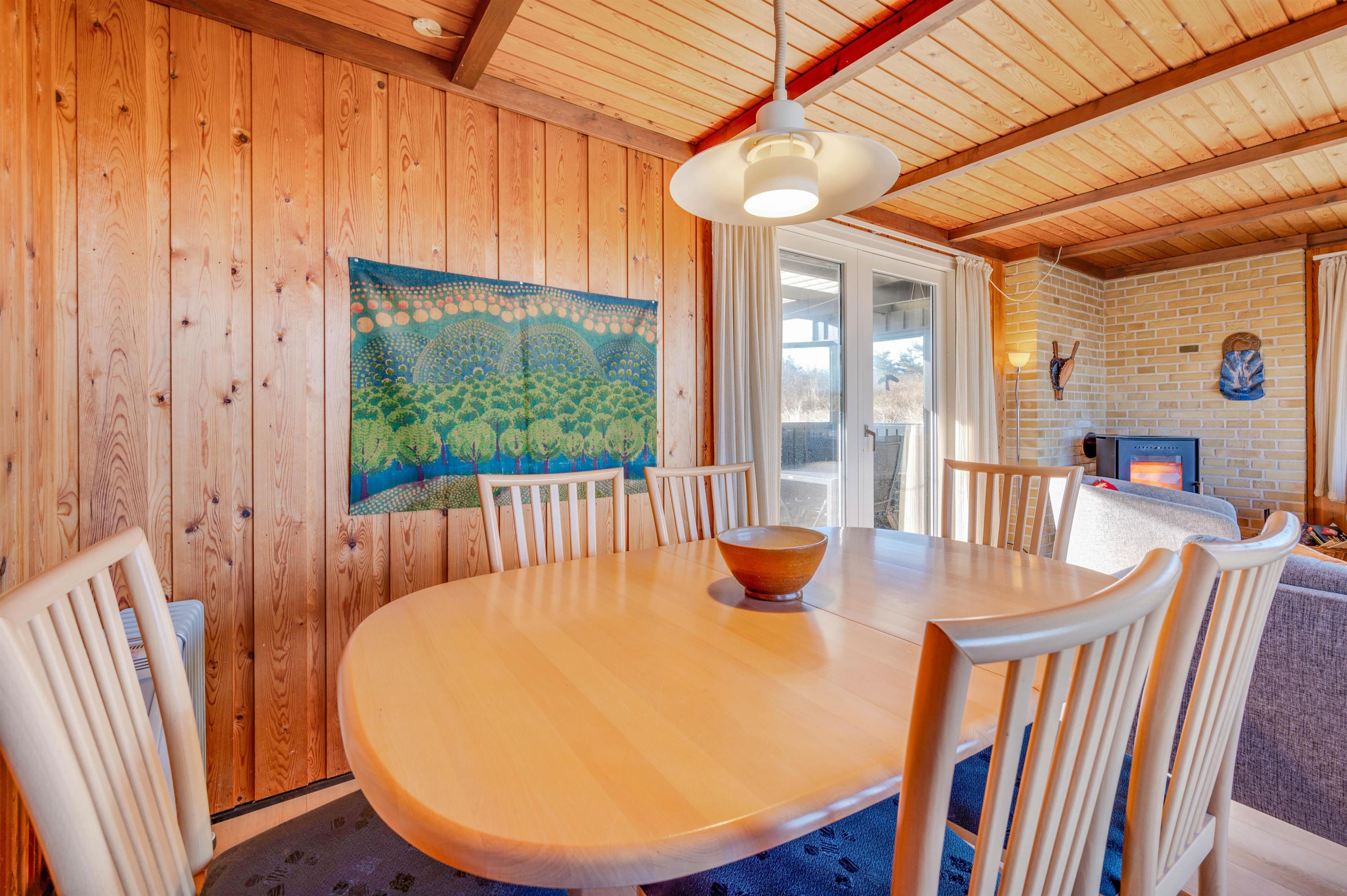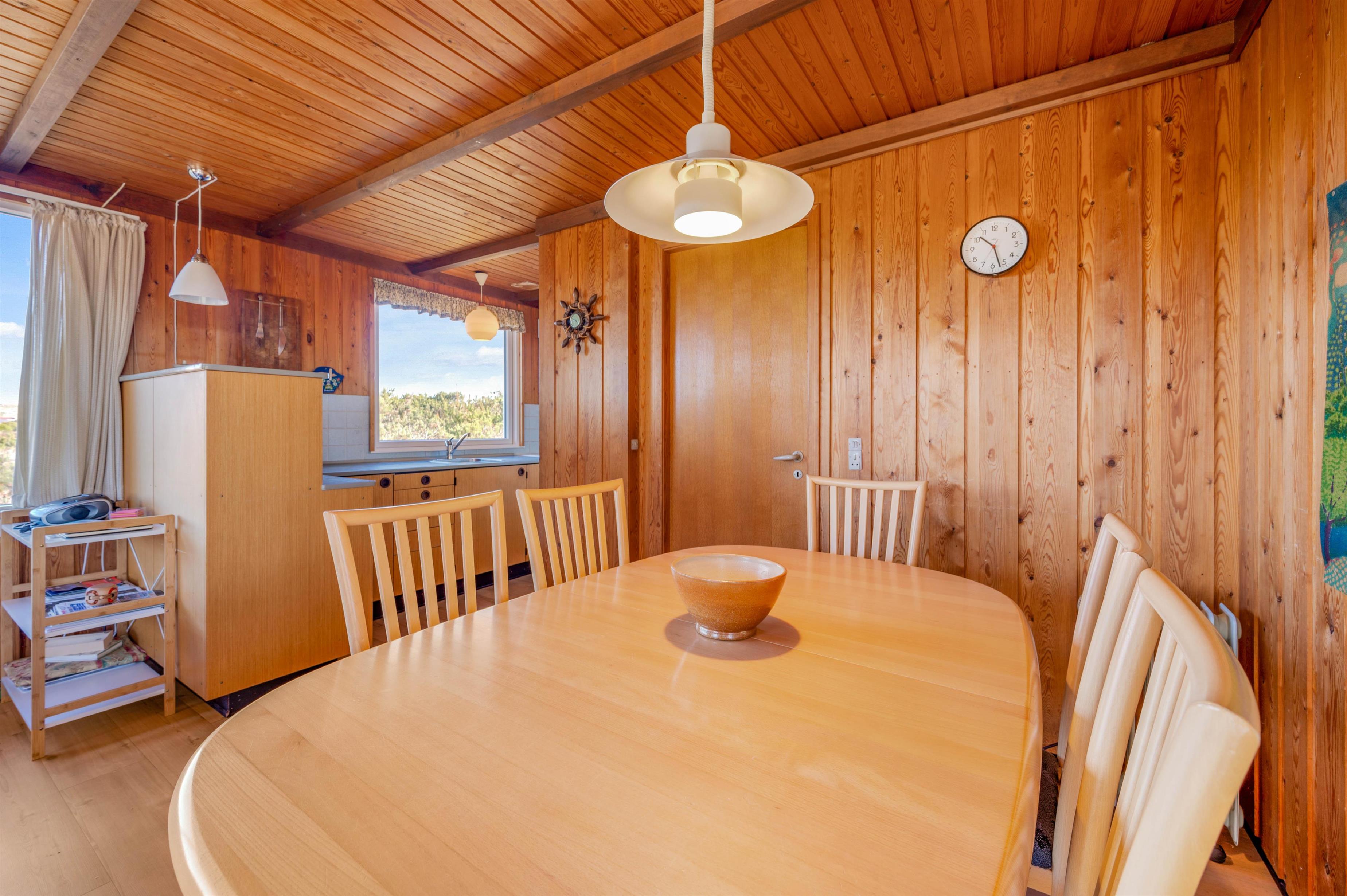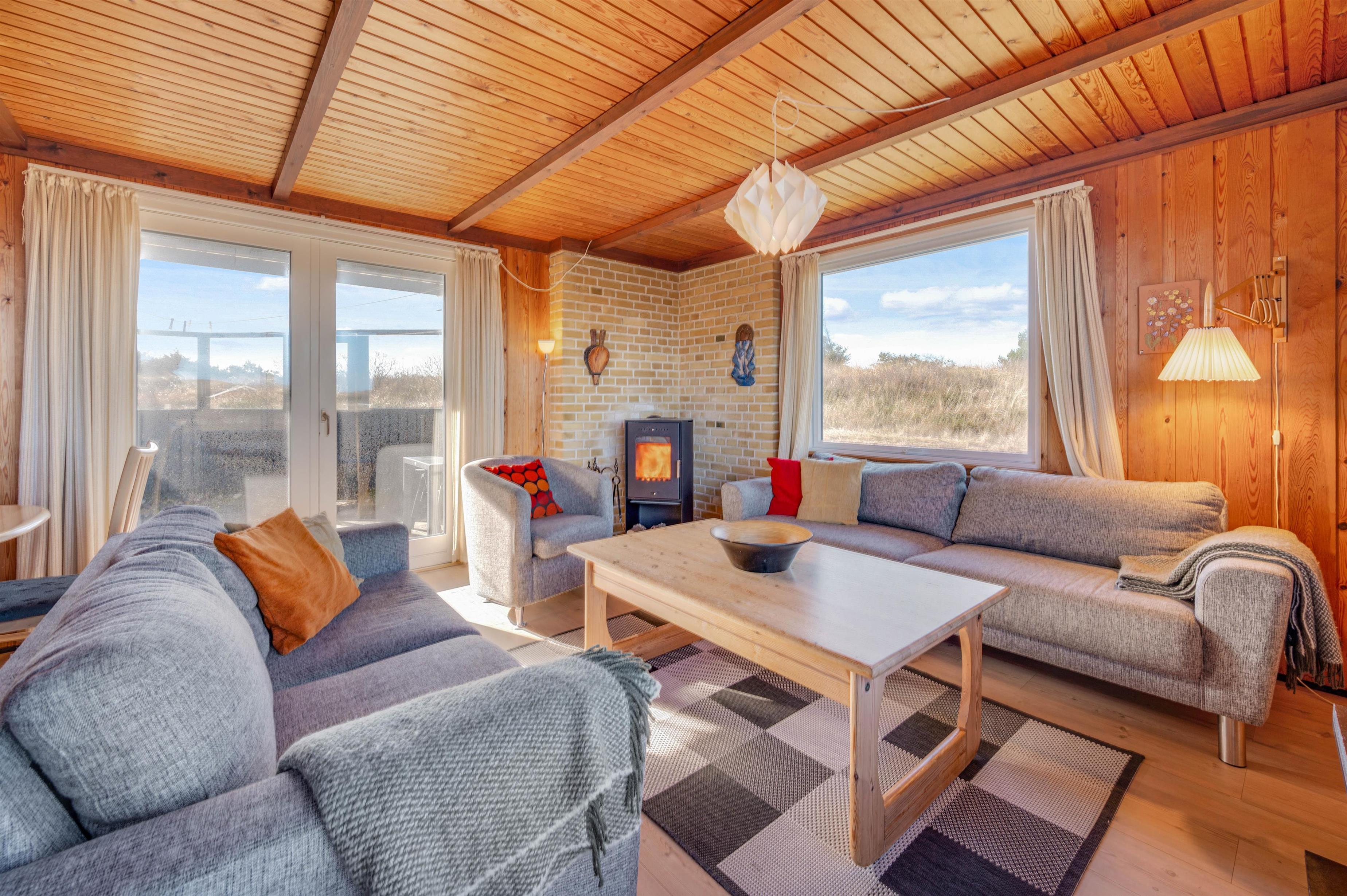 Huset rummer alt det, man forbinder med et hyggelig, dansk sommerhus. Her er der træpaneler på vægge og lofter, bløde sofaer, gulvtæpper i stue og på værelser samt en knitrende brændeovn, der sætter prikken over i’et. Stuen er kombineret med spiseafdelingen og udstyret med gode møbler, TV, gratis internet, radio og CD.