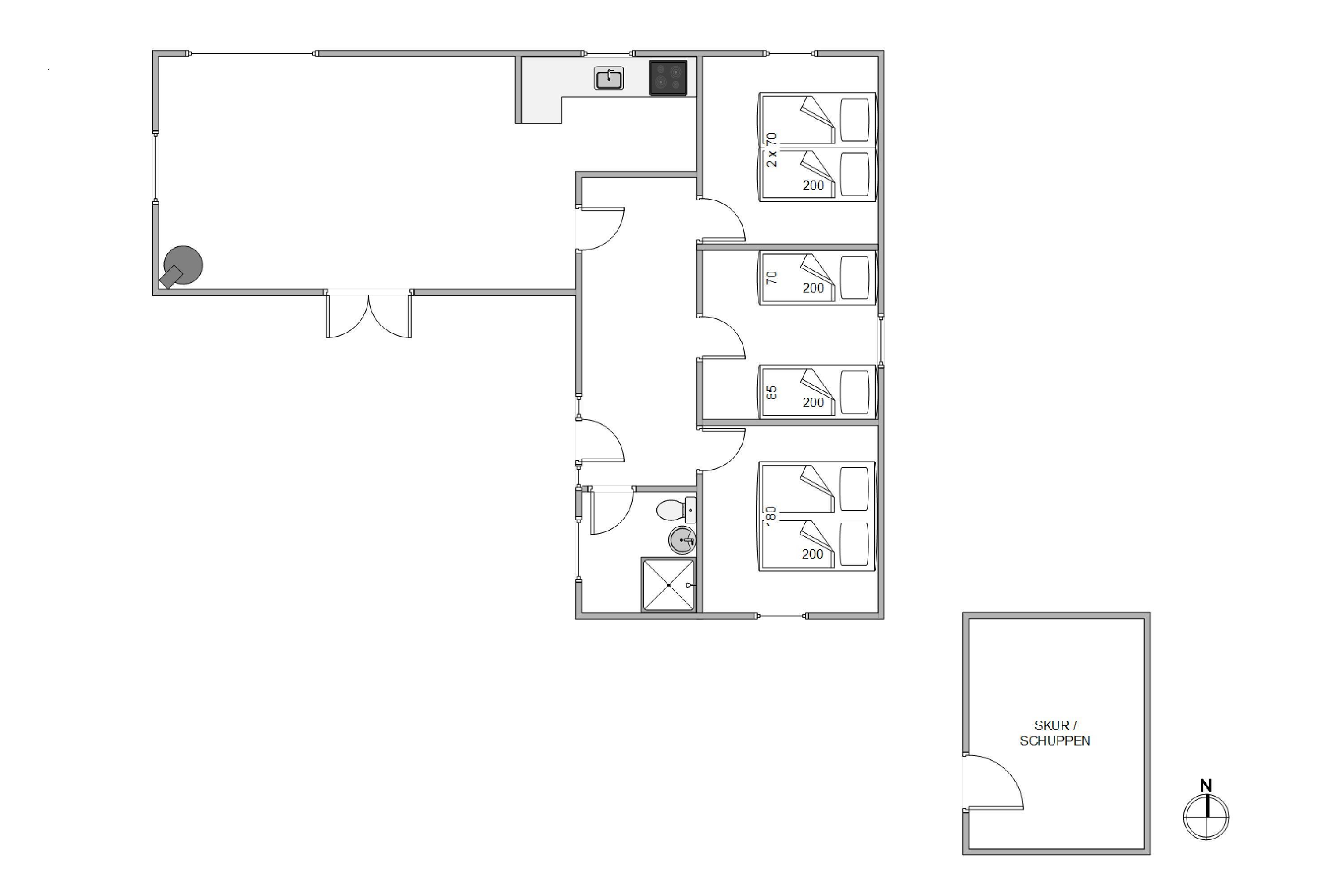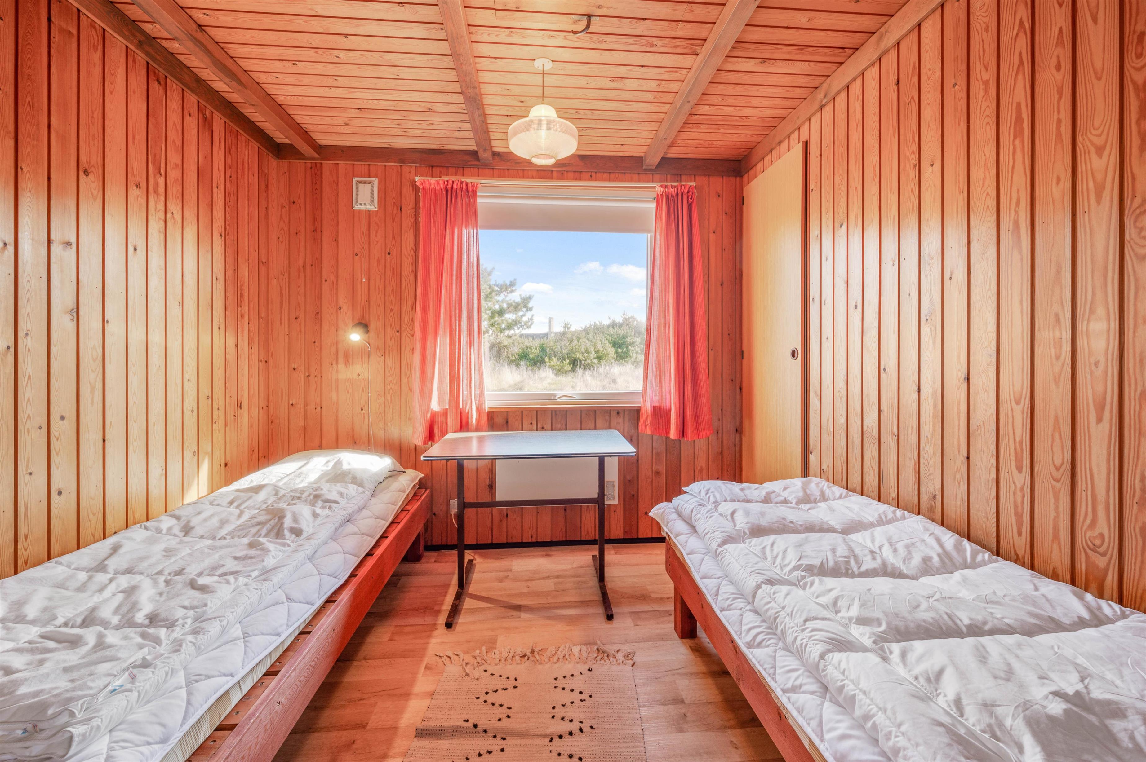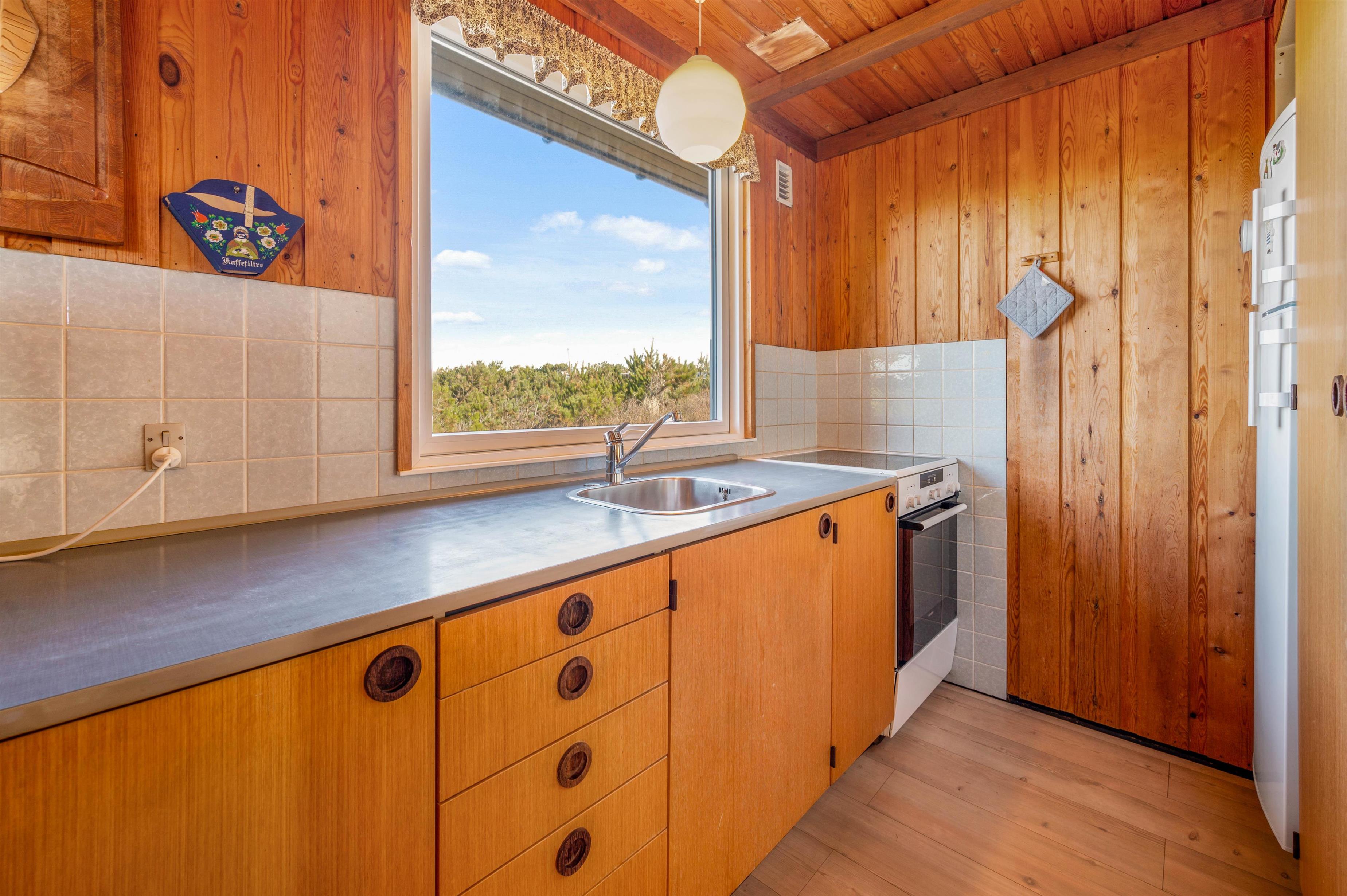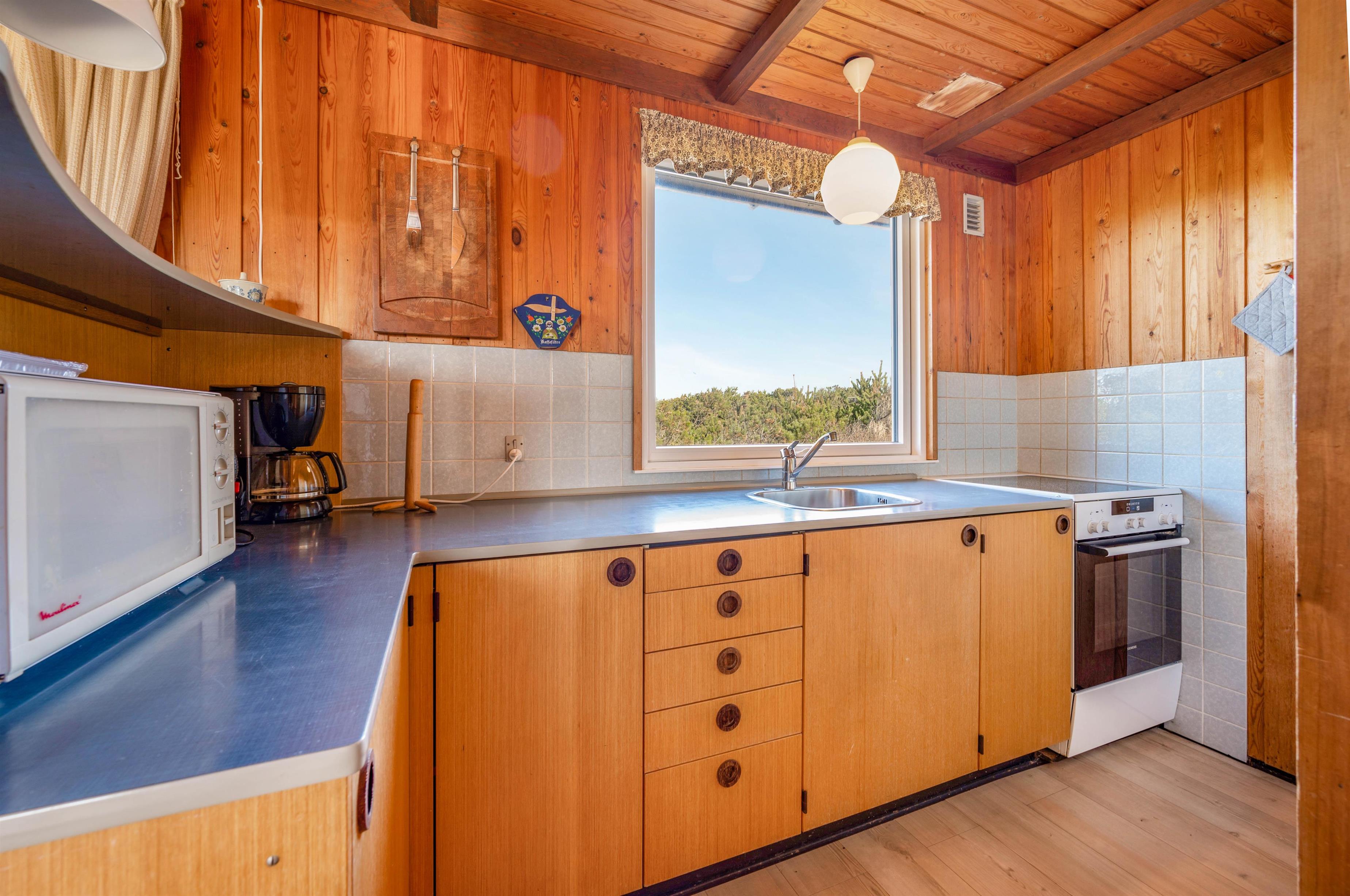 Køkkenet ligger i direkte forbindelse med opholdsrummet. Det er lille, men aldeles funktionelt, og er blandt andet udstyret med mikroovn og køleskab. Herudover finder I 3 gode værelser i huset, hvoraf 1 er indrettet med dobbeltseng, mens de resterede 2 har hver 2 enkeltsenge.