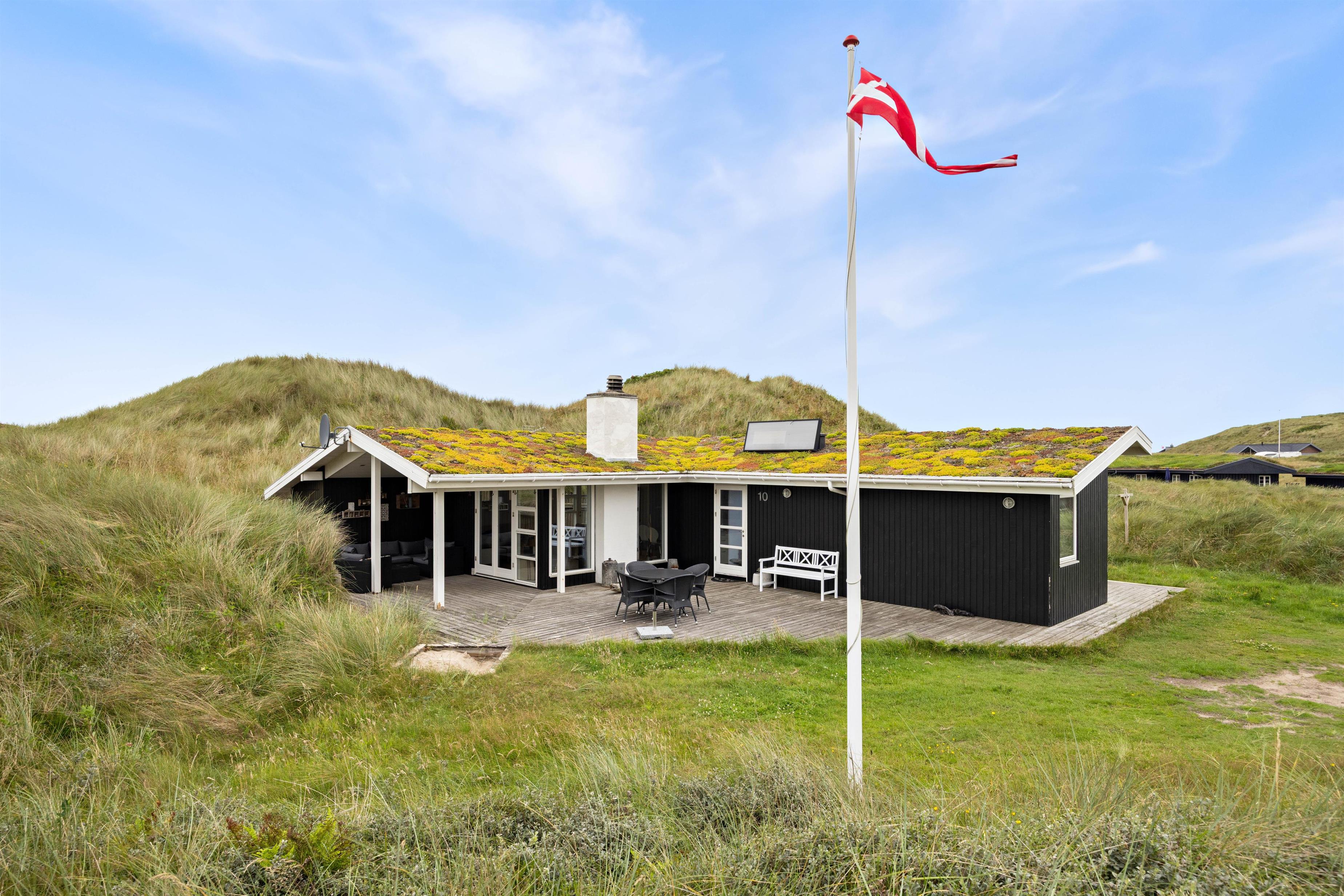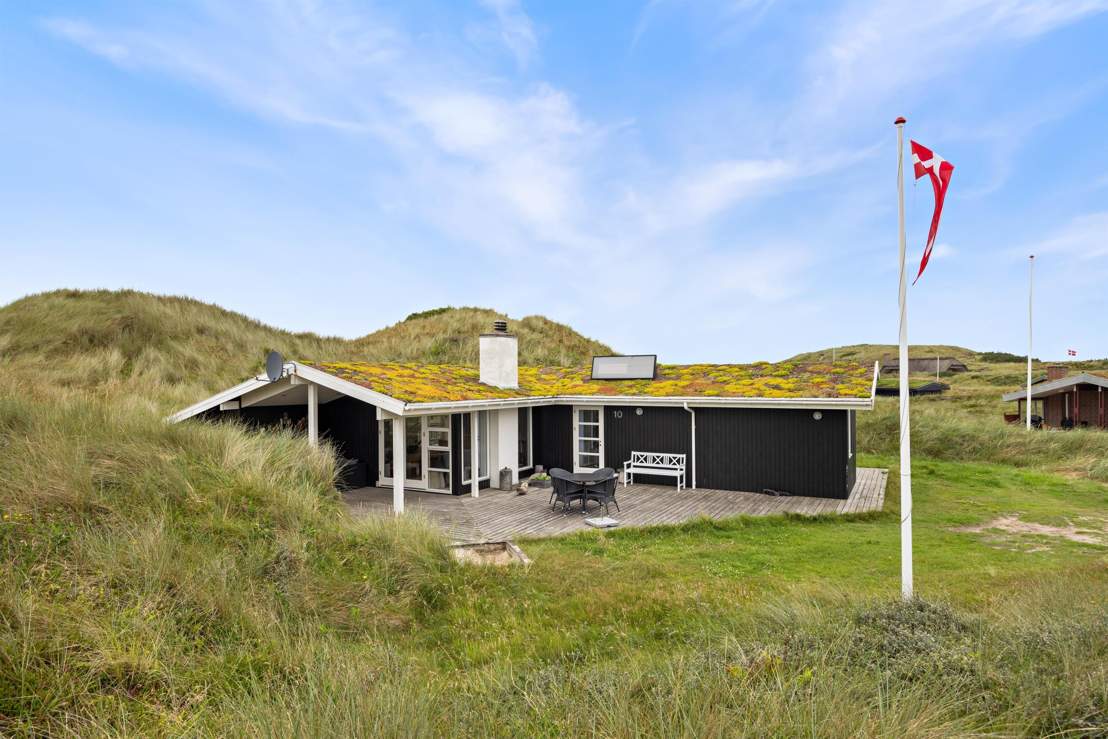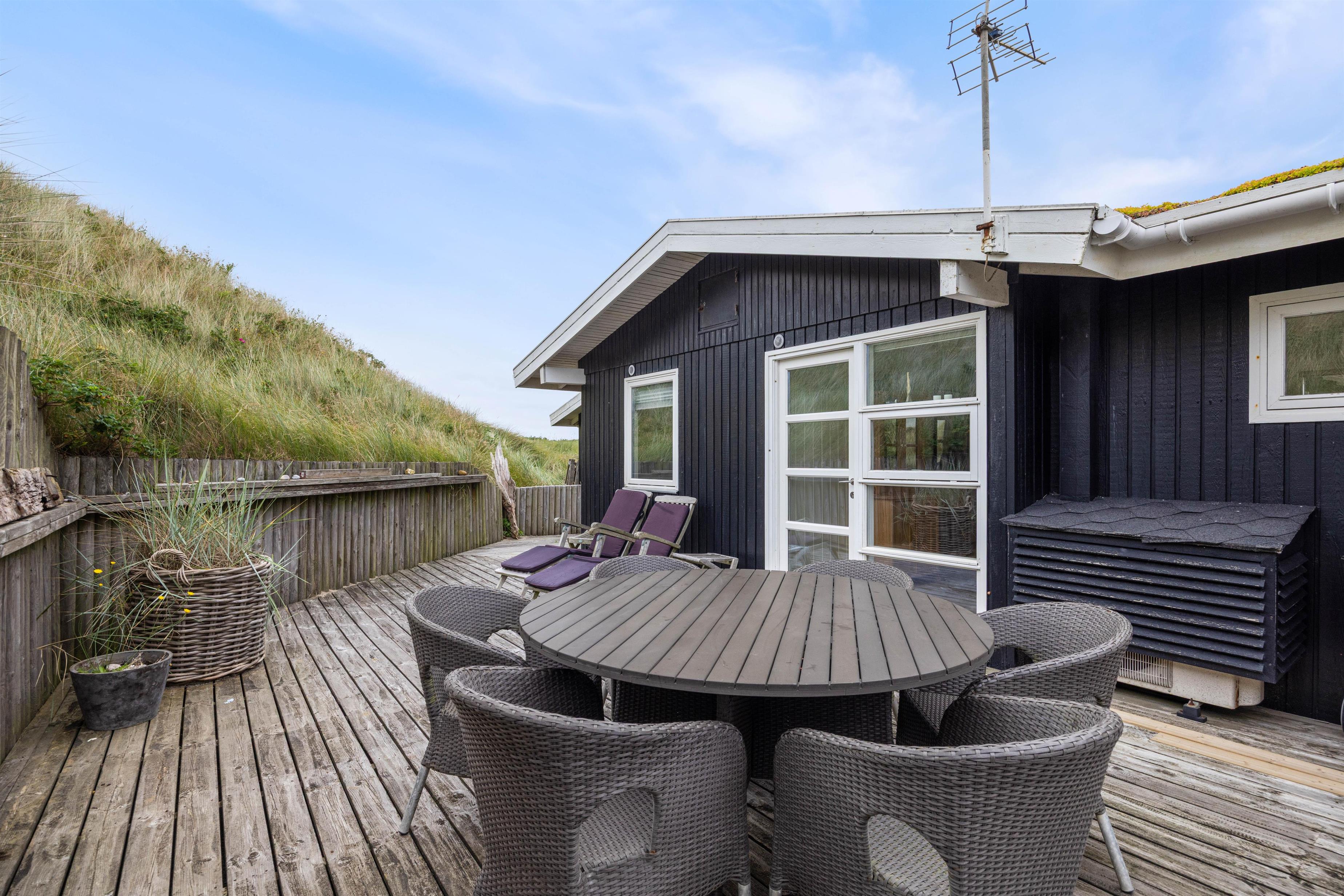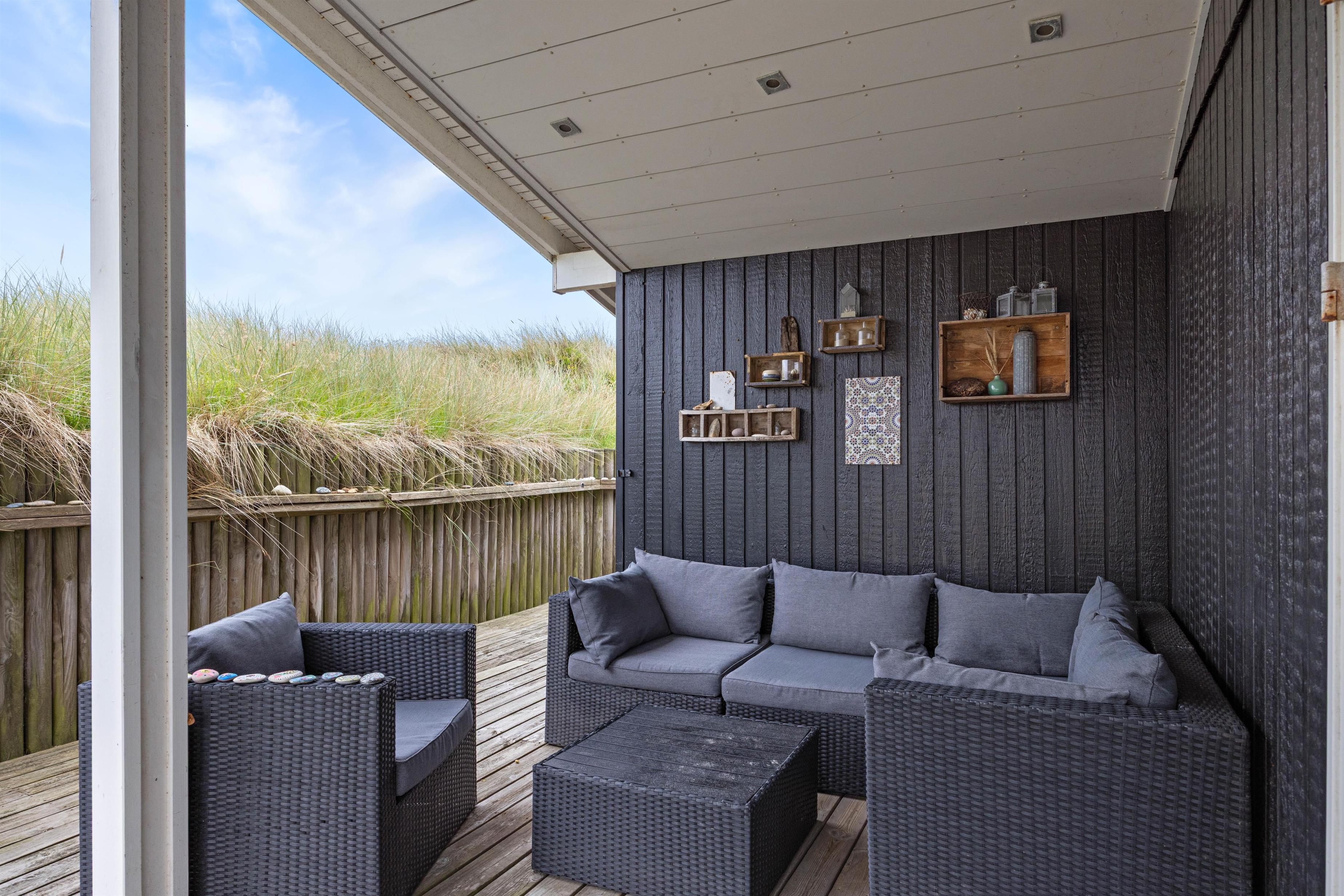 Sommerhuset på sortebærdalen 10 imponerer ikke kun indvendigt. Udenfor på adressen finder I nemlig nogle yderst indbydende arealer, hvor der er rig mulighed for at slappe af og nyde den skønne natur. Den dejlige træterrasse løber hele vejen rundt om huset, hvilket betyder at der mulighed for at nyde solens stråler og den friske luft uanset vind og vejr. Den ene del af terrassen som vender vest ligger godt beskyttet af den foranliggende klit, hvilket giver masser af privatliv. Samtidig kan I også nyde den overdækket terrasse, som giver jer mulighed for at nyde udelivet, på trods af det måske skulle dryppe lidt.