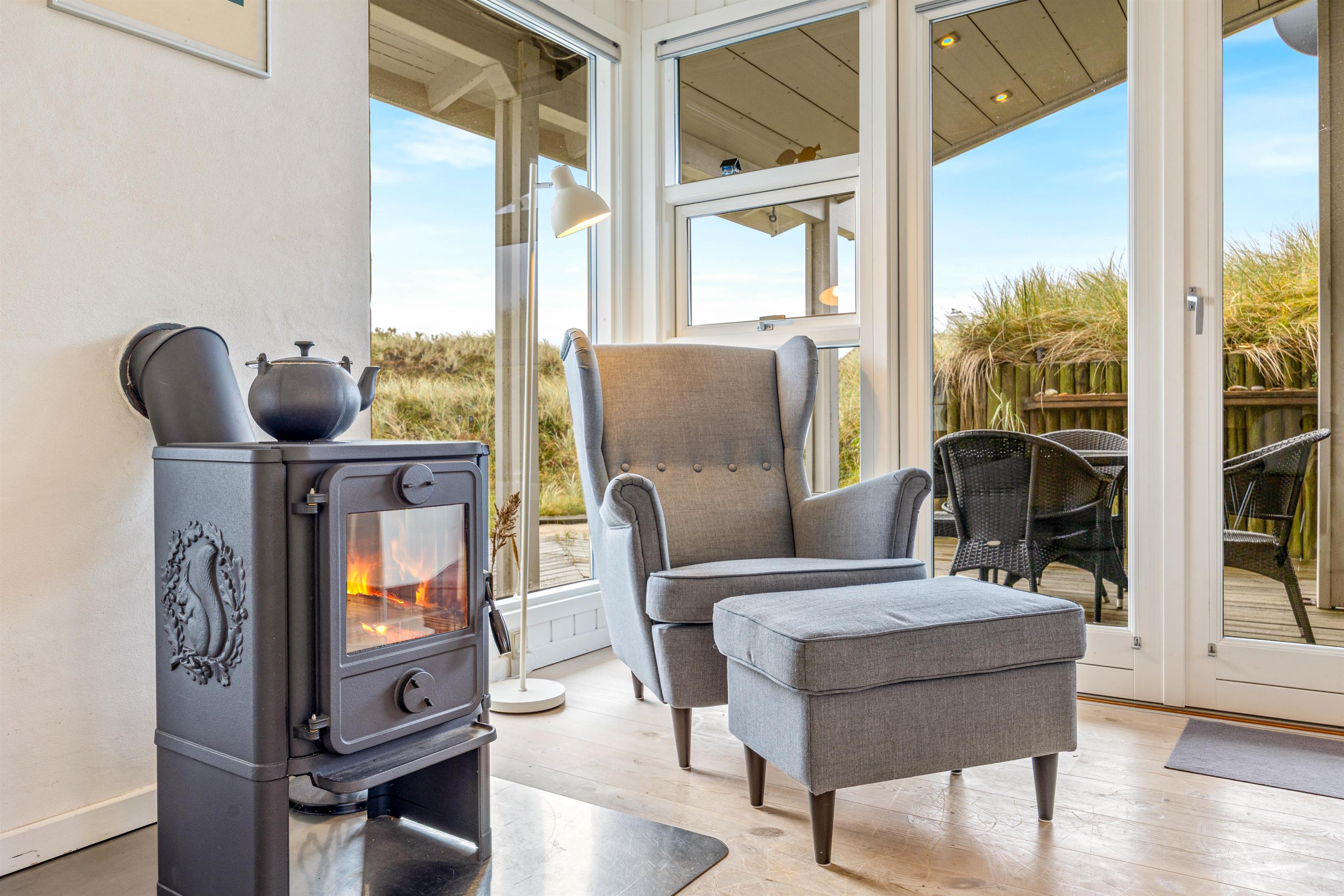 I opholdsrummet ligger stuen i åben forbindelse med det veludstyrede køkken, og der vil med garanti blive brugt mange hyggelige feriestunder på sofaen foran den knitrende brændeovn og rundt om spisebordet, hvor morgendagens planer bliver lagt over en god feriemiddag. Fordi at både køkken, spisestue og sofastuen er samlet et sted, er det muligt for jer at tilbringe masser af kvalitetstid med jeres medrejsende.