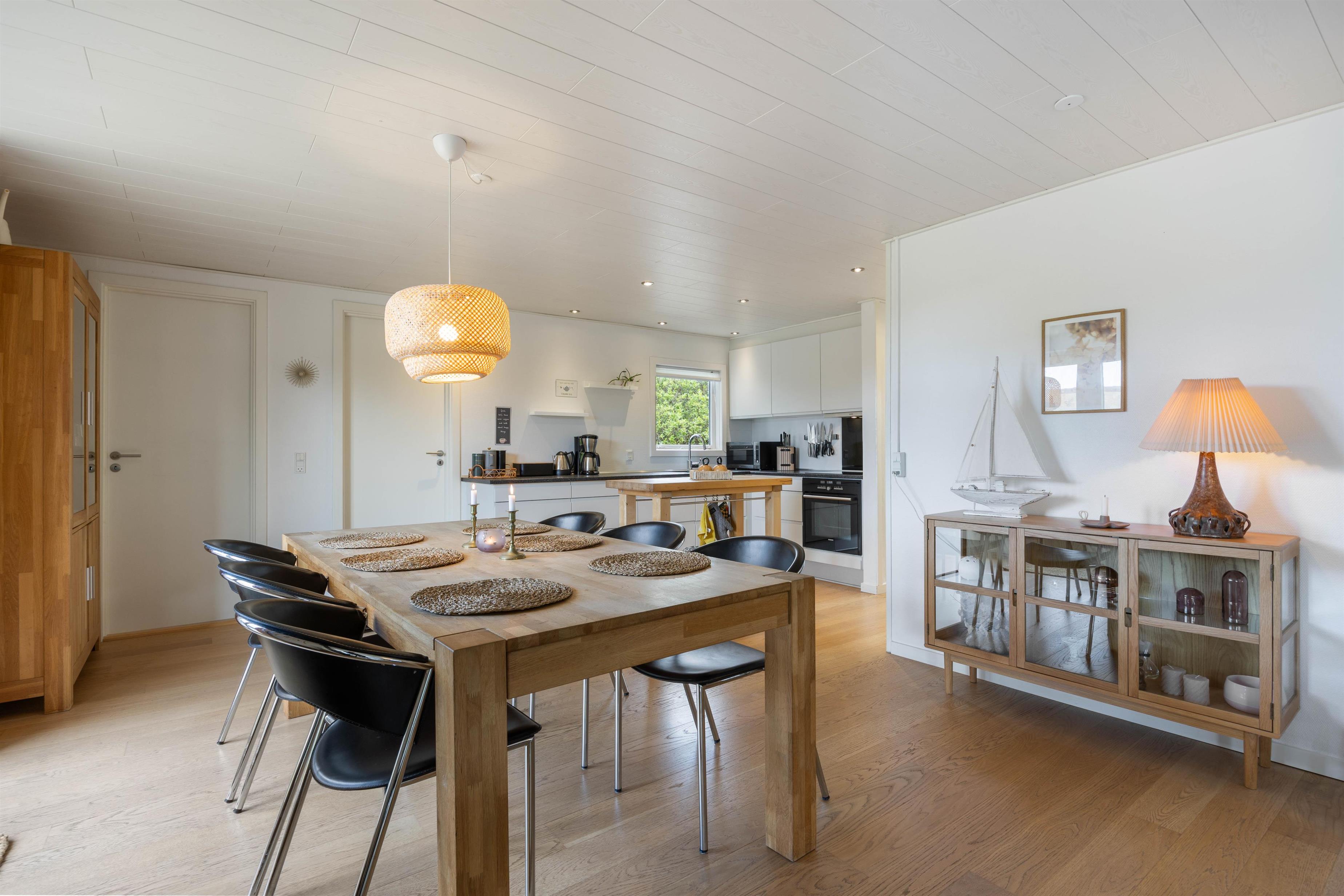 Det klassiske træhus i Houvig er indrettet i en lys og indbydende stil, som gør, at I straks vil føle jer godt tilpas i jeres nye hjem for ferien. Sommerhusets hjerte er det åbne opholdsrum, hvor køkken, spiseafdeling og stue er kombineret til ét stort fællesrum – med brændeovnen i centrum, så feriestemningen altid er helt i top.