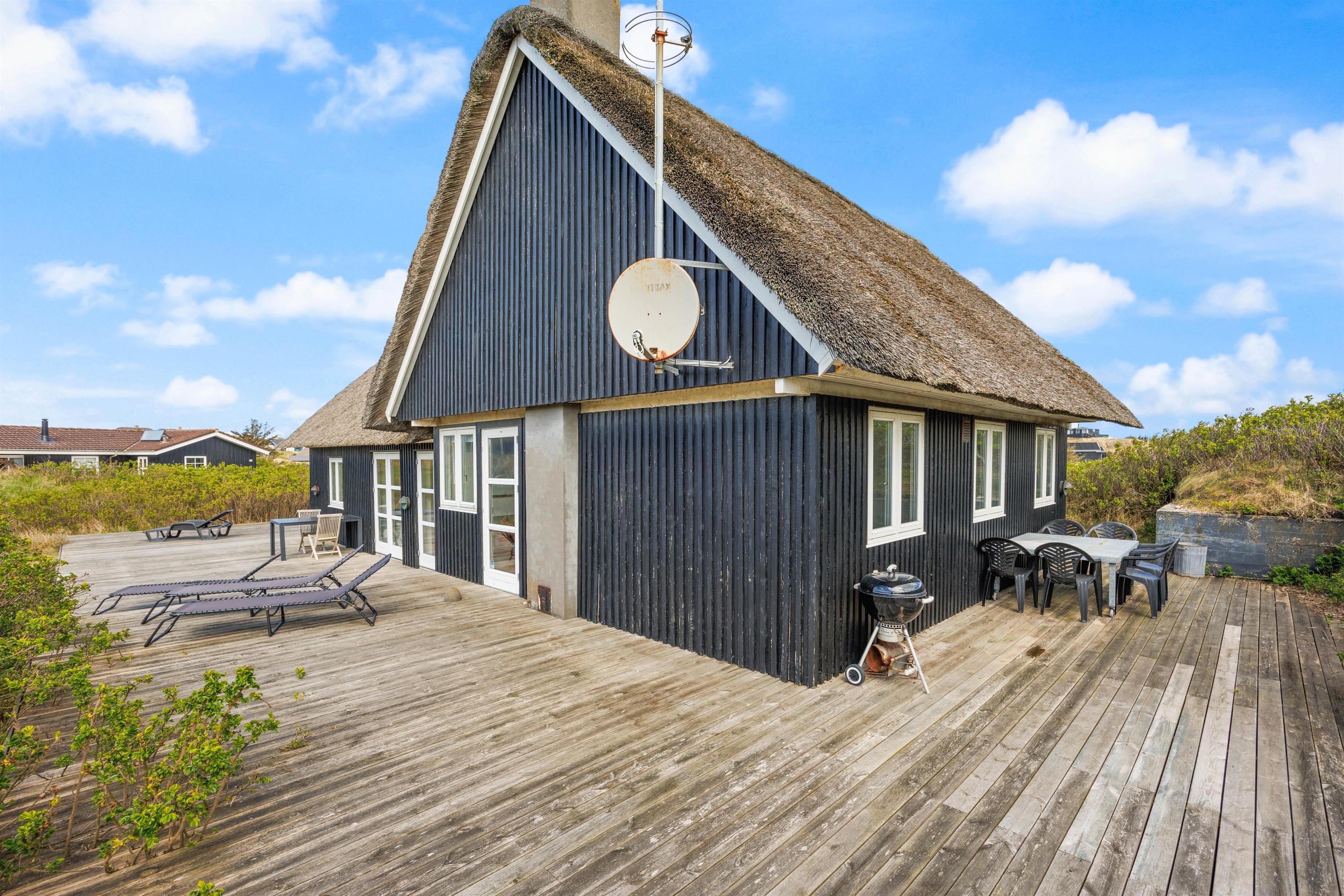 Omkring sommerhuset har I en stor, åben træterrasse, som I kan bevæge jer ud på, når ferievejret er helt i top. Her kan I finde jer en god plads i solen, hvor I kan læne jer tilbage i liggestole og havemøbler og bare slappe af.