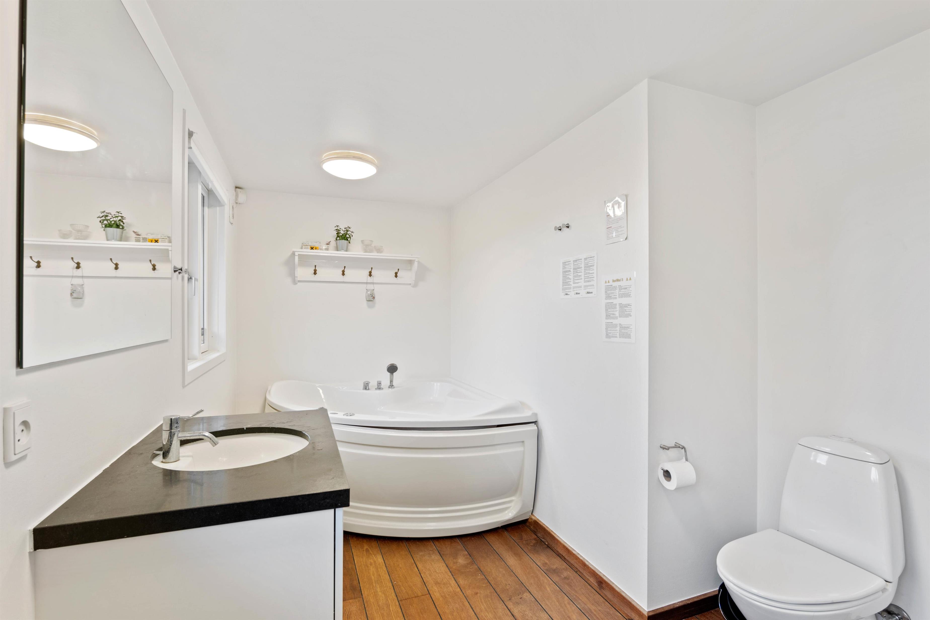 På sommerhusets badeværelse kan I se frem til at nyde masser af afslapning i løbet af ferien. Her venter jer nemlig en skøn spa, hvor I kan komme helt ned i gear i det varme og boblende vand.