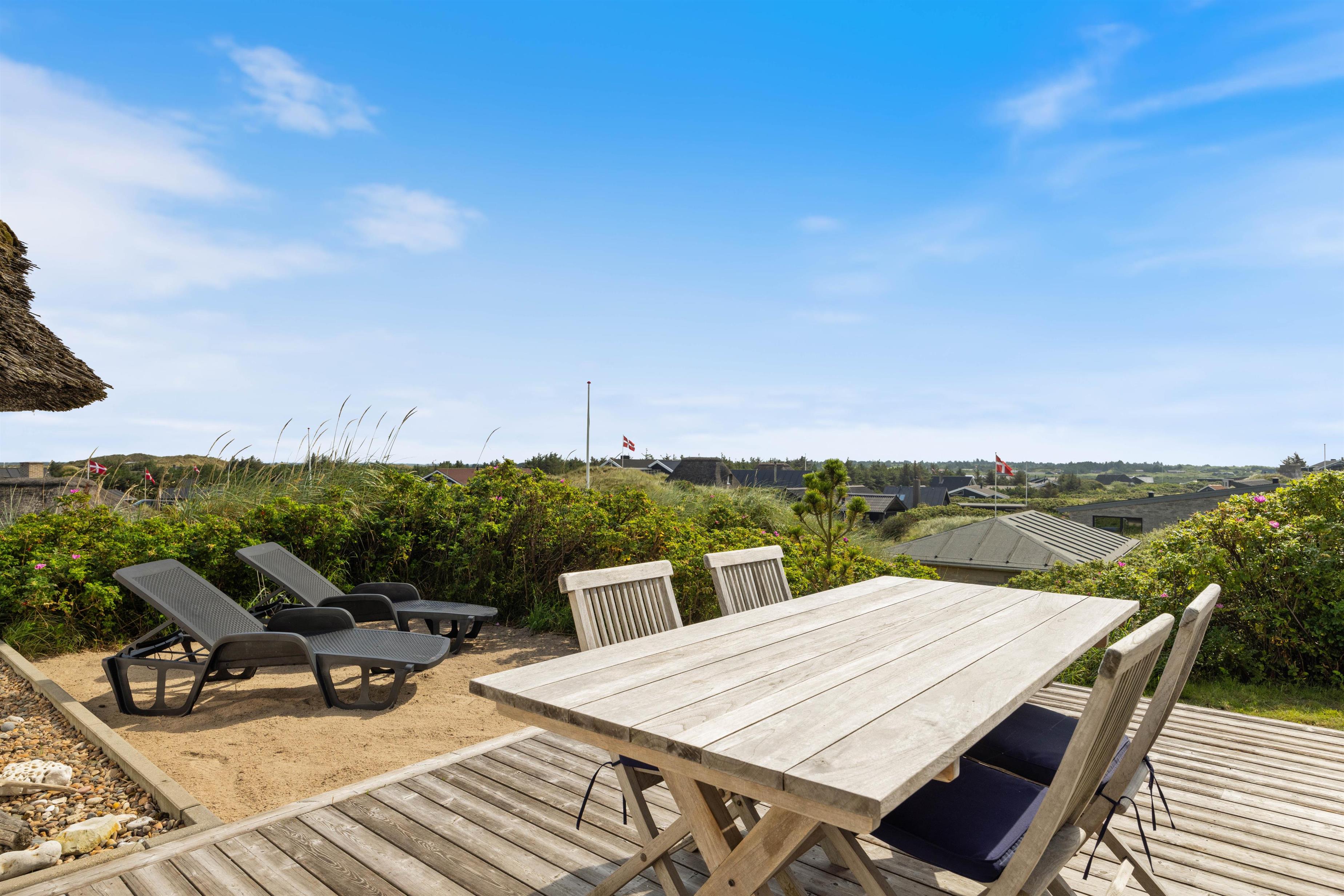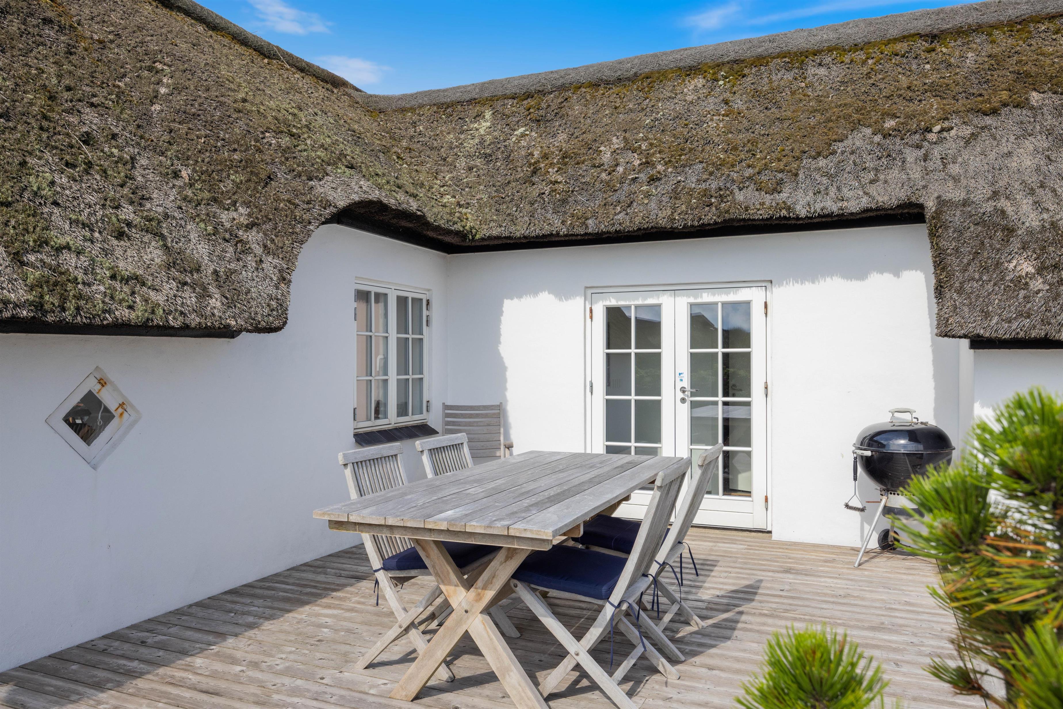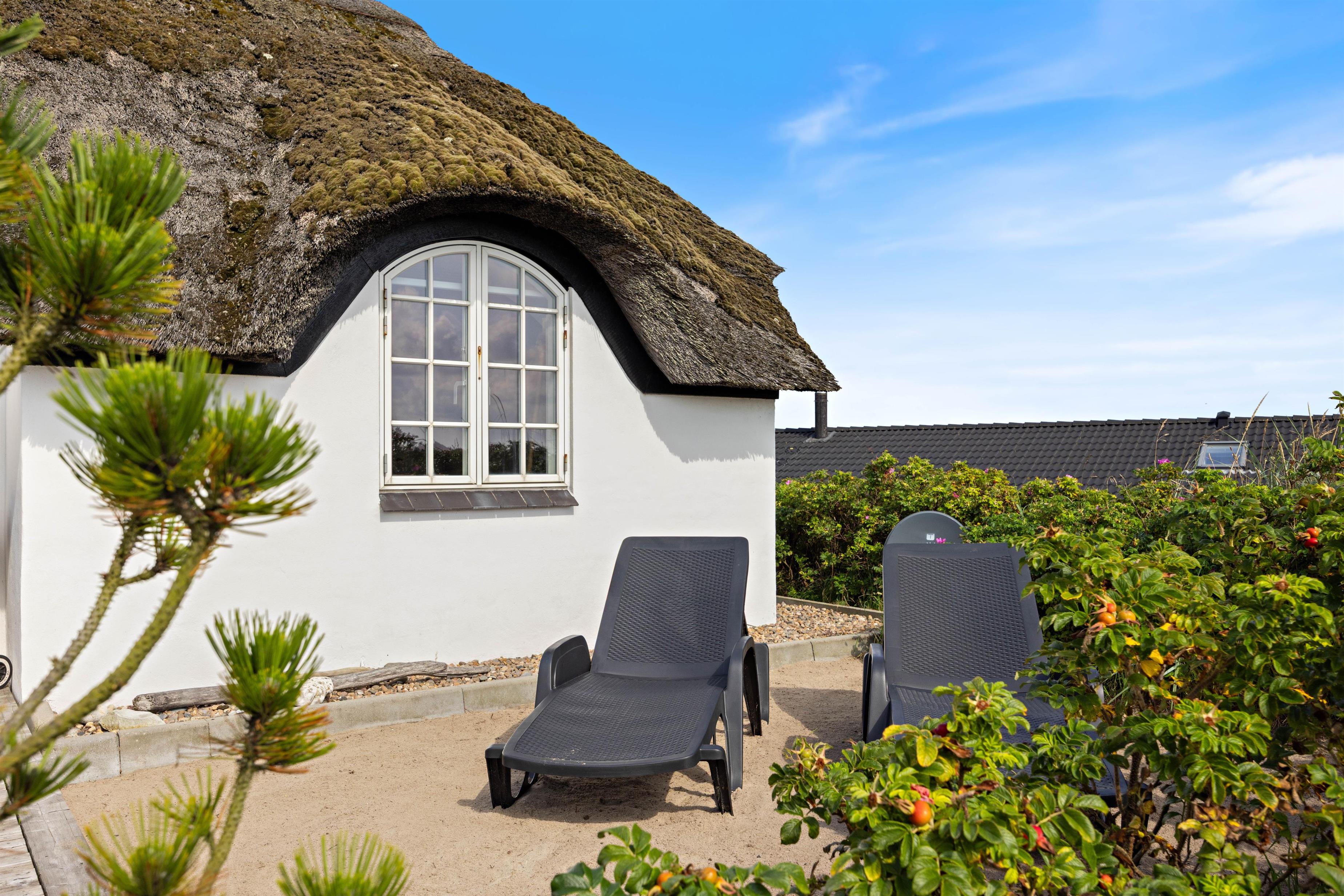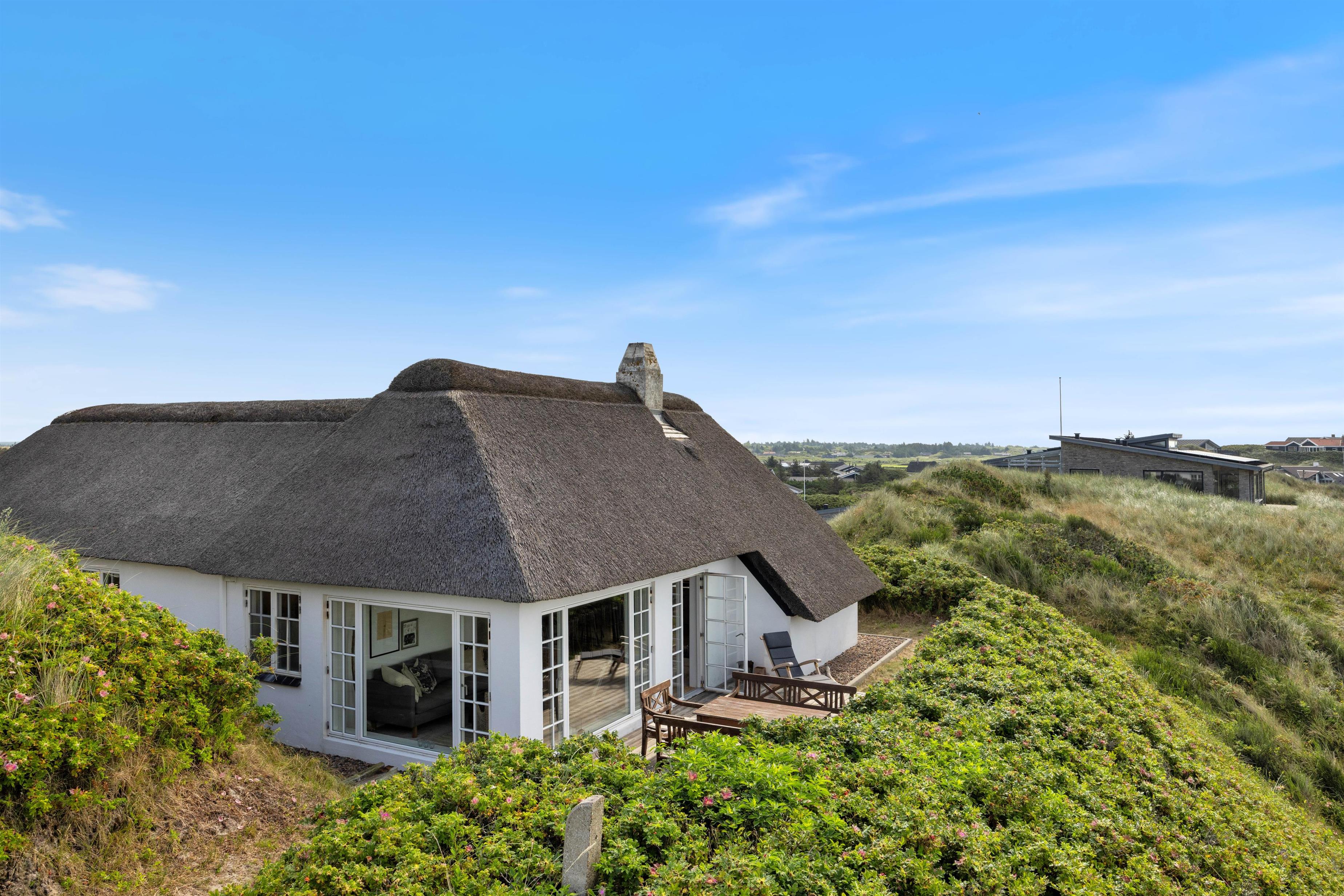 Udenfor på den afskærmet terrasse, har I et dejligt og fantastisk panoramaudsigt over klitterne i området og der er selvfølgelig sørget for havemøbler til at slænge jer i. Der er også en grill, som kan hjælpe med at tilberede en fantastisk grillmiddag på de dejlige sommeraftenener. Tæt på sommerhuset er der en garage, som I må parkere i.