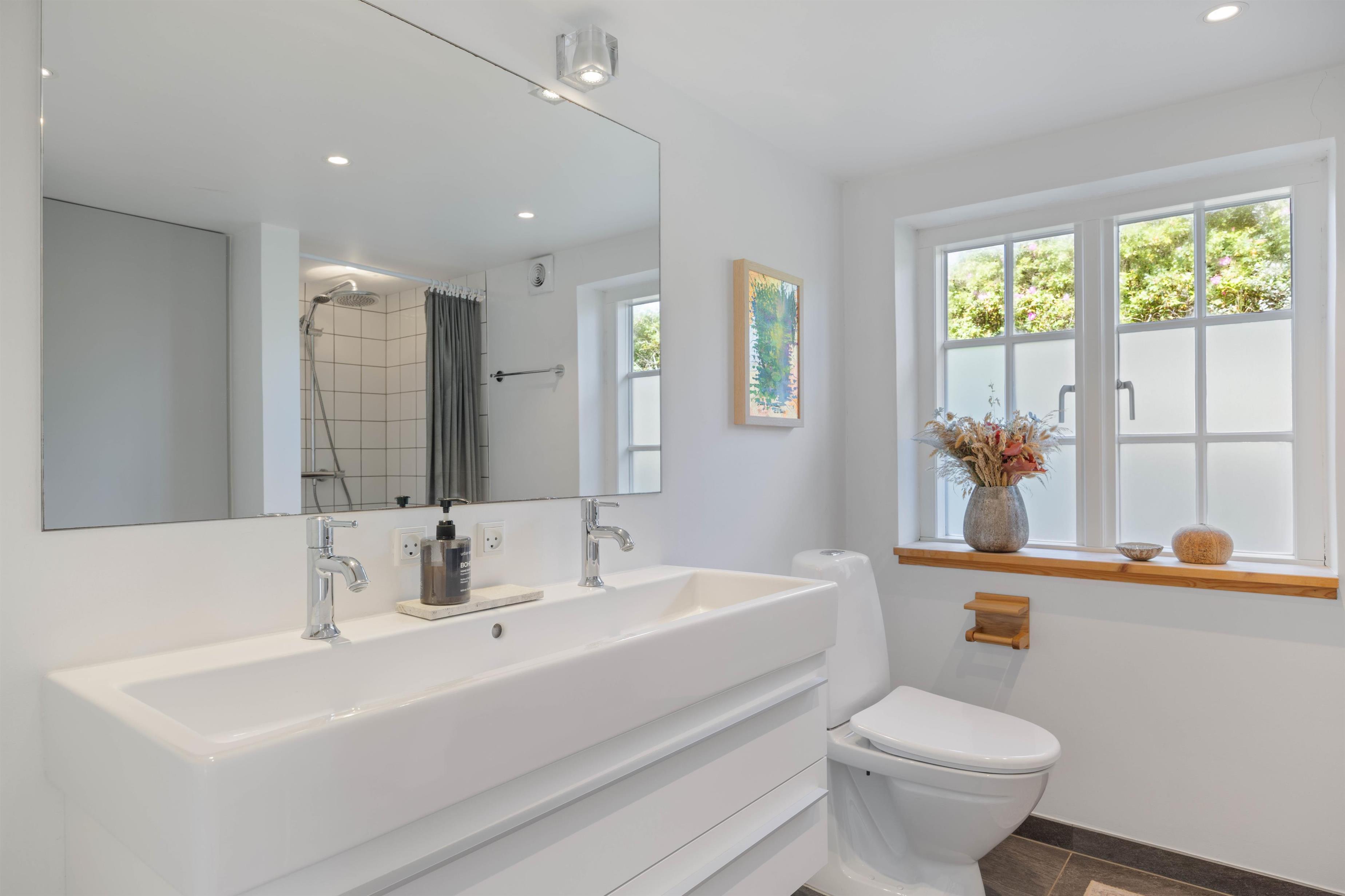 Det fine badeværelse er udstyret med gulvvarme. Derudover finder I også en vaskemaskine og tørretumbler, som I frit kan benytte.
