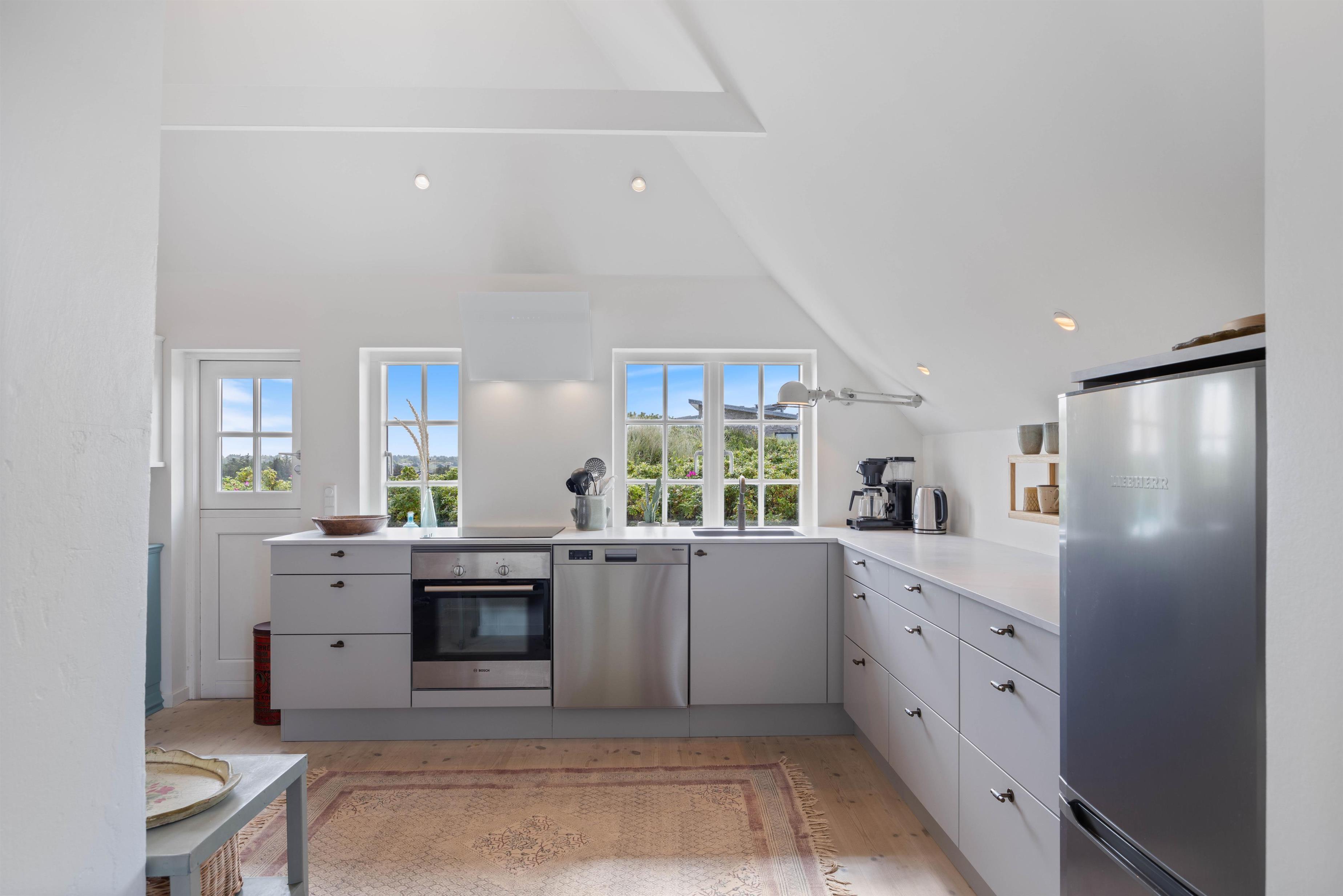 Det moderne køkken er fuldt udstyret med alle de bekvemmeligheder, der er brug for. Her finder I en opvaskemaskine, som klarer opvasken for jer. Der er desuden en energibesparende varmepumpe, som sørger for et behageligt indeklima.