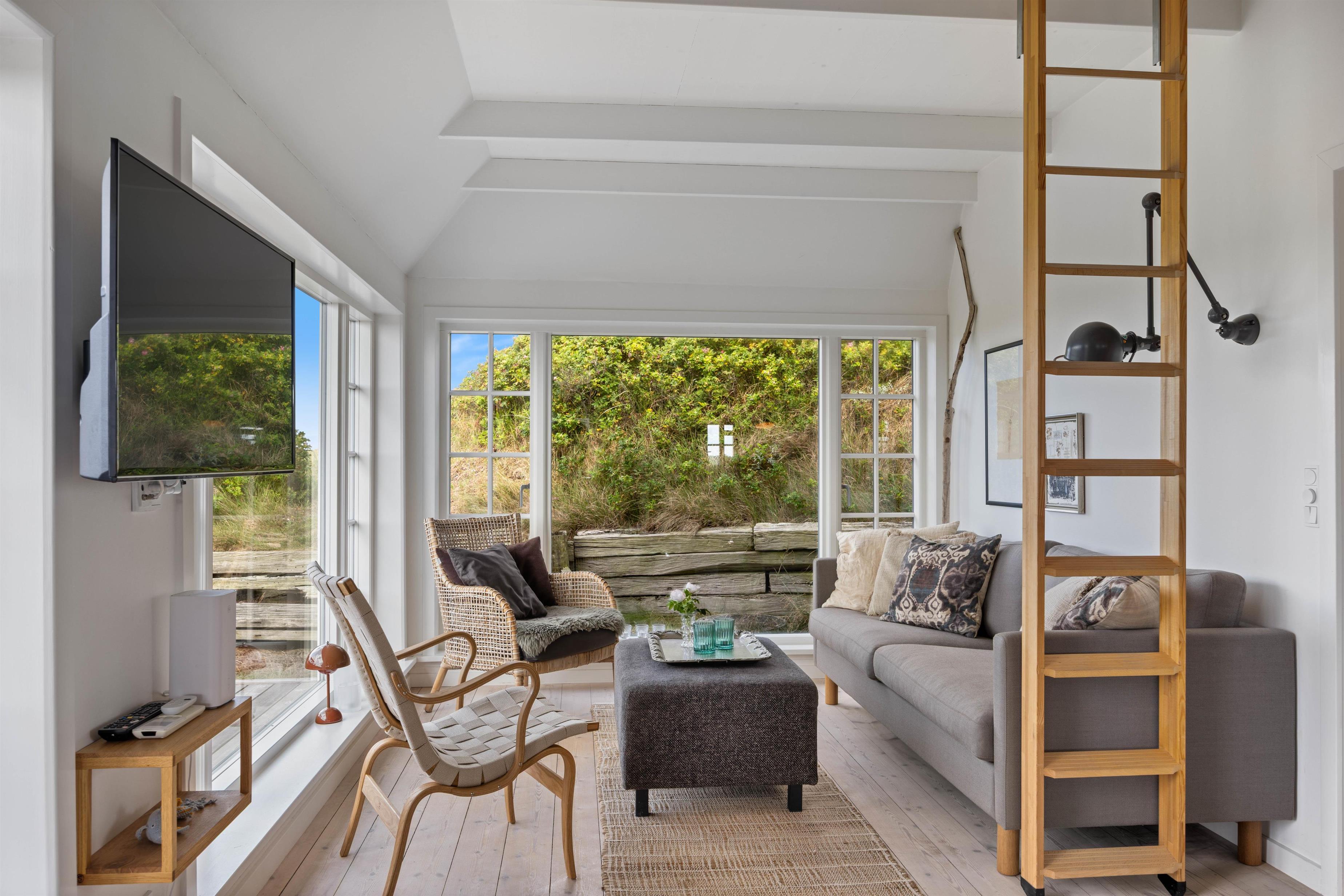 Fra stuens store vinduespartier er der faktisk kig over Vesterhavet. Brændeovnen sørger for en behagelig varme og en hyggelig atmosfære på de køligere aftner. Her kan I slappe af sammen eller sætte jer godt til rette og nyde en spændende film. For at sikre den hjemlige følelse, er sommerhuset også udstyret med en chromecast i stuen, der tillader jer at se lige netop det I vil, når det passer jer. Her kan I nemlig streame jeres yndlings film og serier, hvis I har nogle streamingstjenester. Mere hjemligt bliver det altså ikke.