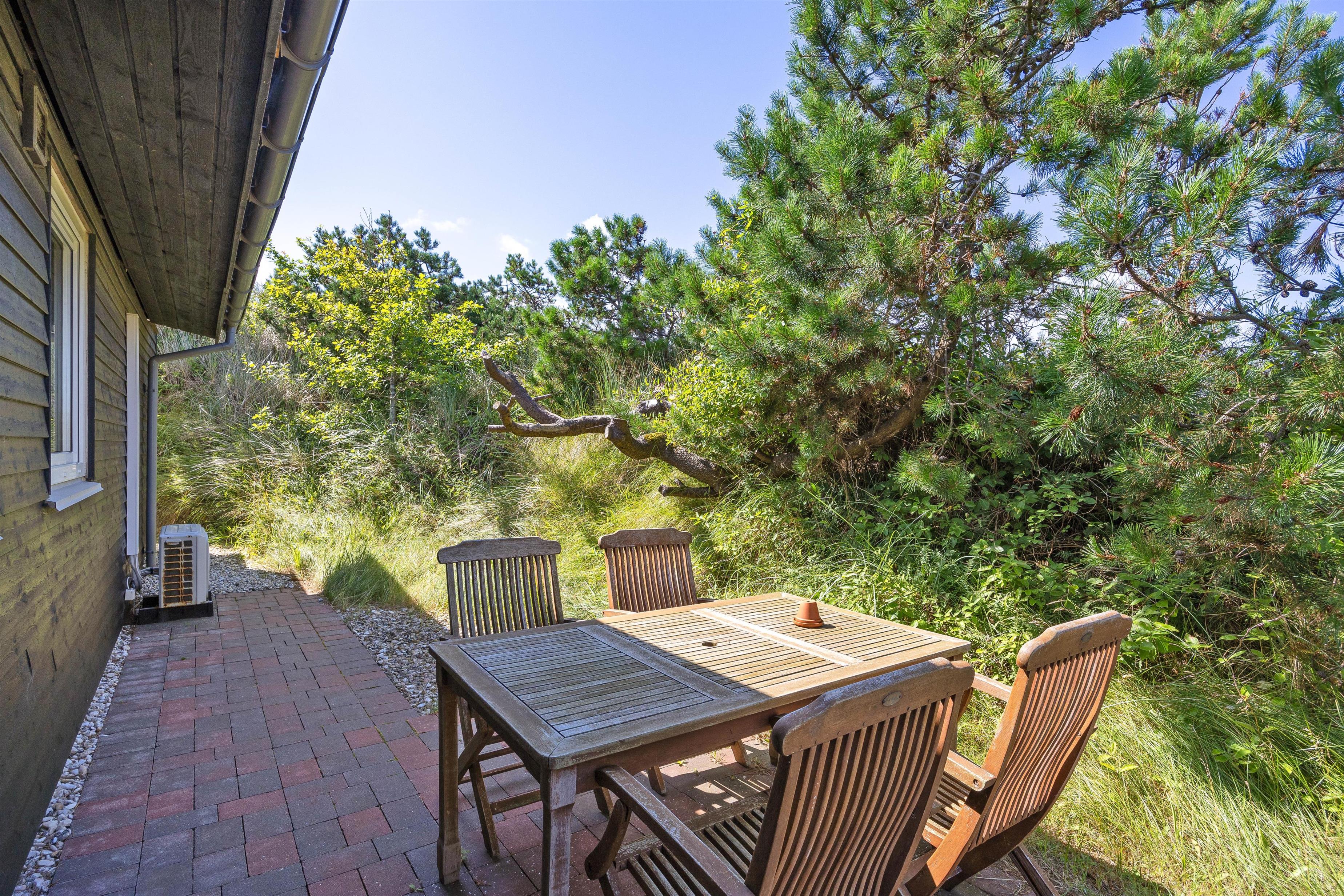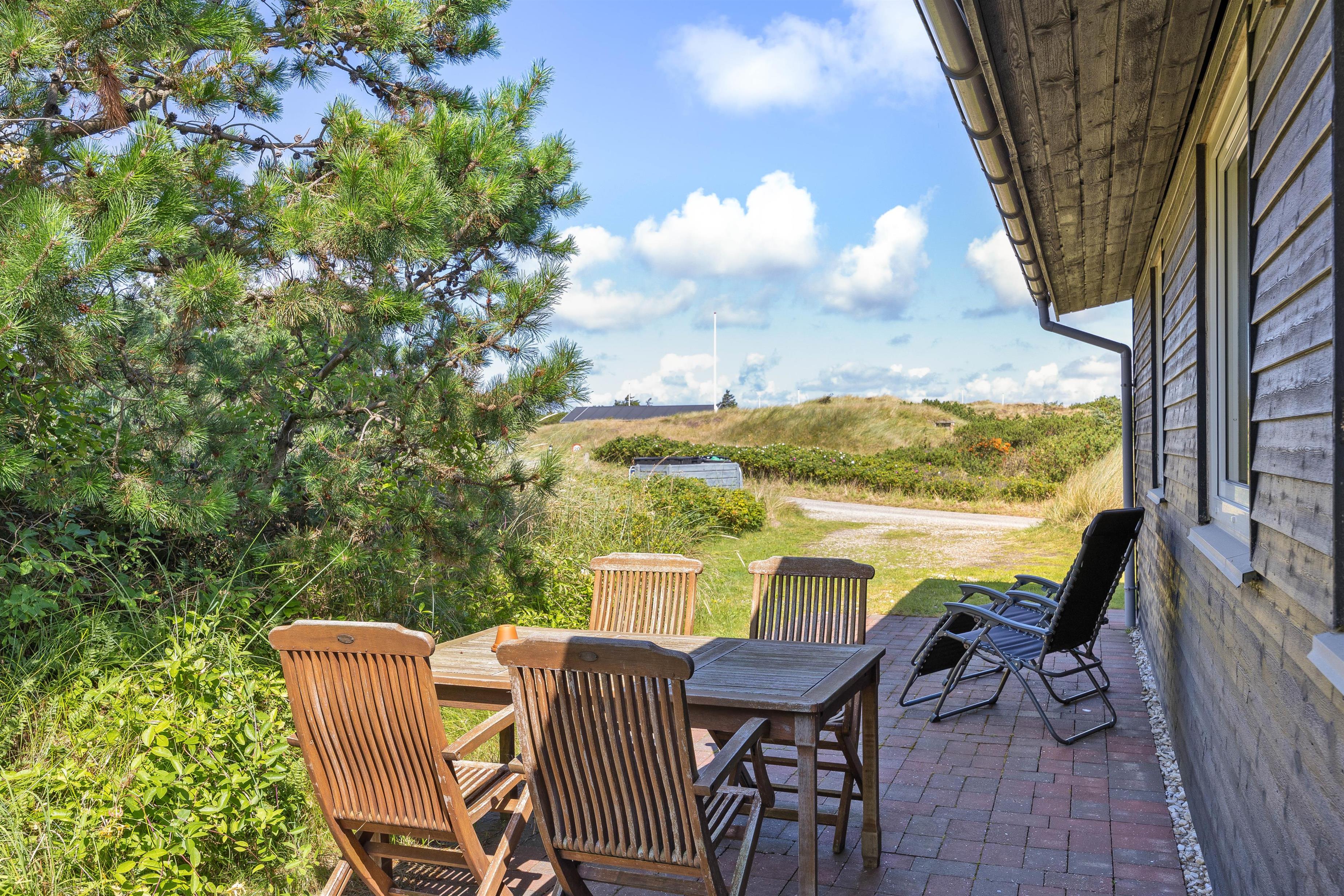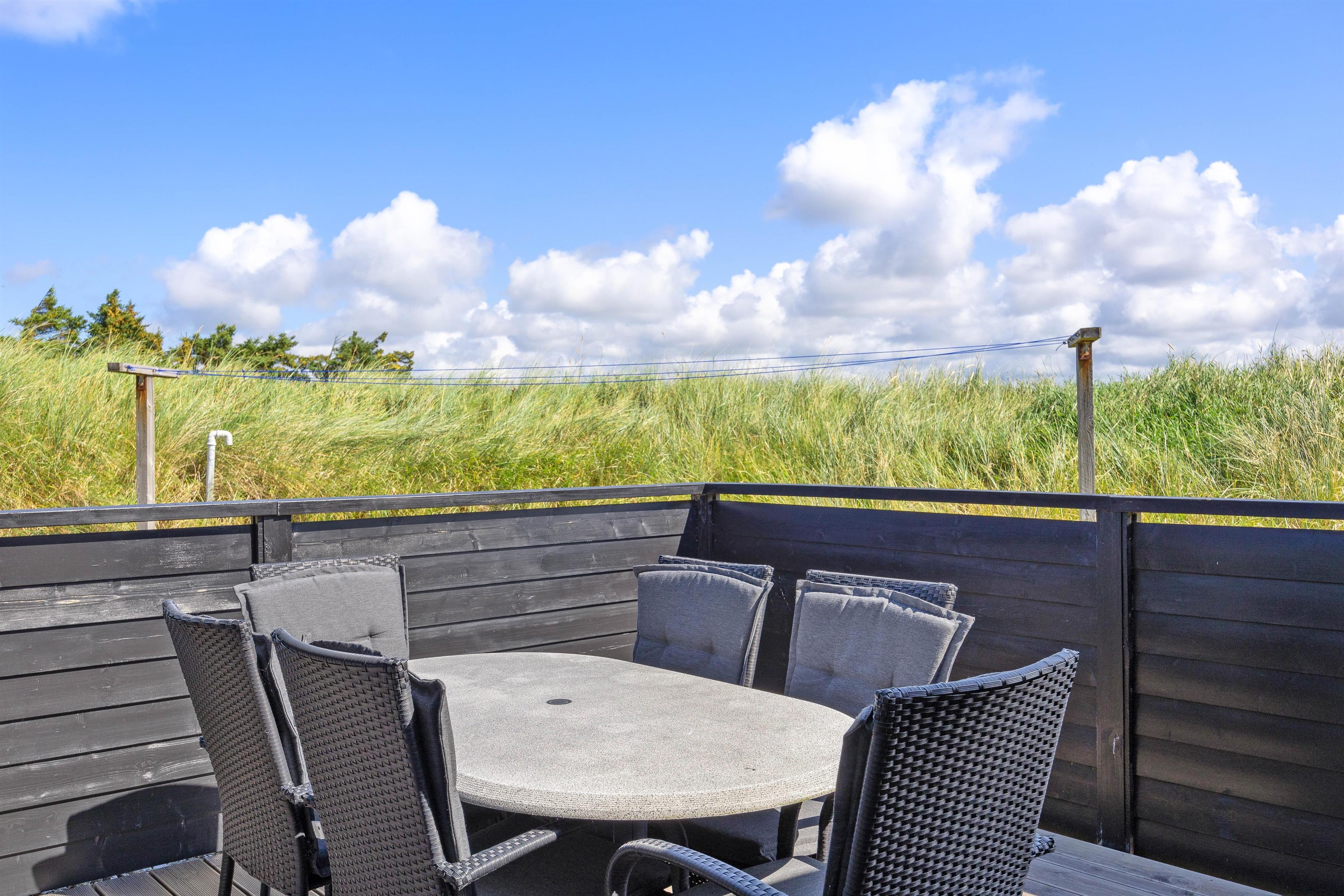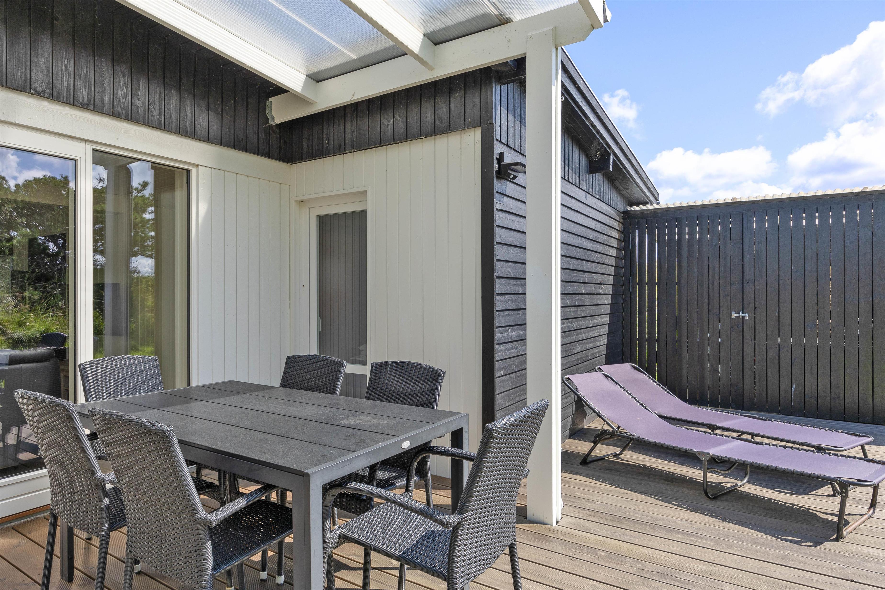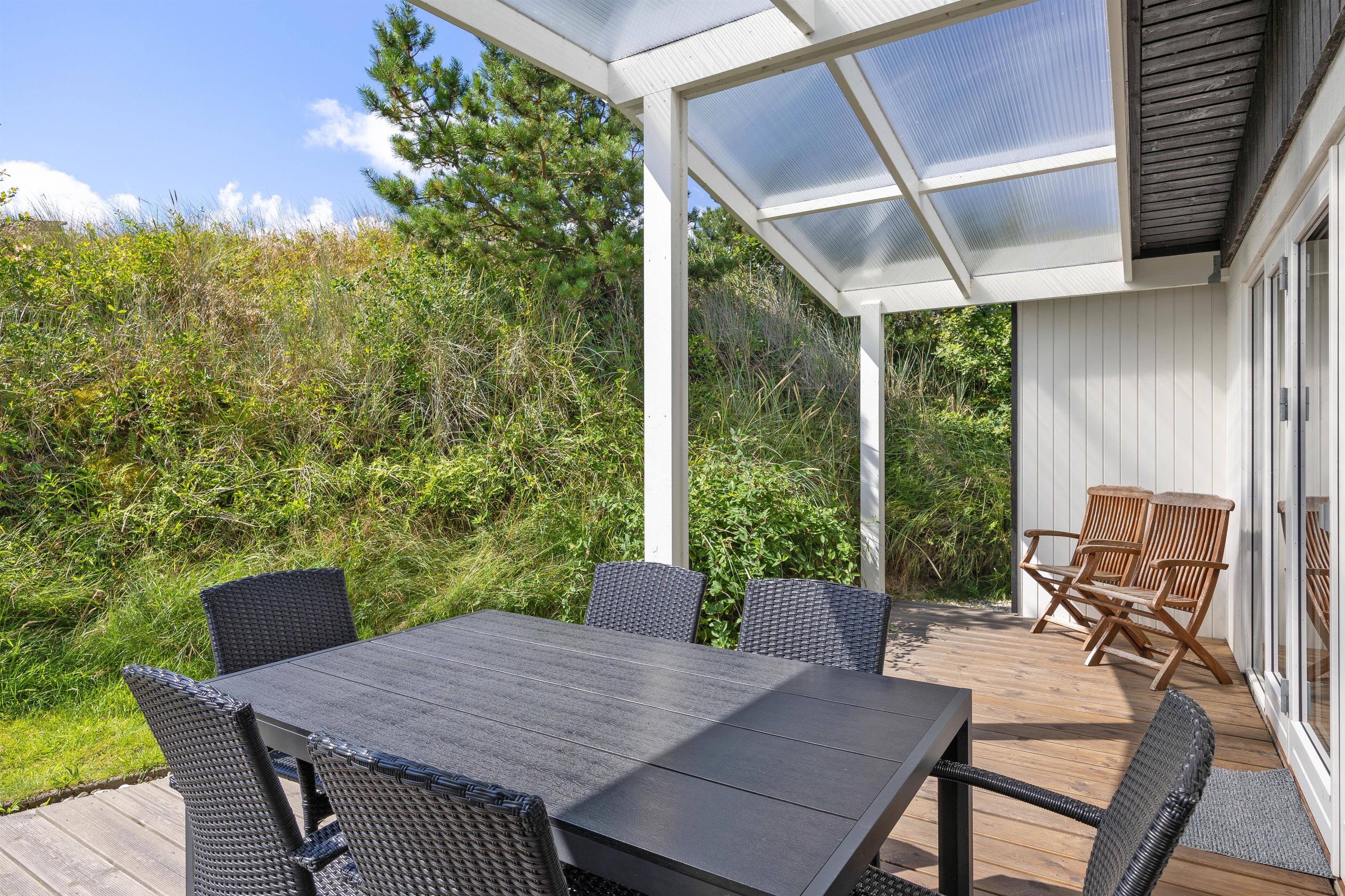 Fra stuen er der direkte adgang til den skønne overdækkede terrasse, hvor I kan nyde den friske og rolige natur helt tæt på - og alt efter vind og vejr, har I mulighed for at søge om på den læfyldte terrasse der vender mod syd, som også egner sig perfekt til morgenkaffen. Her kan I nyde masser af privatliv, da den klitten ved siden af sørger for masser af læ privatliv. Dele af terrassen er overdækket, så I kan nyde udelivet og den friske luft selv hvis det drypper lidt. Der