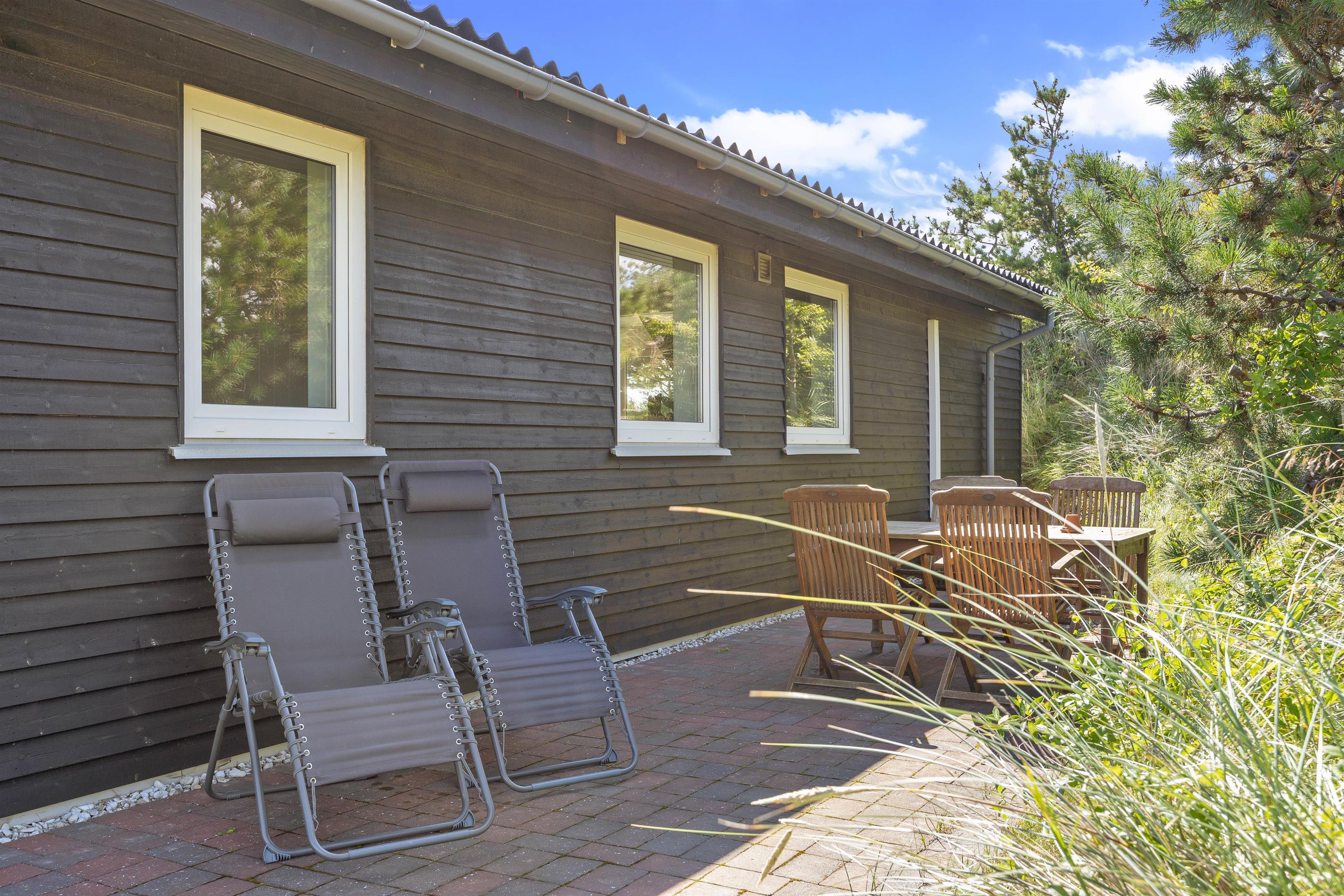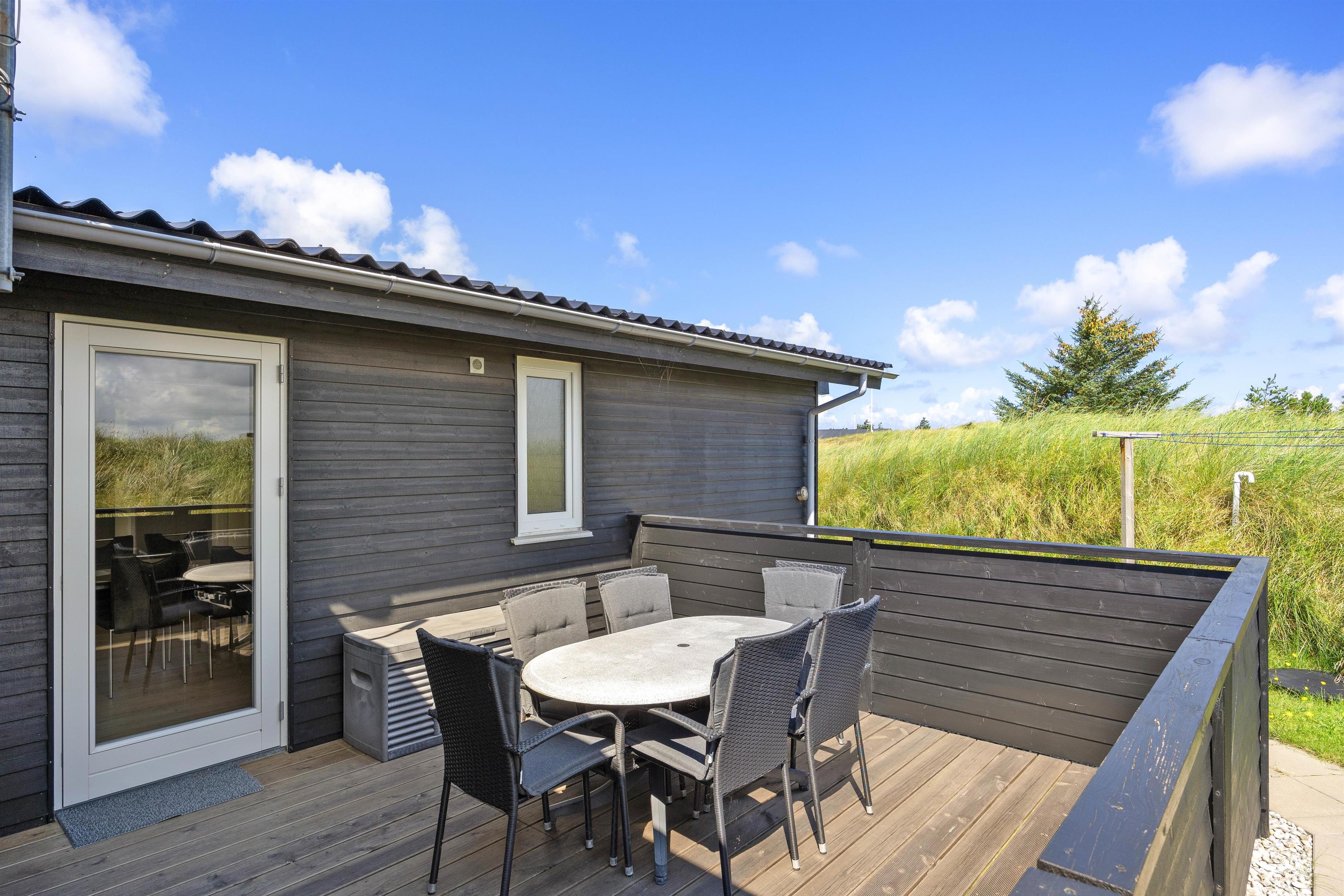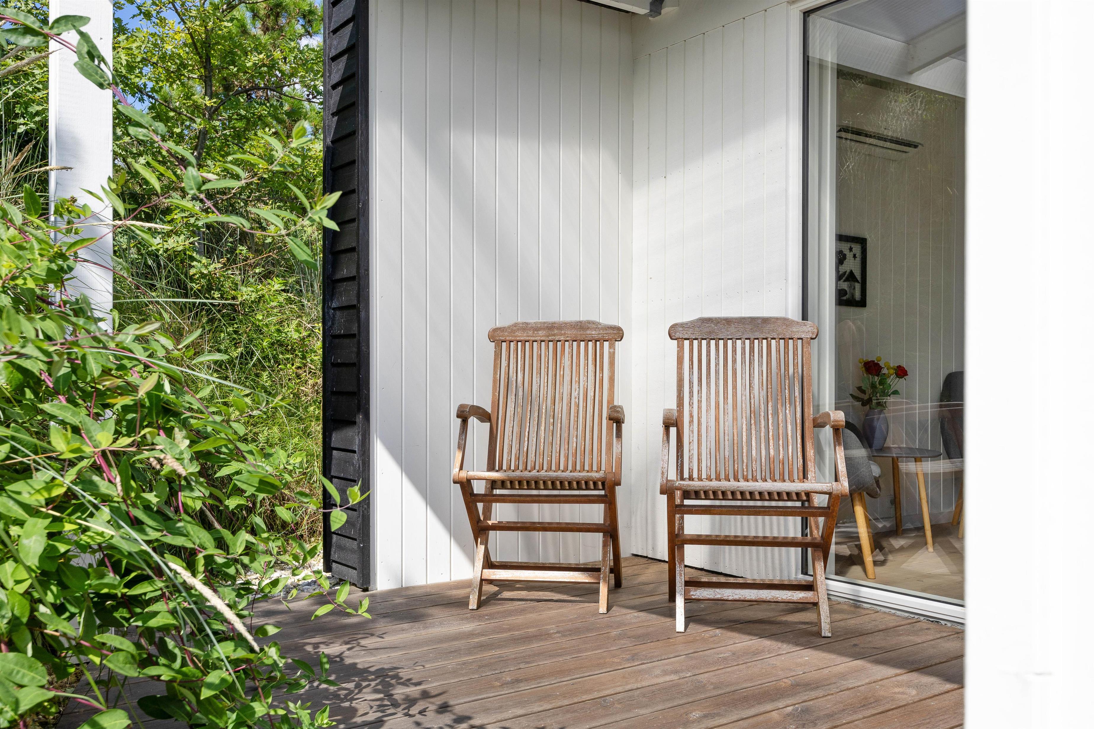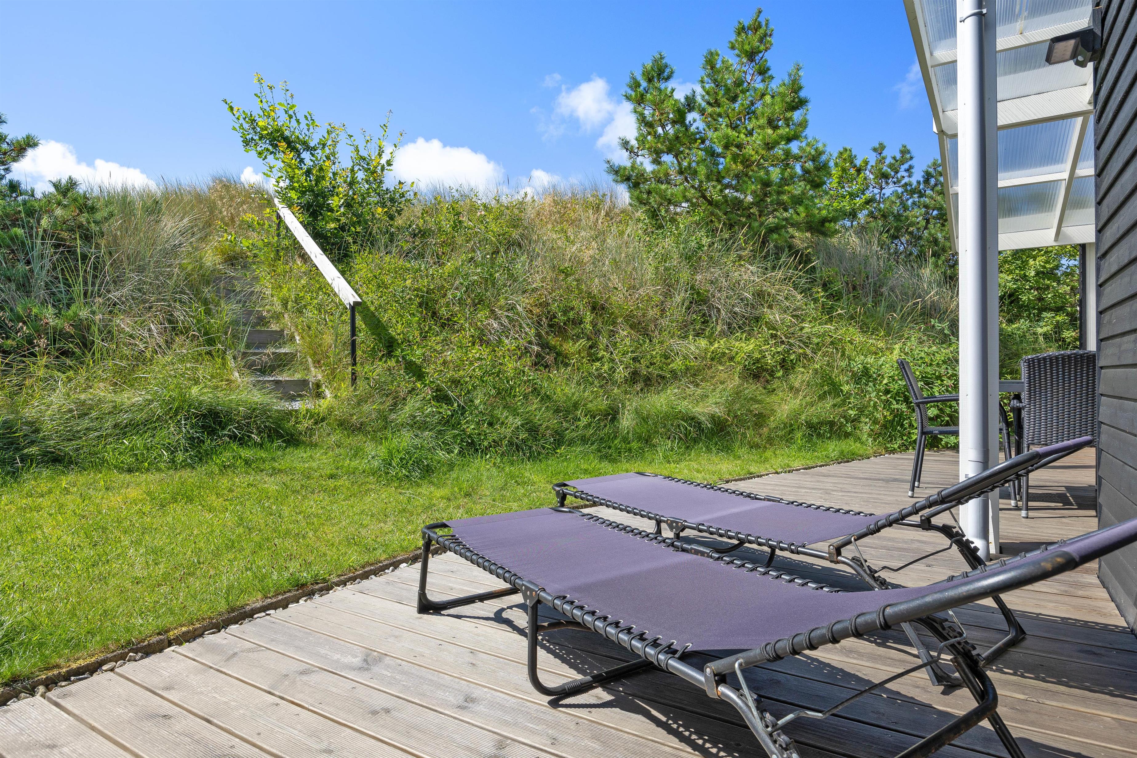 Fra stuen er der direkte adgang til den skønne overdækkede terrasse, hvor I kan nyde den friske og rolige natur helt tæt på - og alt efter vind og vejr, har I mulighed for at søge om på den læfyldte terrasse der vender mod syd, som også egner sig perfekt til morgenkaffen. Her kan I nyde masser af privatliv, da den klitten ved siden af sørger for masser af læ privatliv. Dele af terrassen er overdækket, så I kan nyde udelivet og den friske luft selv hvis det drypper lidt. Der