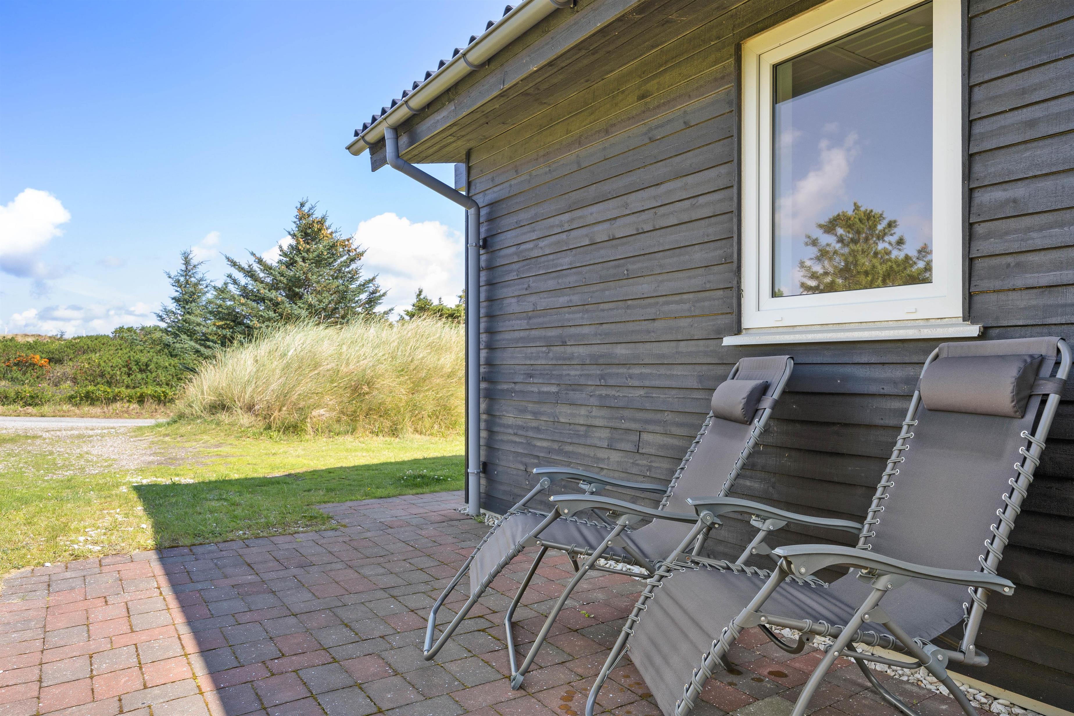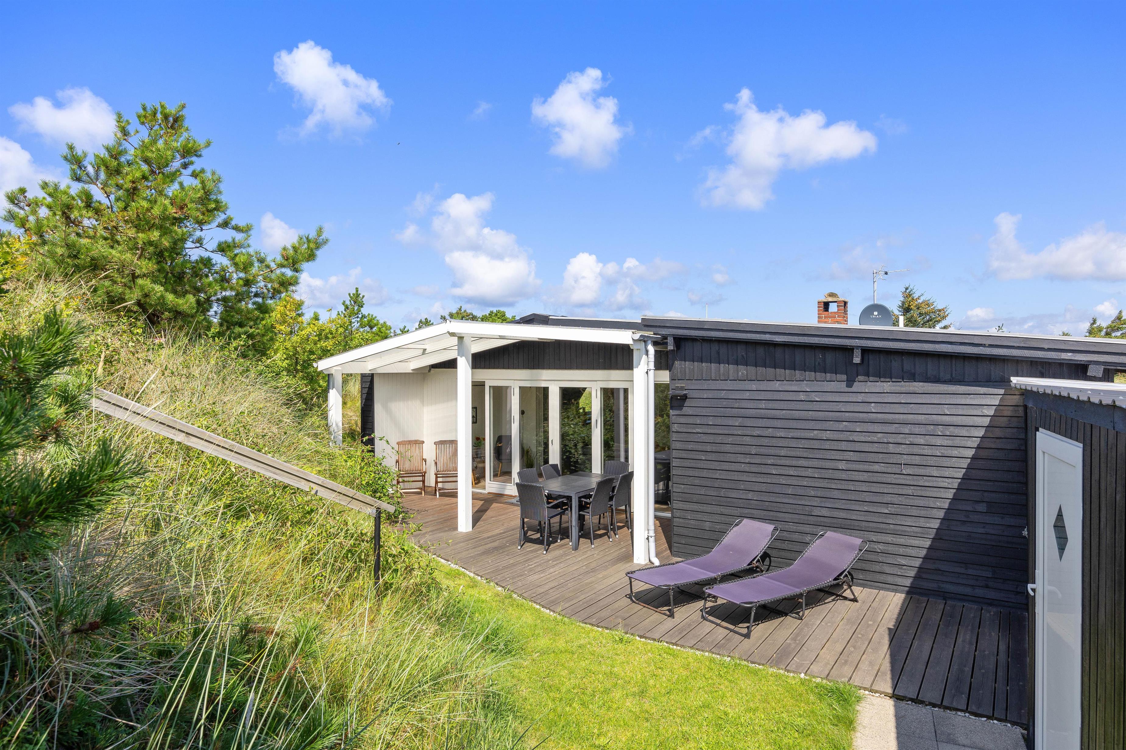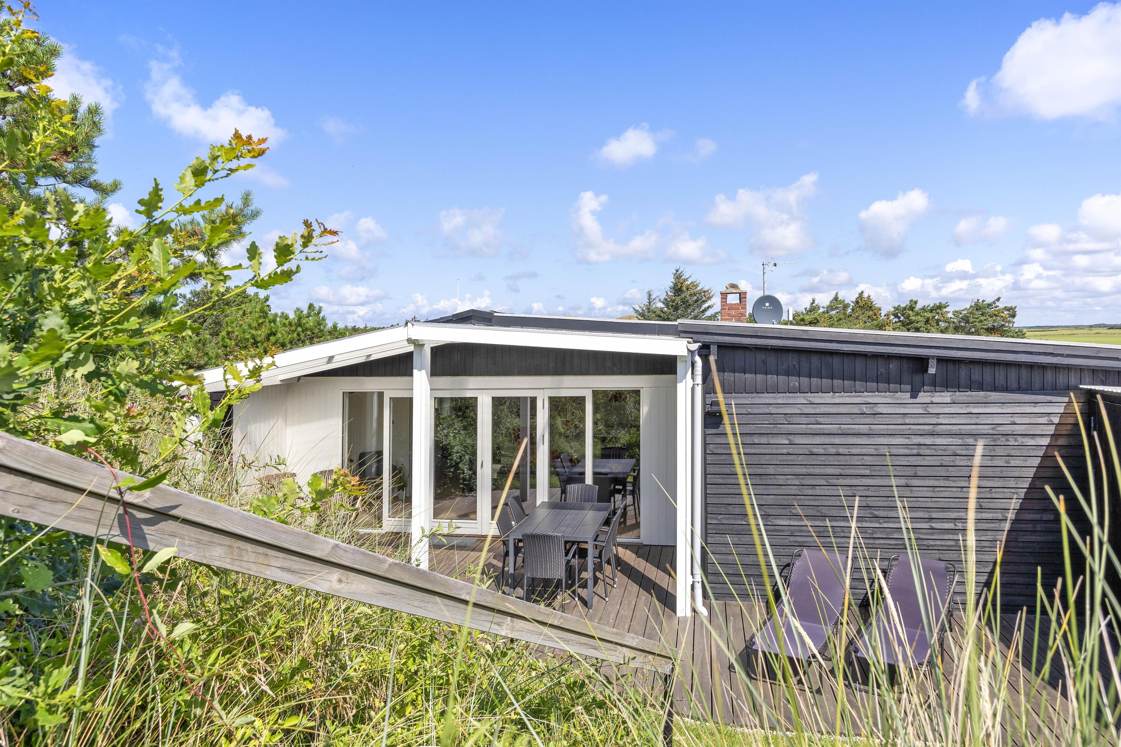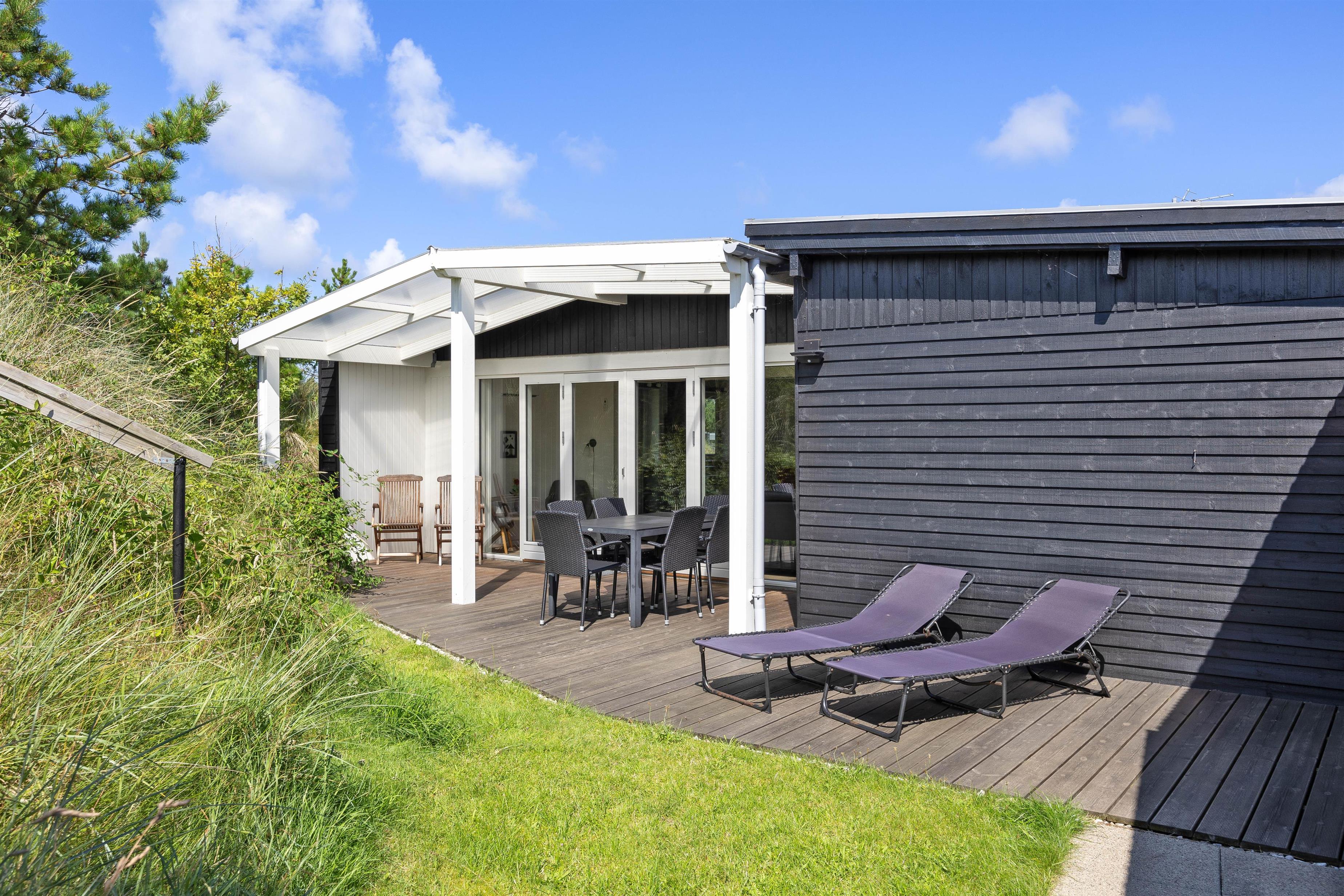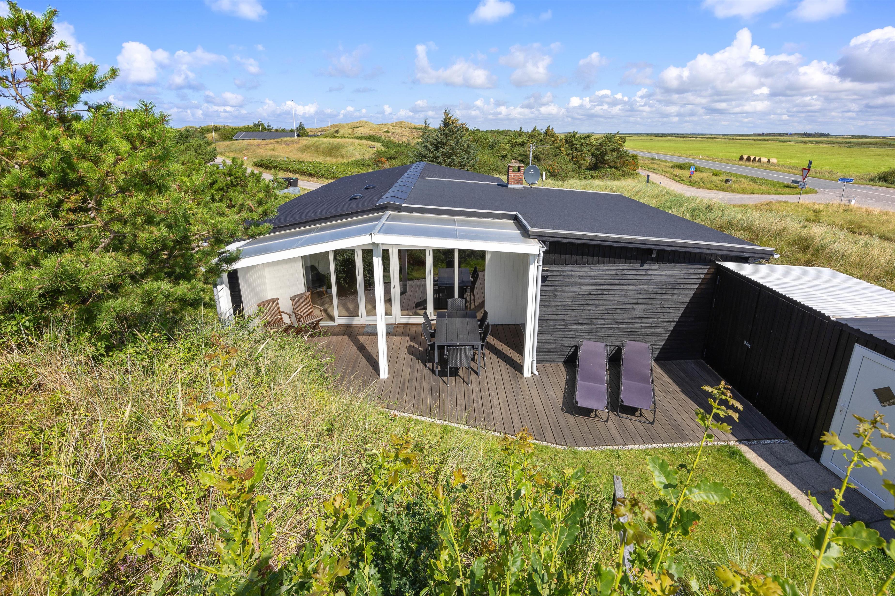 Fra stuen er der direkte adgang til den skønne overdækkede terrasse, hvor I kan nyde den friske og rolige natur helt tæt på - og alt efter vind og vejr, har I mulighed for at søge om på den læfyldte terrasse der vender mod syd, som også egner sig perfekt til morgenkaffen. Her kan I nyde masser af privatliv, da den klitten ved siden af sørger for masser af læ privatliv. Dele af terrassen er overdækket, så I kan nyde udelivet og den friske luft selv hvis det drypper lidt. Der
