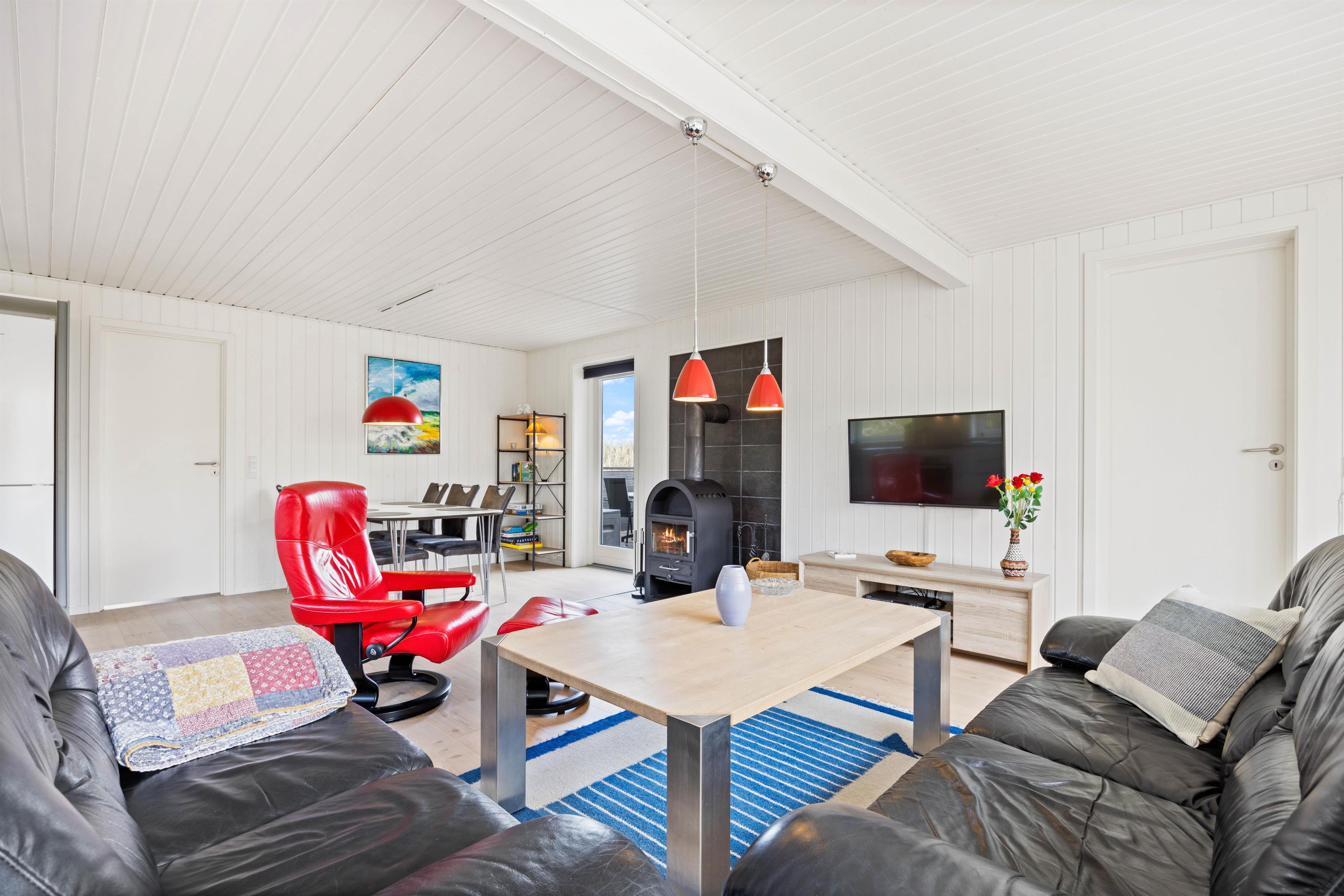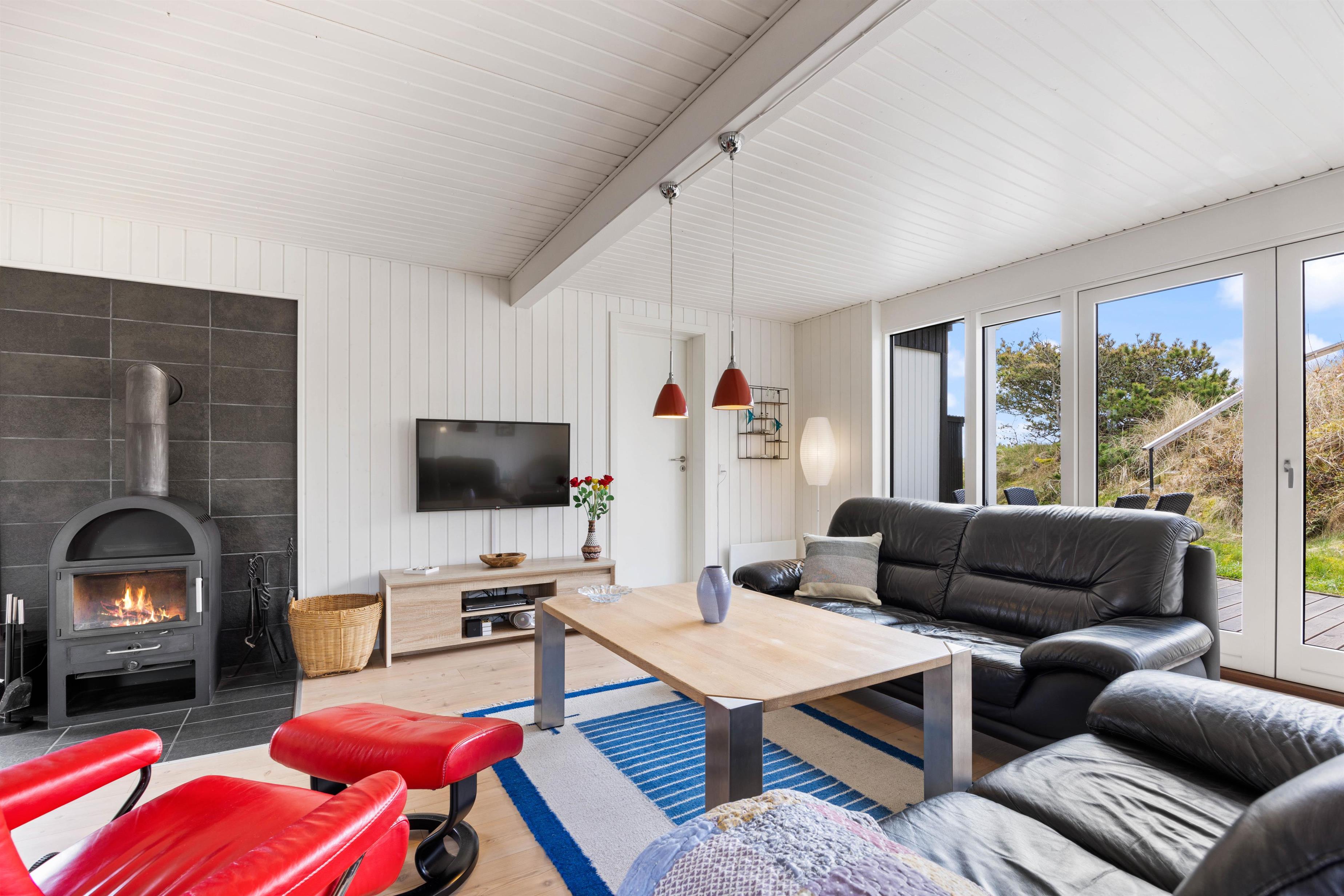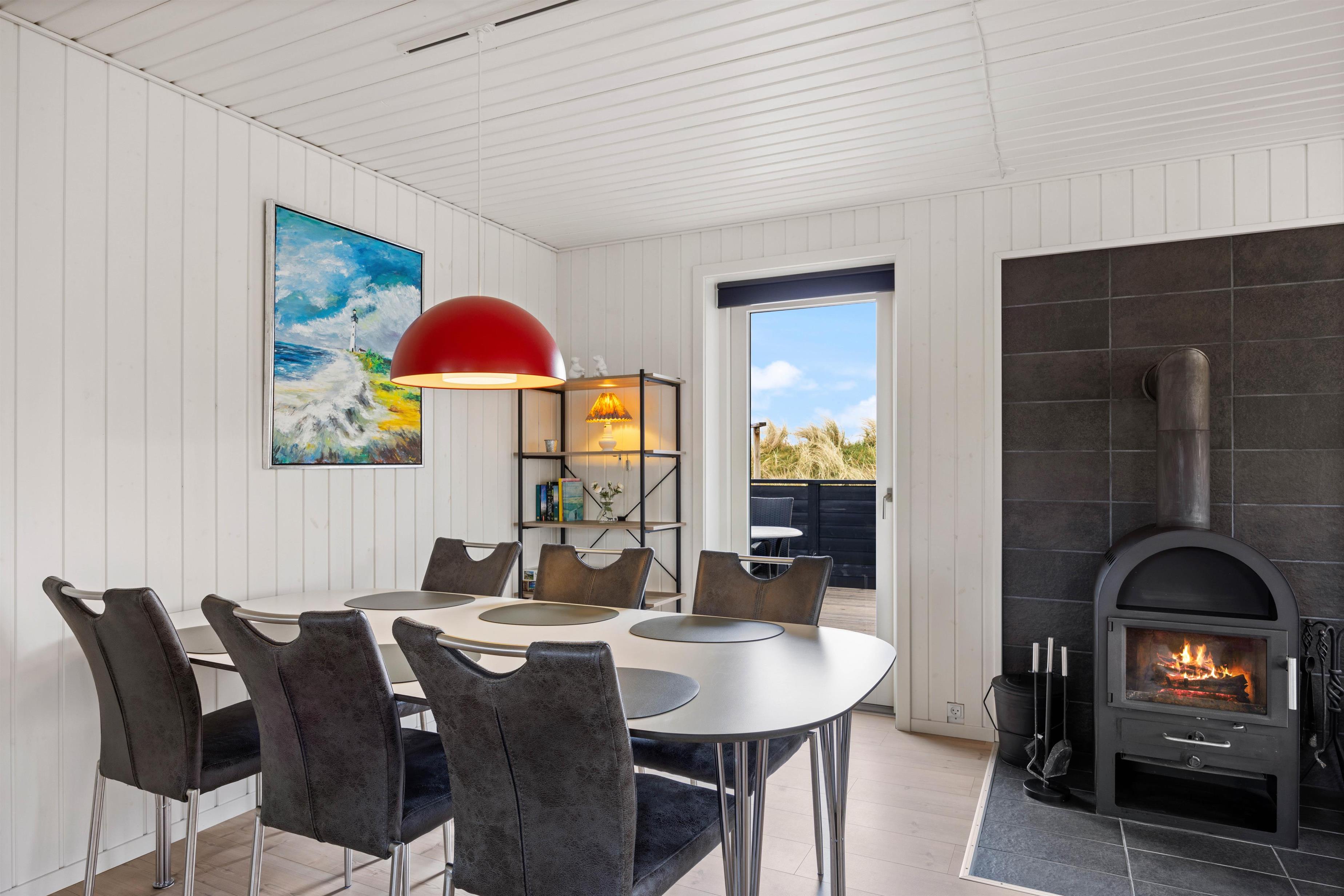 I den ene ende af stuen, er brændeovnen med til at skabe den helt perfekte stemning. Imens I slænger jer i sofaen og kigger på gløderne i brændeovnen med et godt glas vin i hånden, kan de store børn sidde og spille spil ved bordet. Desuden er der i huset installeret en energibesparende varmepumpe, der kan bidrage til et lavere strømforbrug.
