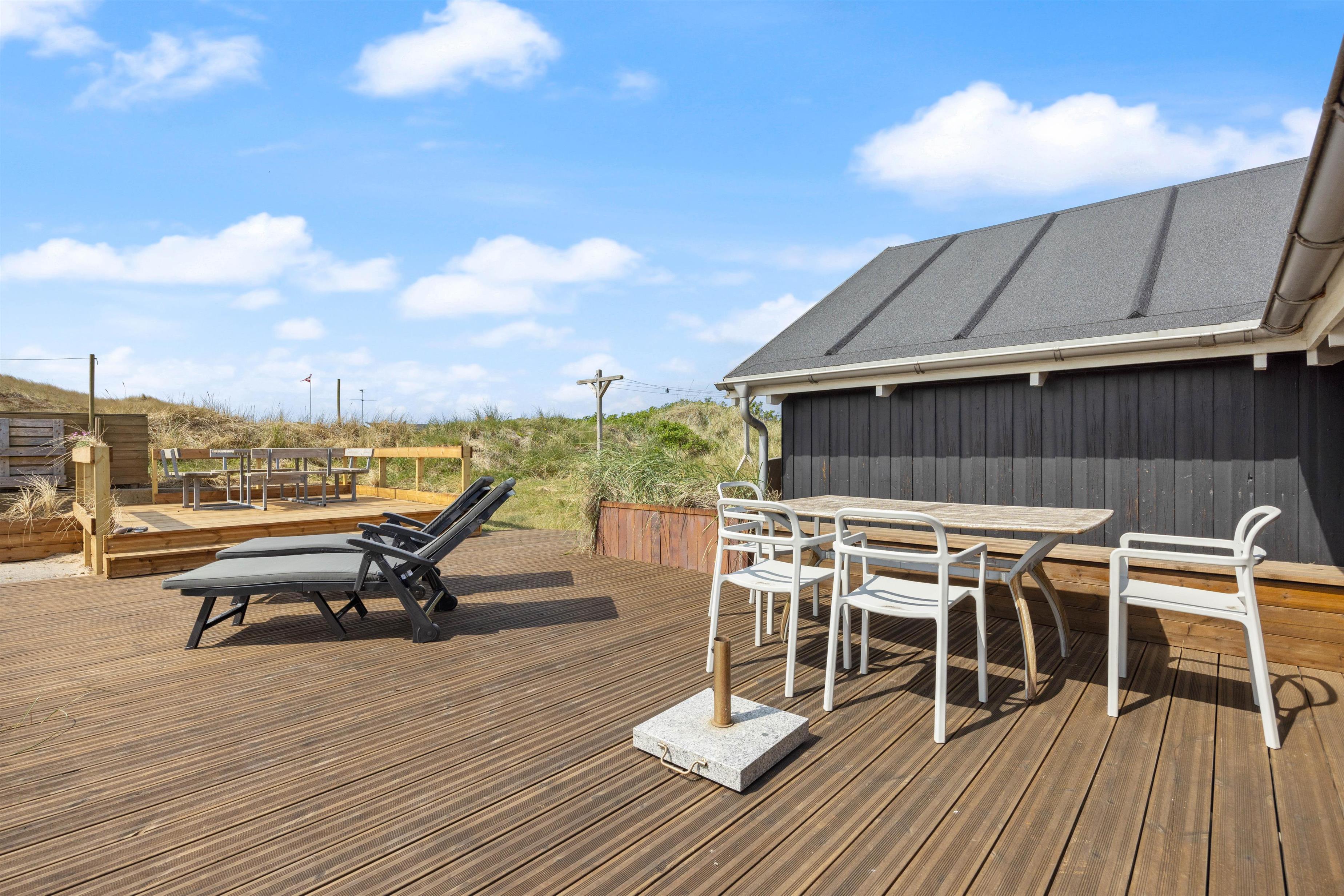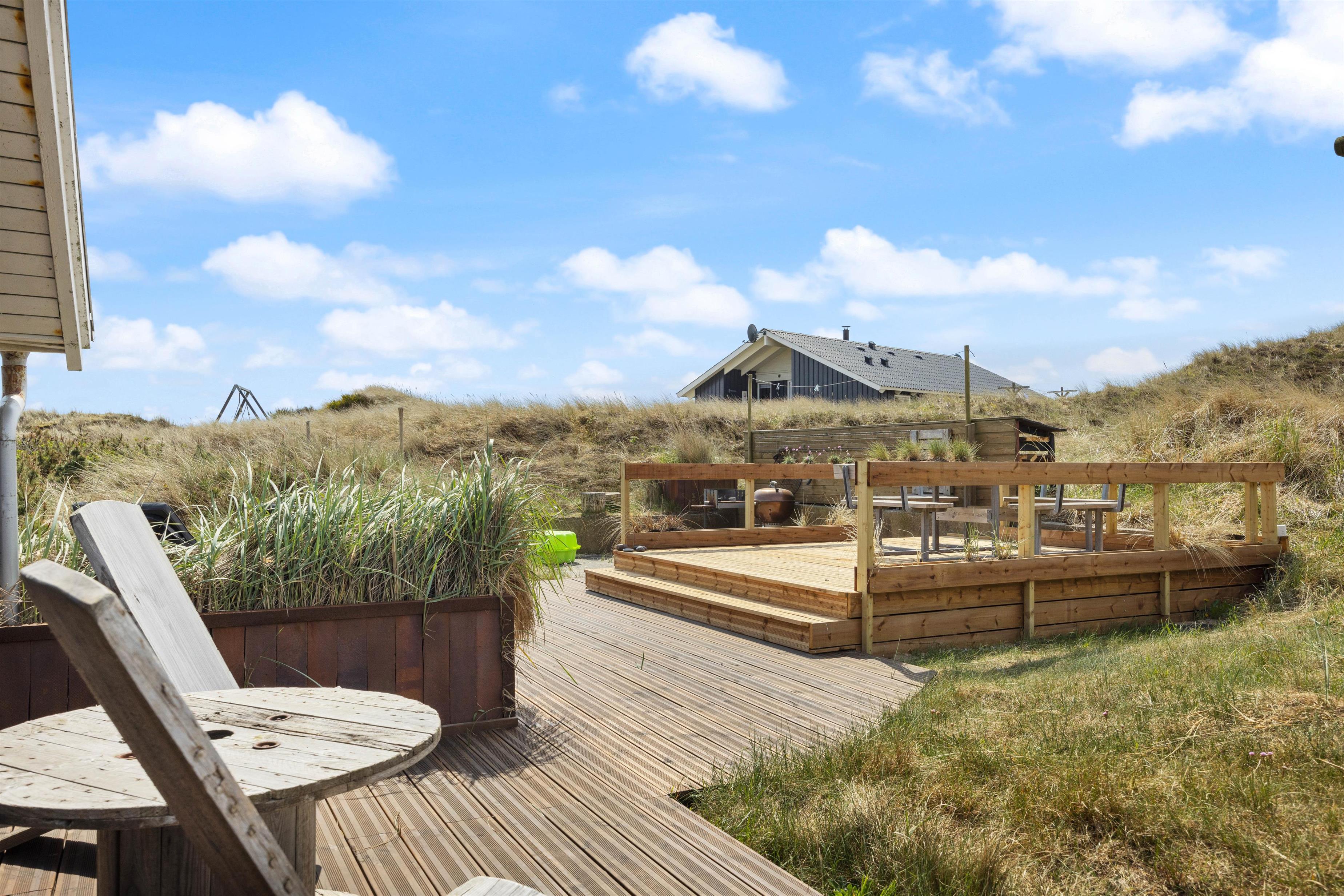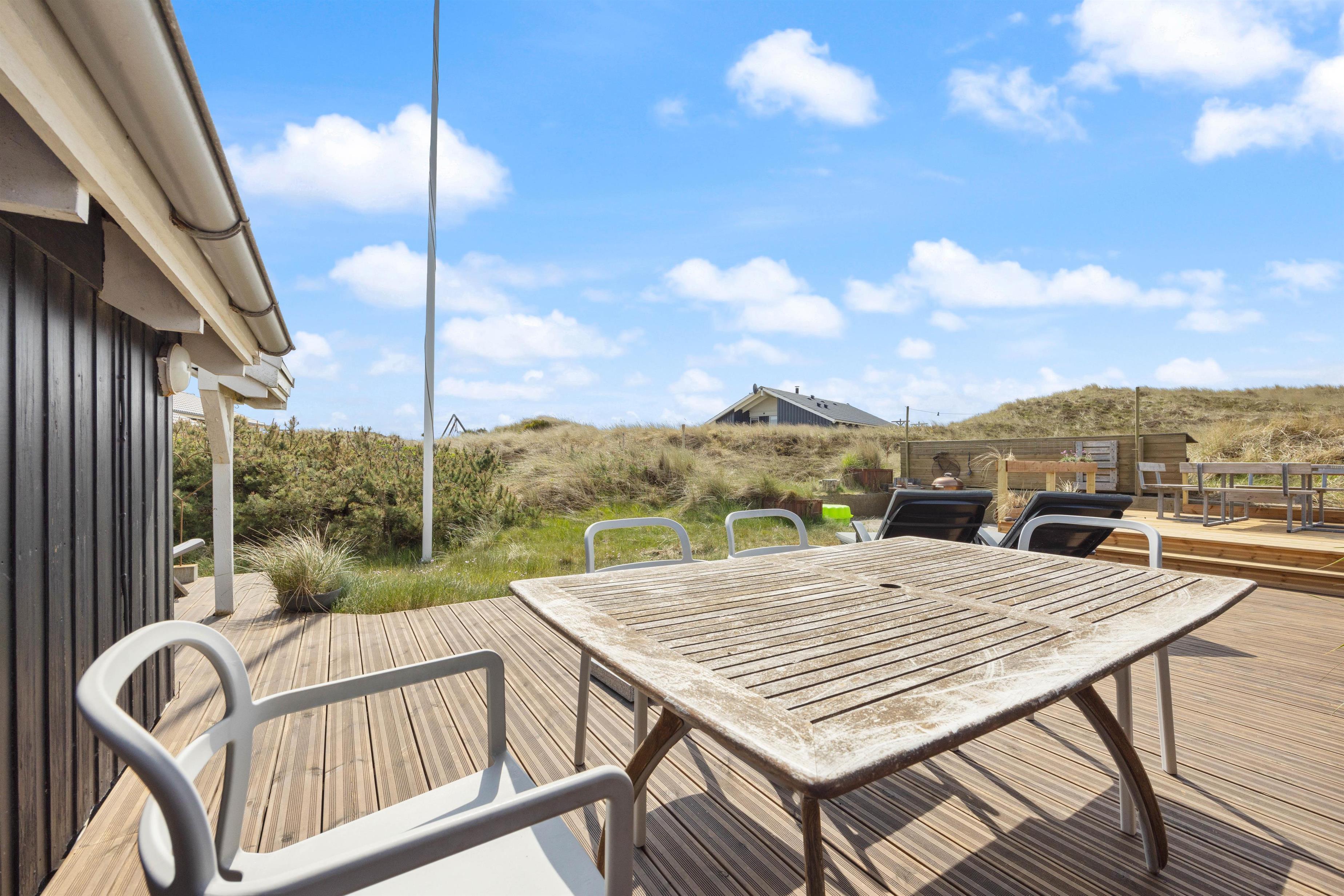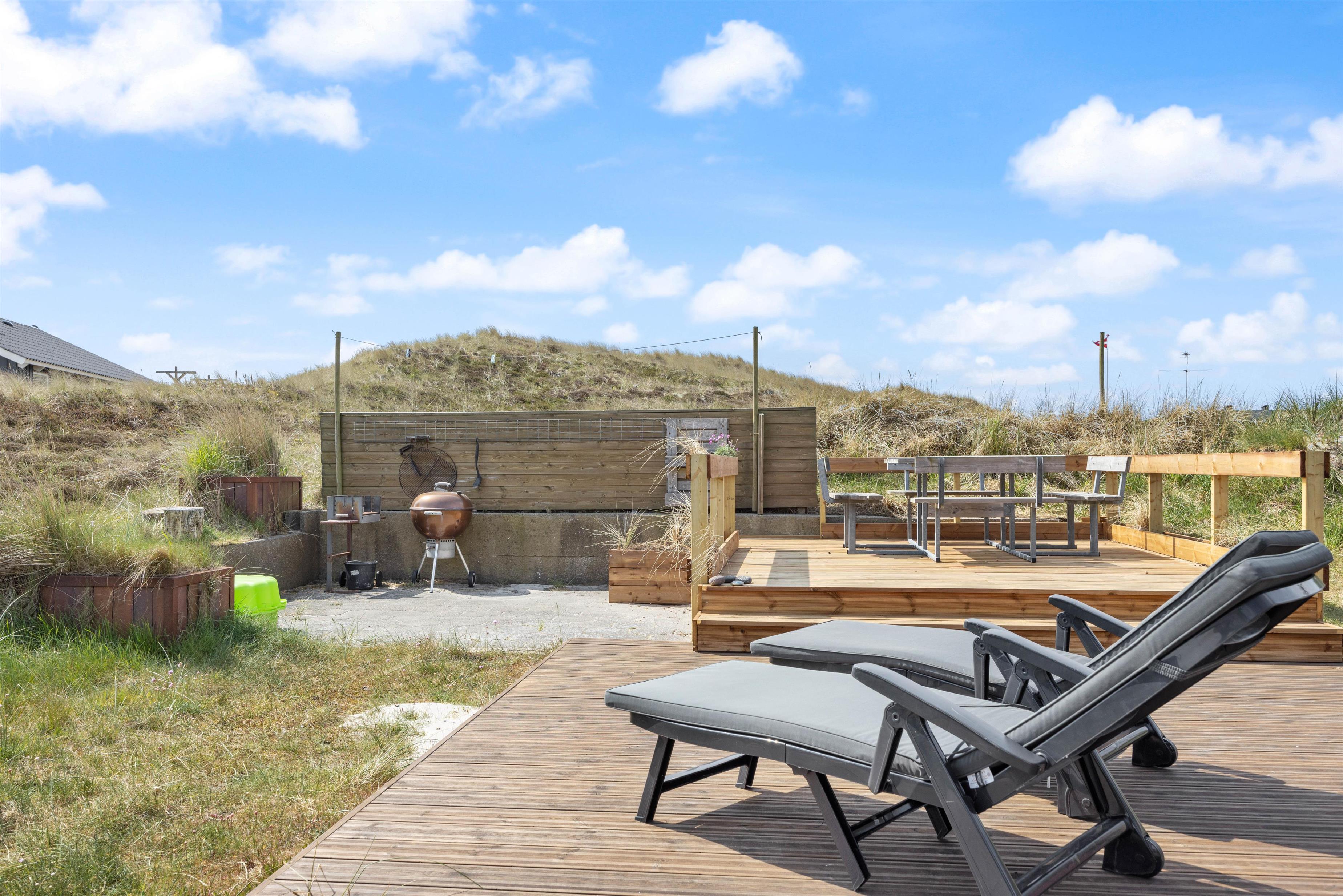 På den store terrasse kan der altid findes et godt sted til enten at nyde solen, eller sidde i læ for vinden. De hyggelige grillaftener kan forlænges under den overdækkede terrasse. Pladsmangel bliver bestemt ikke noget problem her på træterrassen, hvor der er skabt flere forskellige hyggekroge, hvor I kan nyde den friske vestenvind med en god kop kaffe. I kan også finde en grill, der kan hjælpe med at tilberede en lækker middag. På trods af terrassen er åben, er her fint med privatliv da den skærmes af fra huset og de omkringliggende klitter. Den vender desuden mod sydøst, og derfor er tit godt med læ på terrassen.