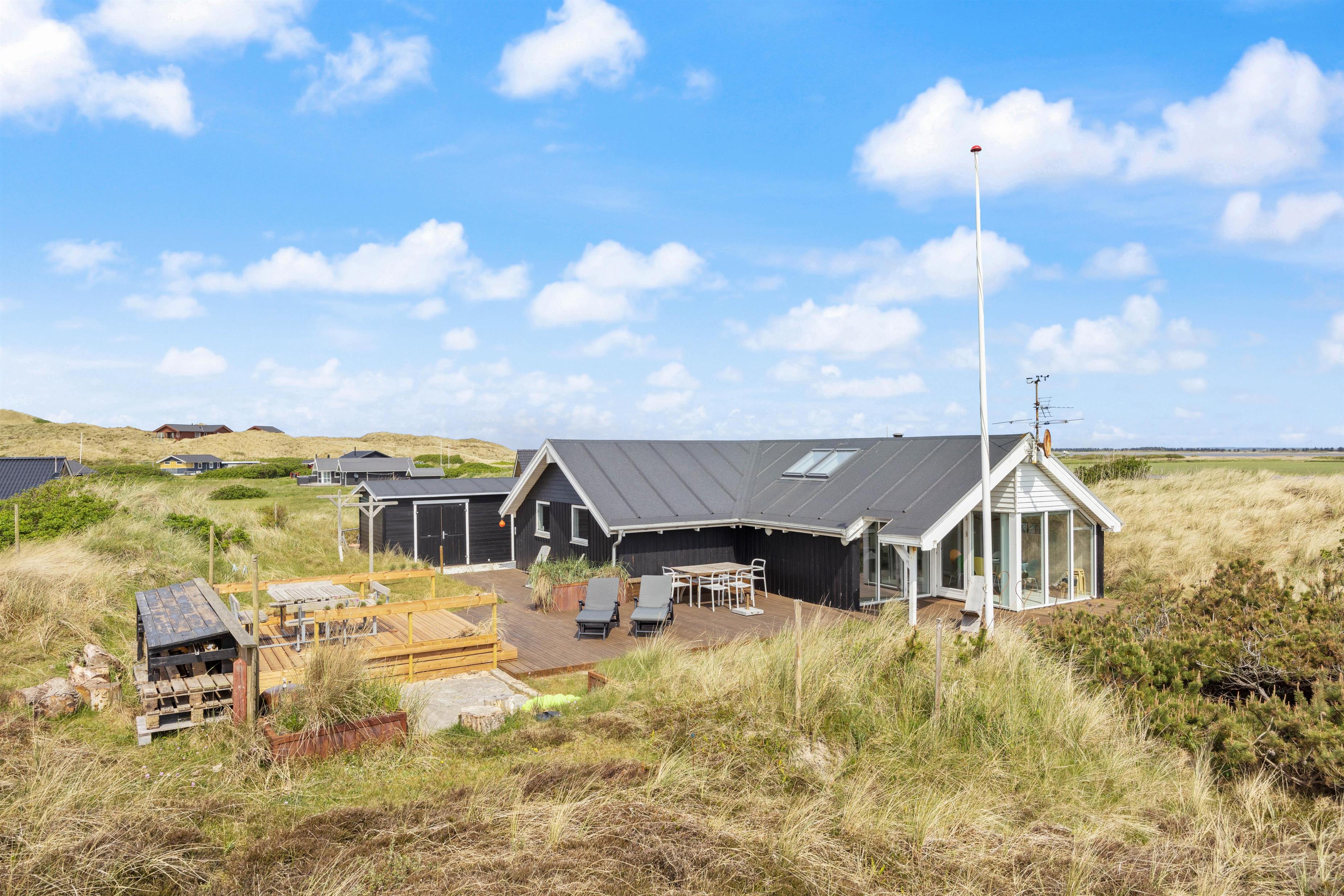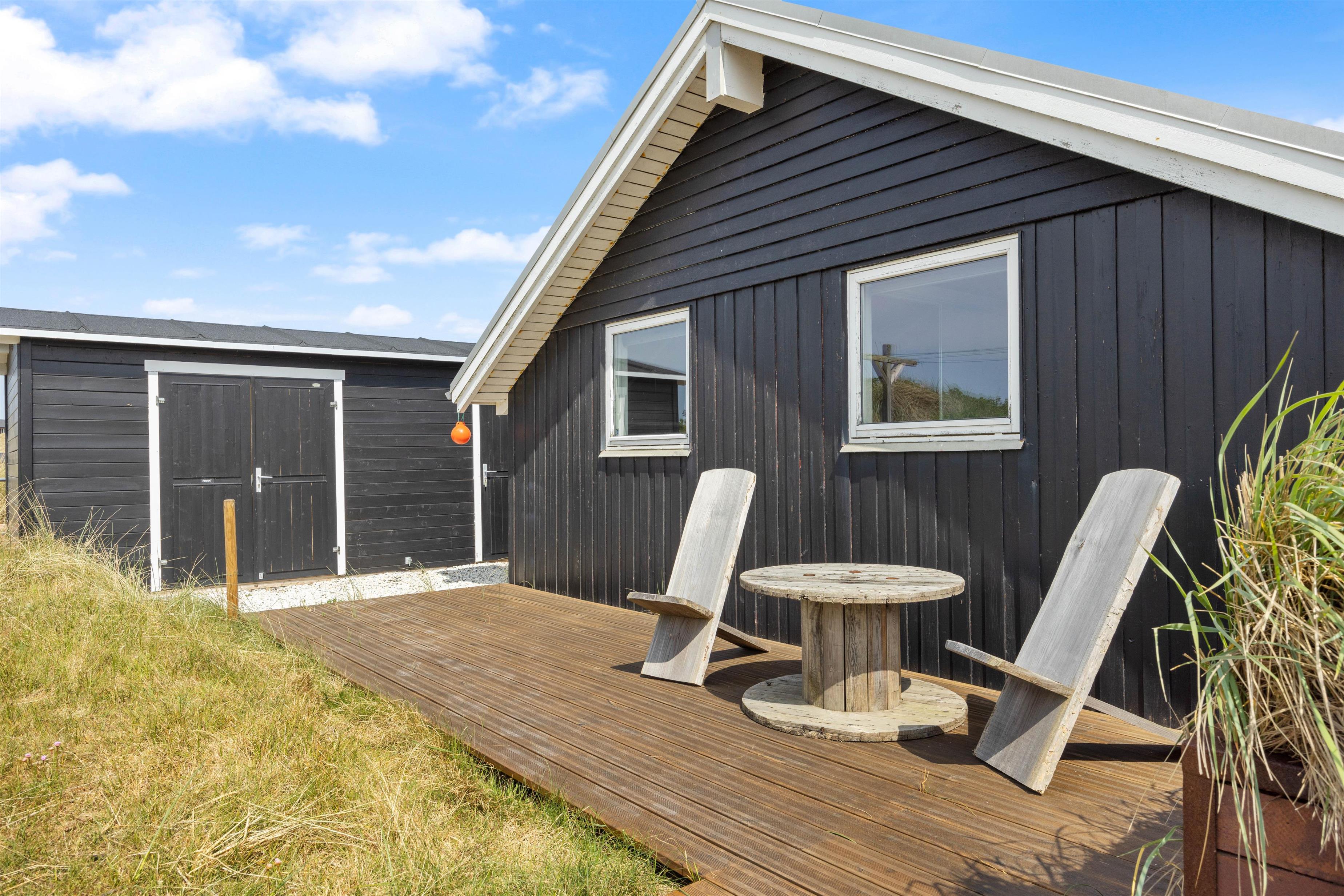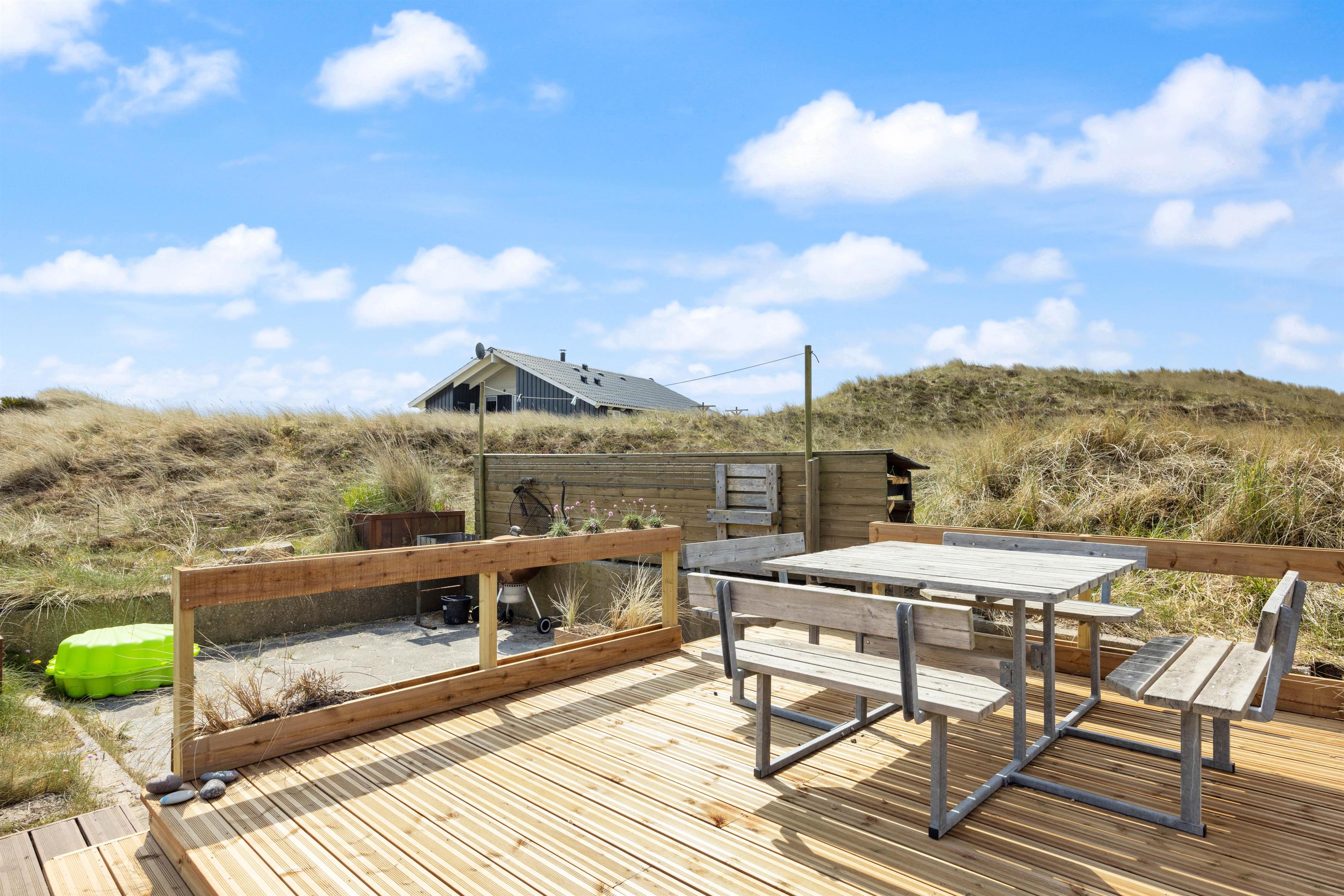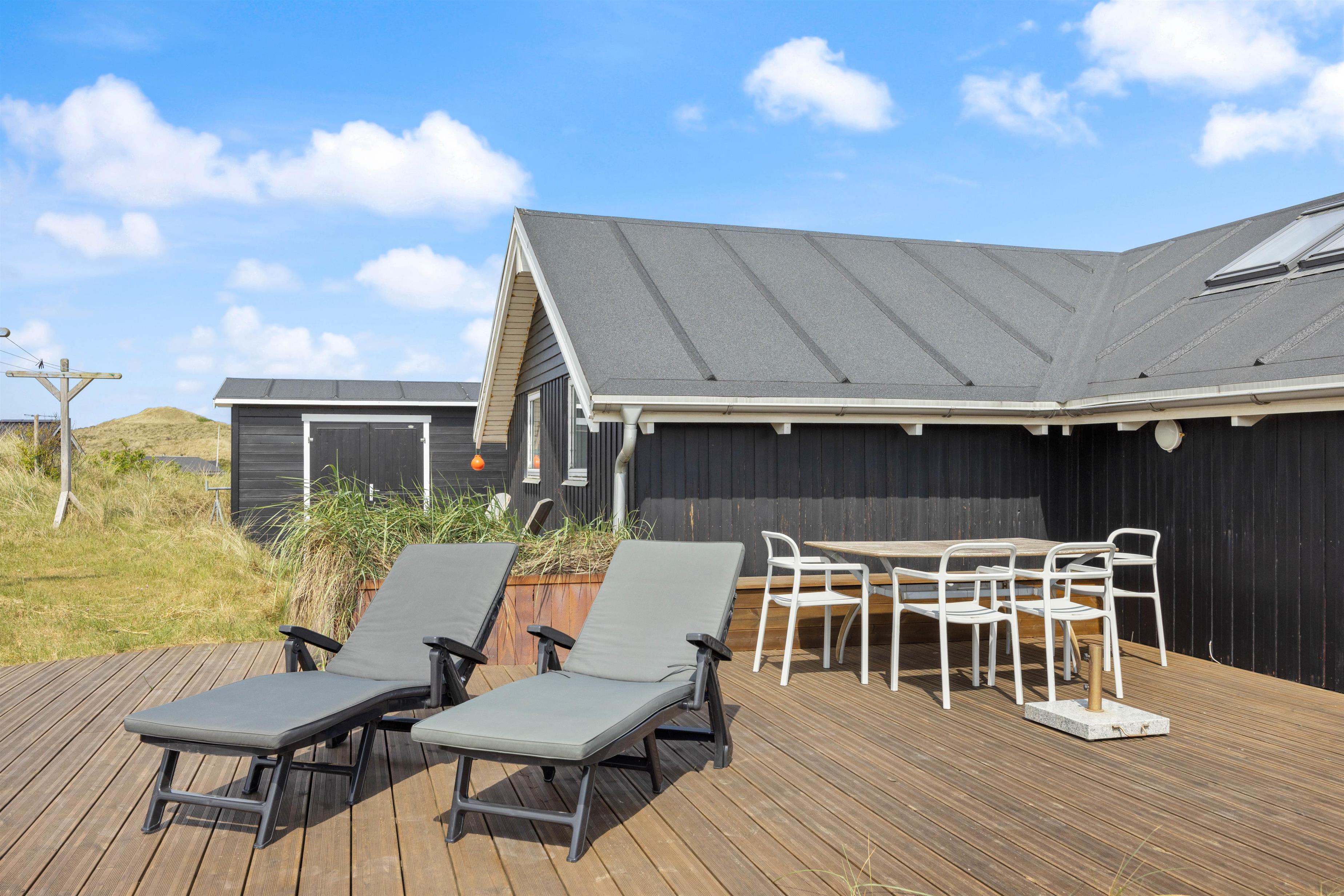 På den store terrasse kan der altid findes et godt sted til enten at nyde solen, eller sidde i læ for vinden. De hyggelige grillaftener kan forlænges under den overdækkede terrasse. Pladsmangel bliver bestemt ikke noget problem her på træterrassen, hvor der er skabt flere forskellige hyggekroge, hvor I kan nyde den friske vestenvind med en god kop kaffe. I kan også finde en grill, der kan hjælpe med at tilberede en lækker middag. På trods af terrassen er åben, er her fint med privatliv da den skærmes af fra huset og de omkringliggende klitter. Den vender desuden mod sydøst, og derfor er tit godt med læ på terrassen.