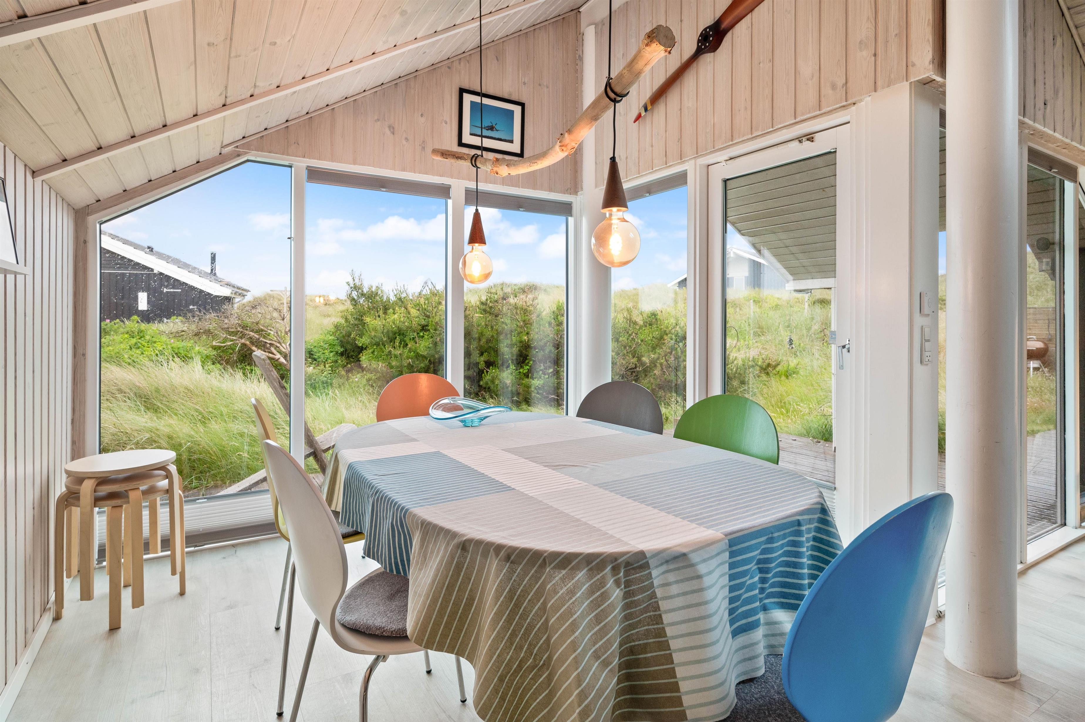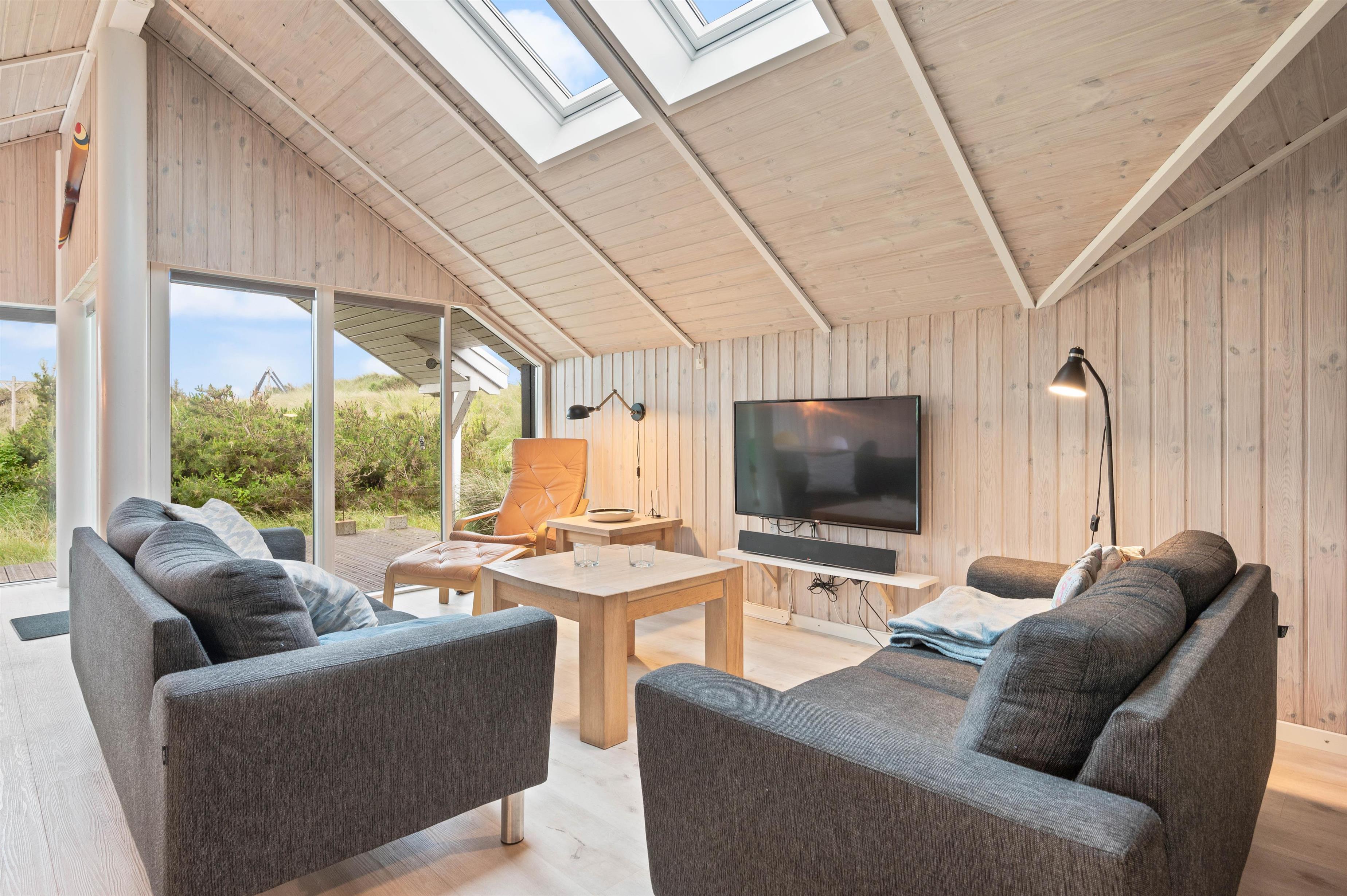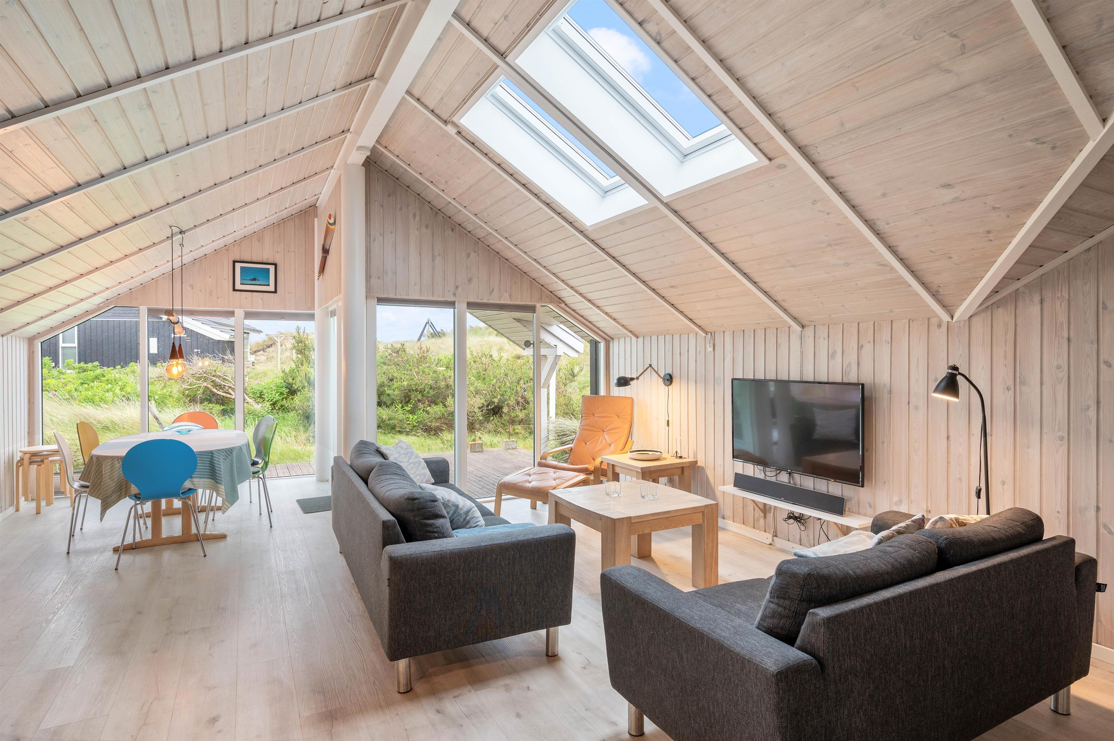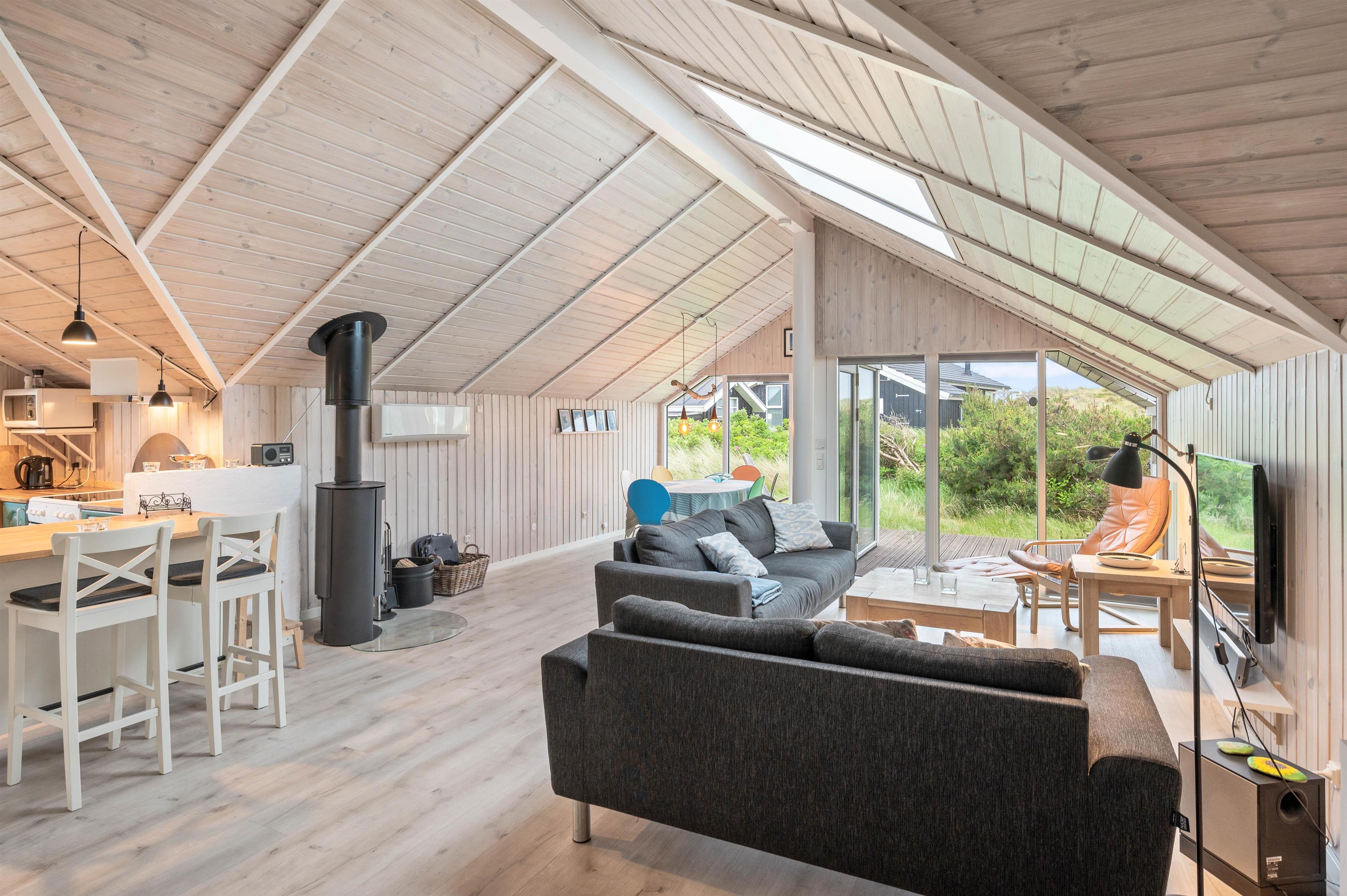 Feriehusets hjerte er helt klar det åbne køkkenalrum, hvor loftet også går hele vejen til kip samt dejlige ovenlysvinduer der giver et godt lysindfald. Her er der virkelige skruet op for hyggen, og der er nøje tænkt på at skabe et dejligt rum, der er klar til at skabe mange dejlige ferieminder. Det er også her i stue afdelingen, hvor I finder brændeovn, der altid er garant for at skabe en hyggelig og varm atmosfære.