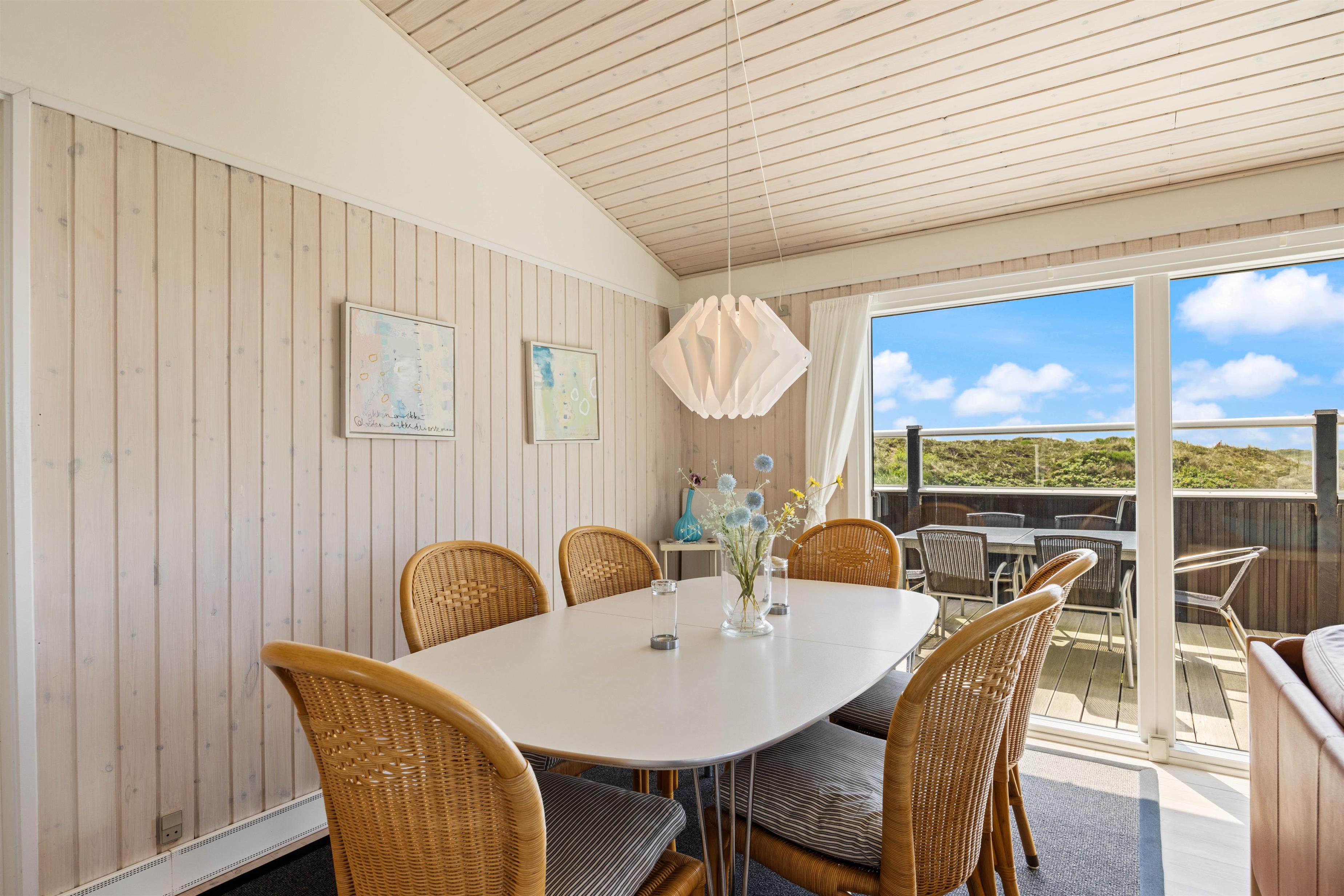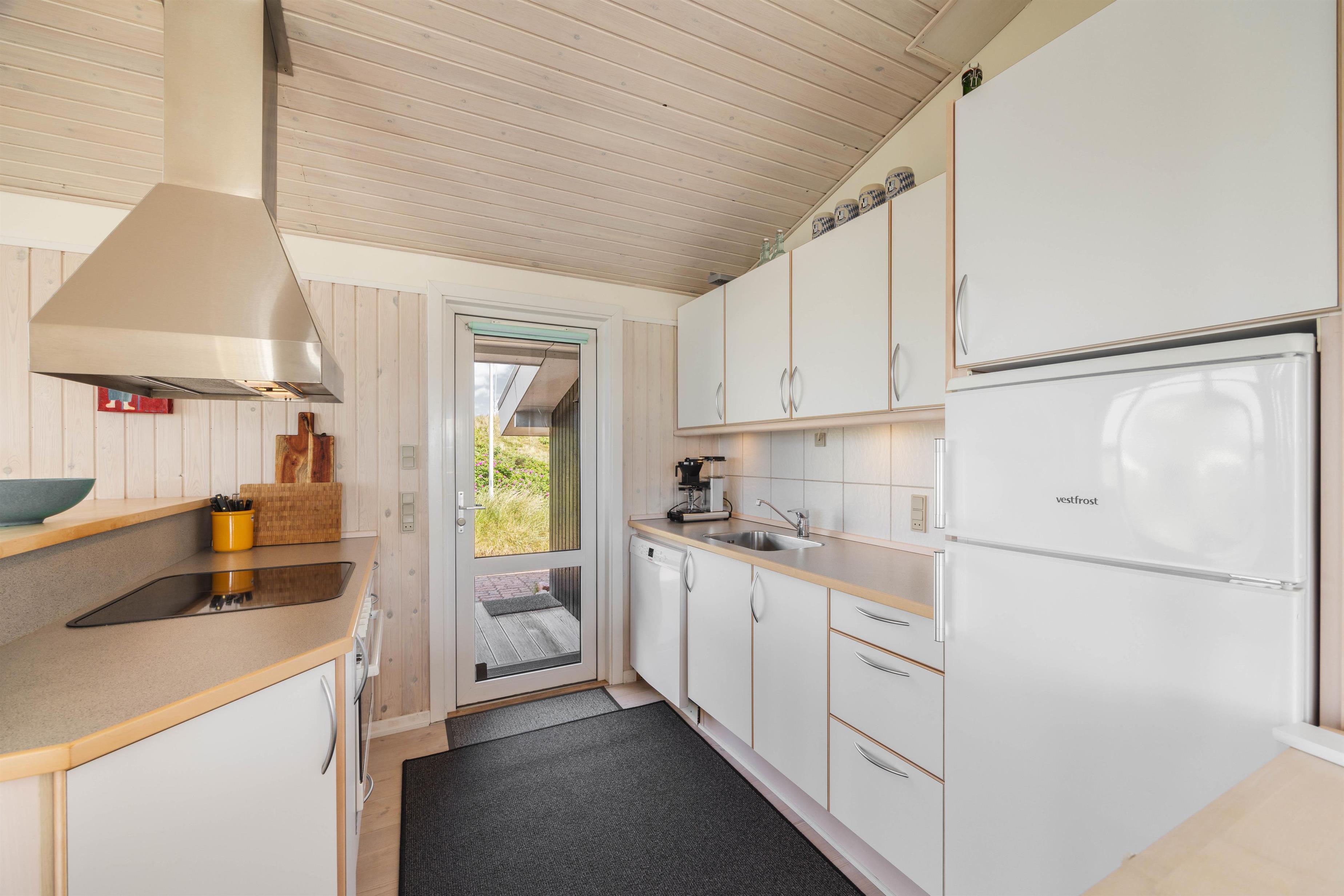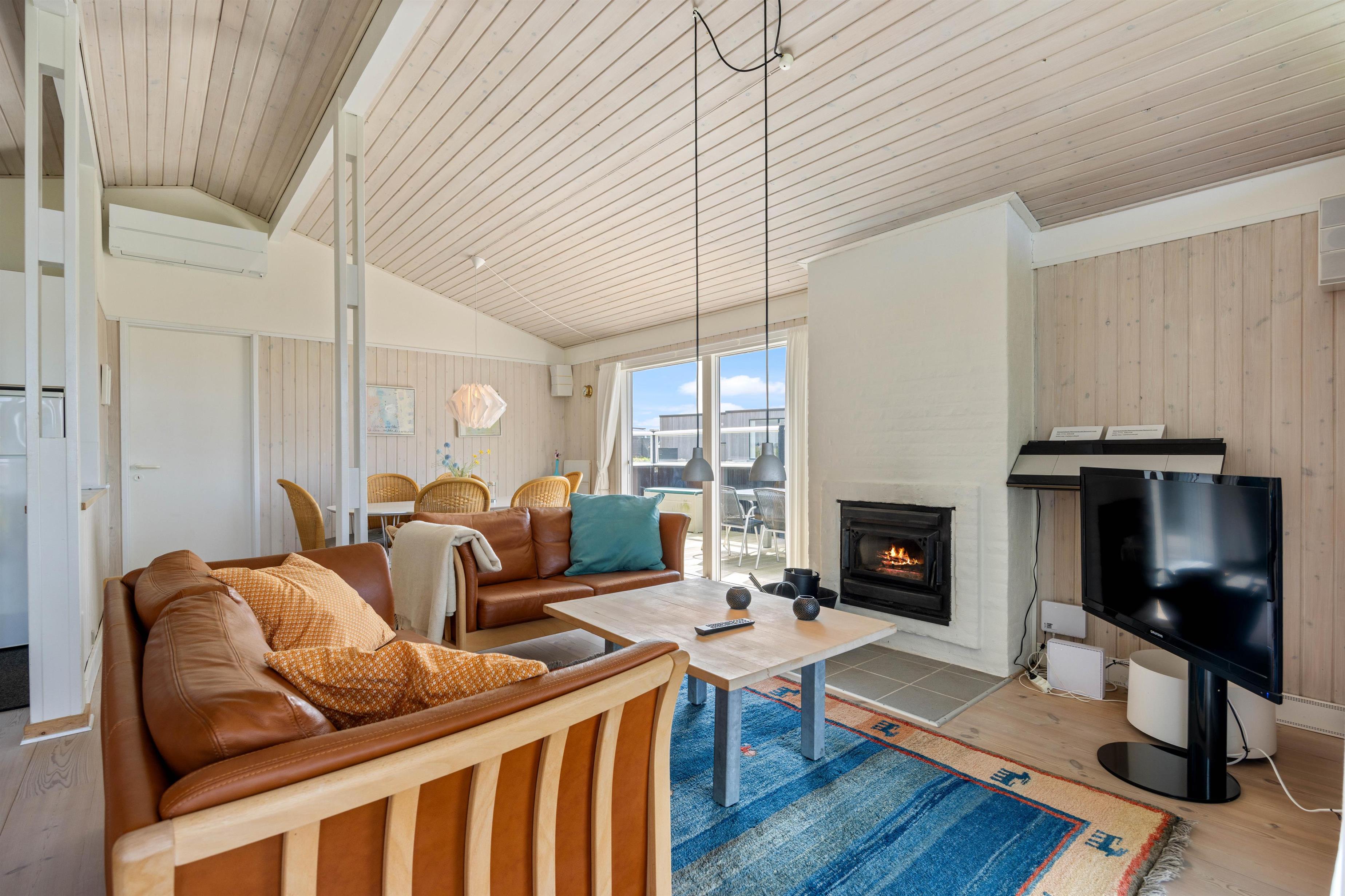 I opholdsstuen finder I en dejlig pejs, som I kan varme jer ved på køligere dage, og fra sofaen har I et skønt kig ud på landskabet udenfor gennem de store panoramavinduer, som også lader en masse sollys ind i boligen. Fra sofaen kan alle følge med i madlavningen og planlægningen af feriens kommende aktiviteter. Opvaskemaskinen klarer hurtigt opvasken på ferien og der er god plads til at samles og nyde et glas vin, mens maden simrer.