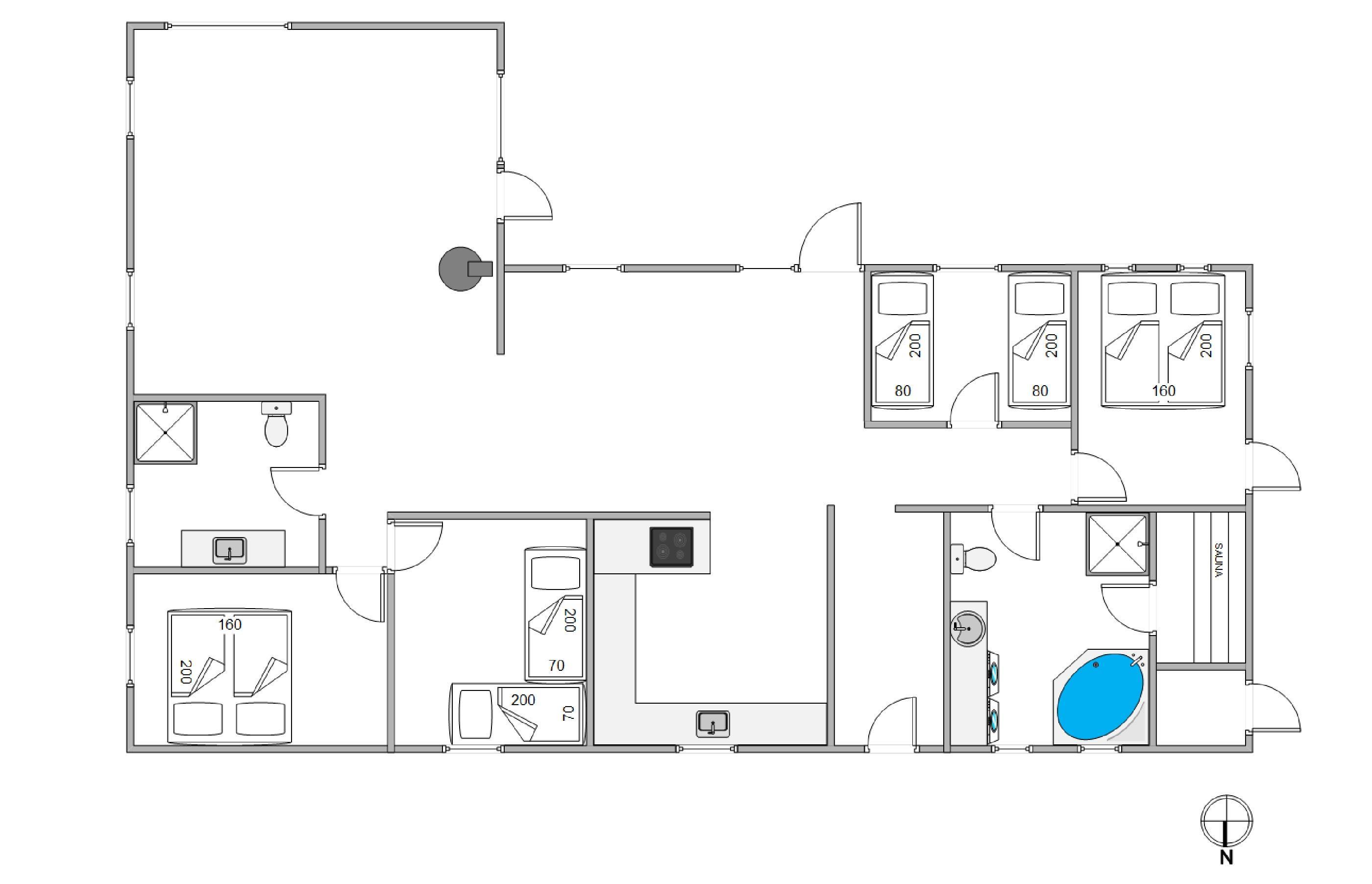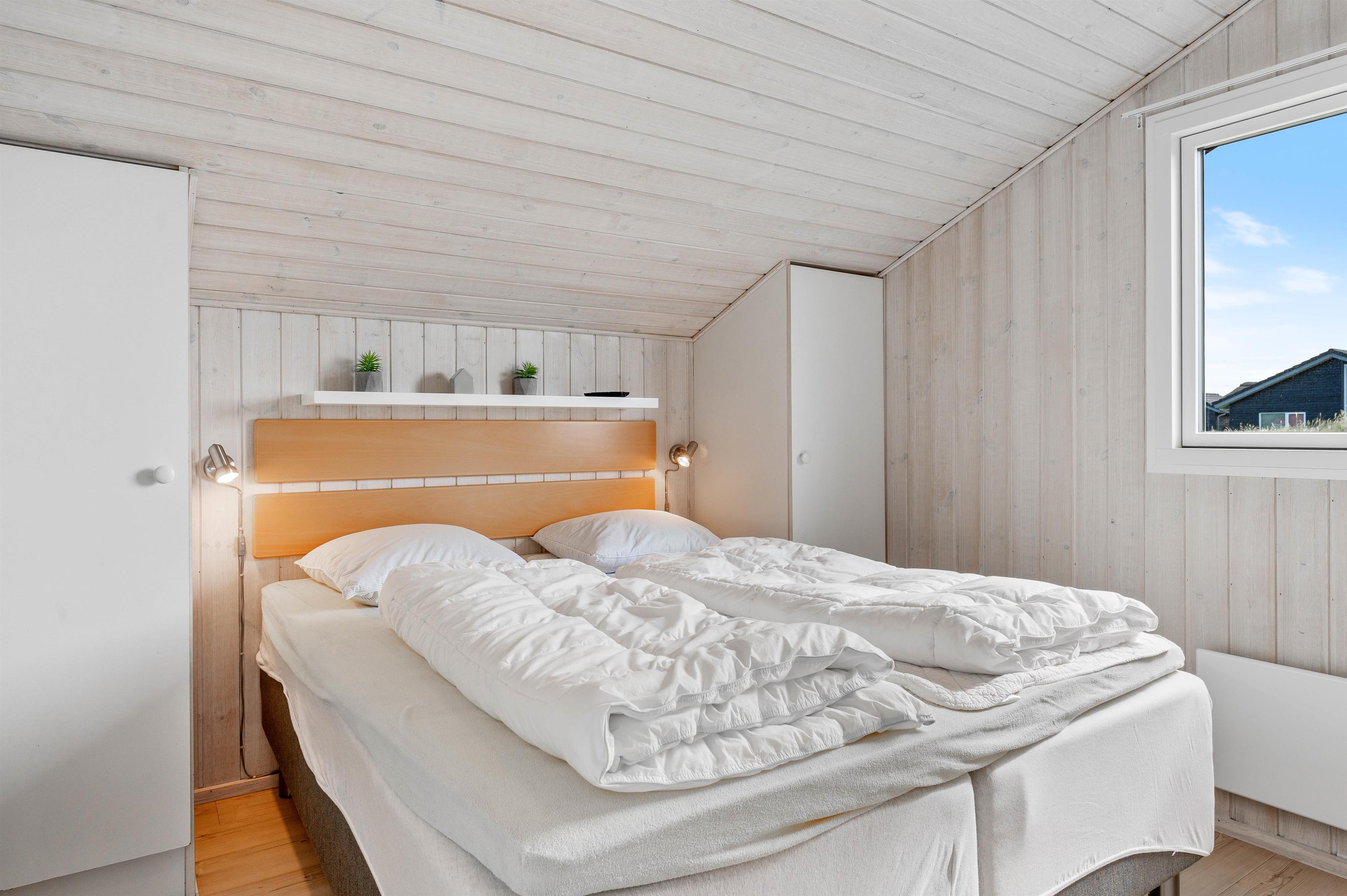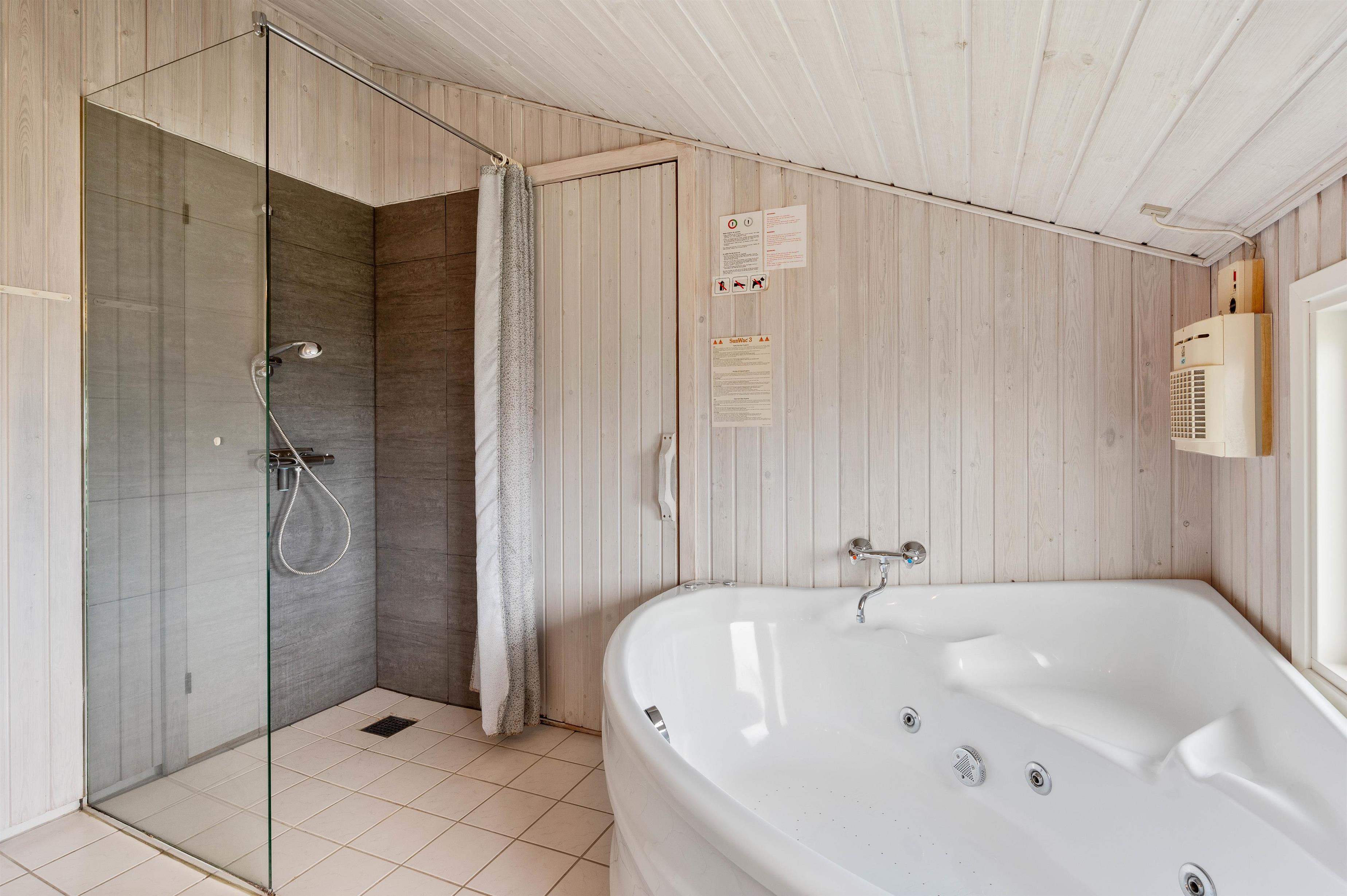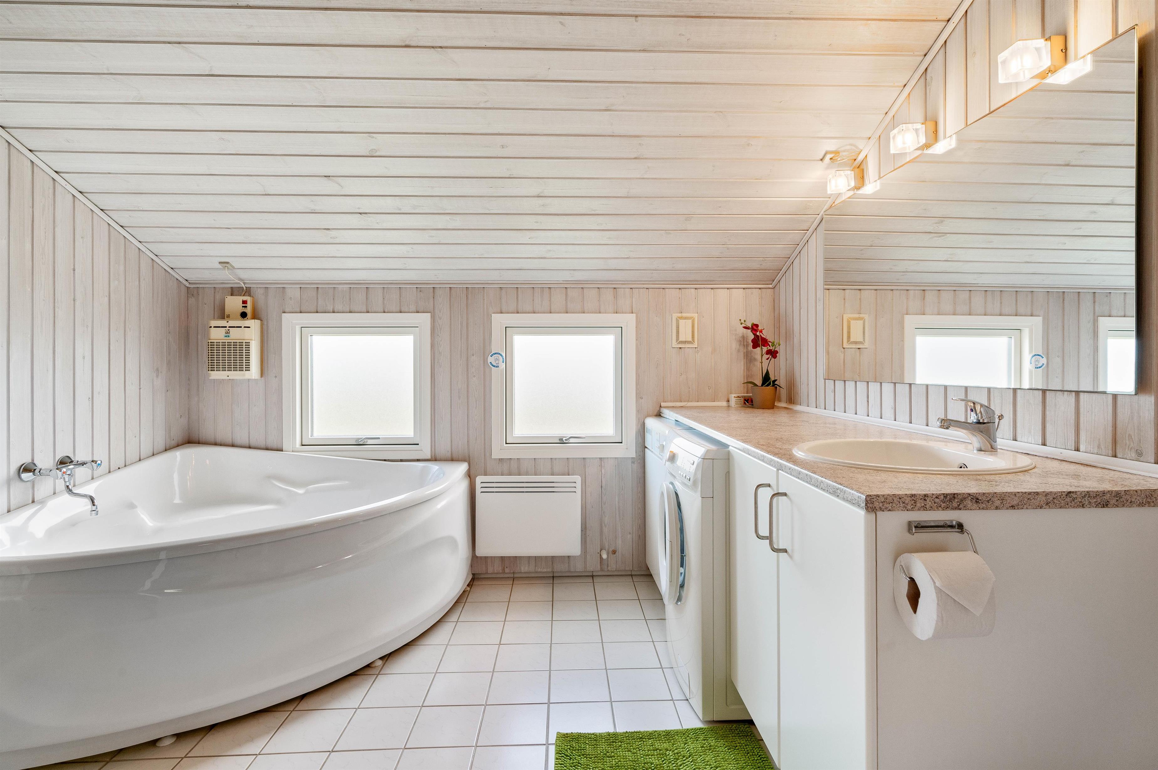 Sommerhuset har i alt 8 sovepladser fordelt på 4 værelser. 2 af værelserne er indrettet dobbeltsenge, mens de sidste 2 værelser er udstyret med hver 2 enkeltsenge. I finder et stort badeværelse i feriehuset, hvor der virkelig er skruet op for wellness-elementerne. Badeværelset er nemlig udstyret med både spabad og sauna, ligesom det også har brusekabine, tørretumbler, vaskemaskine og gulvvarme. Derudover er der desuden et gæstetoilet med brusekabine og gulvvarme.