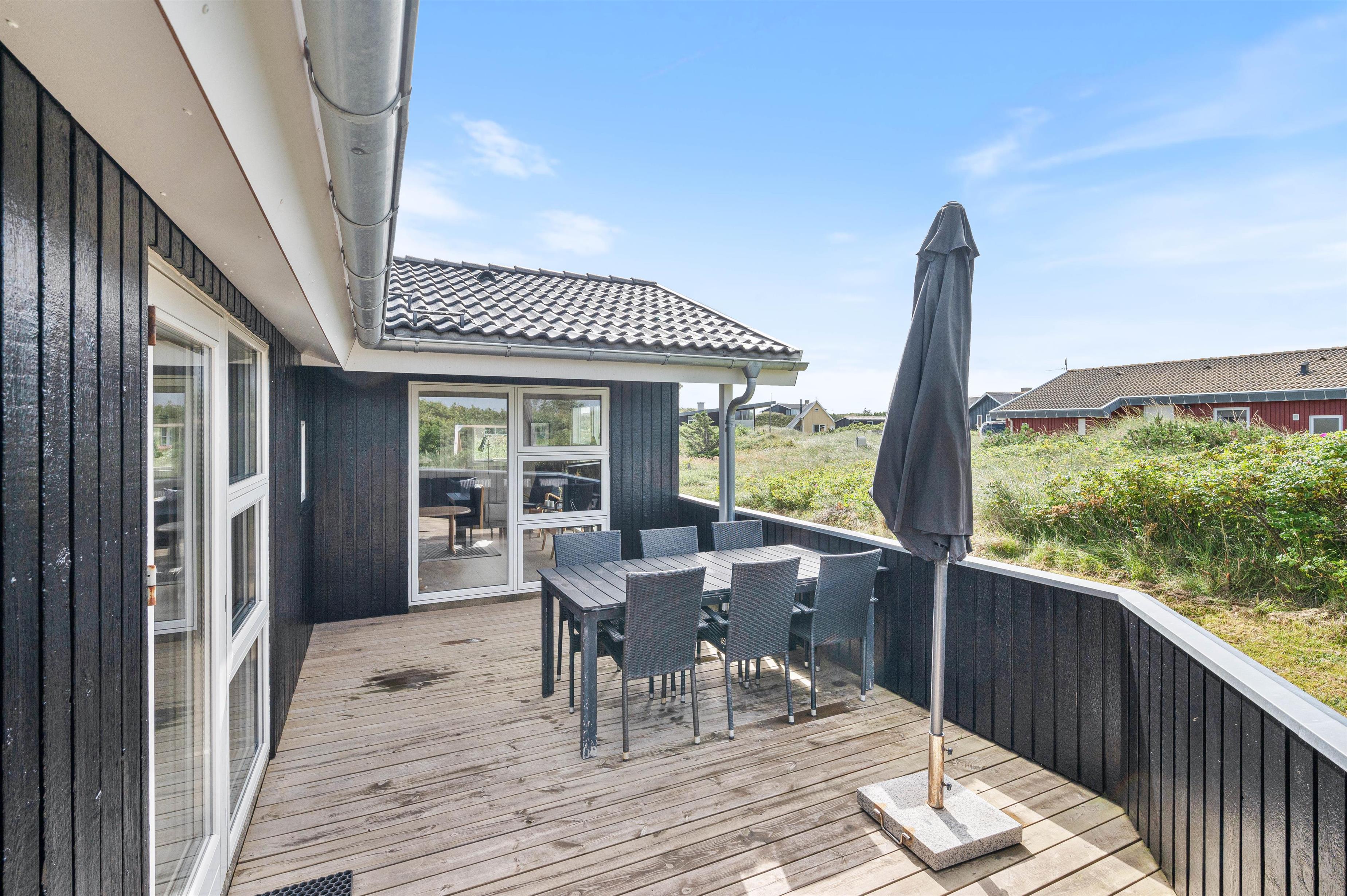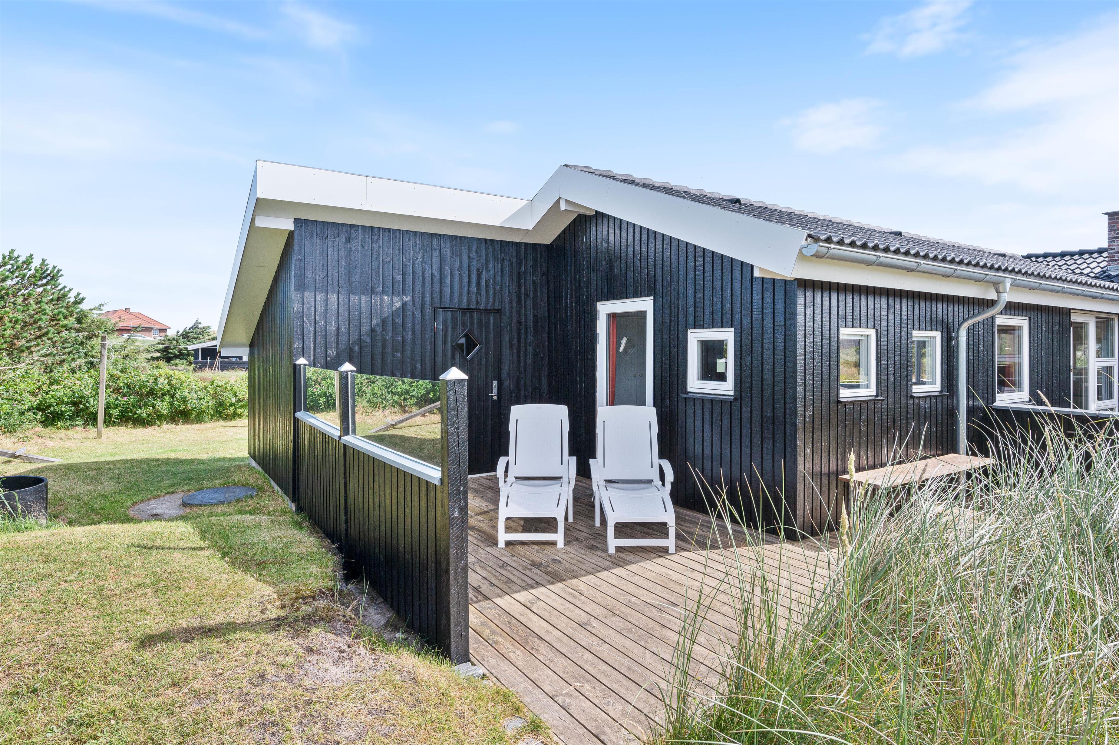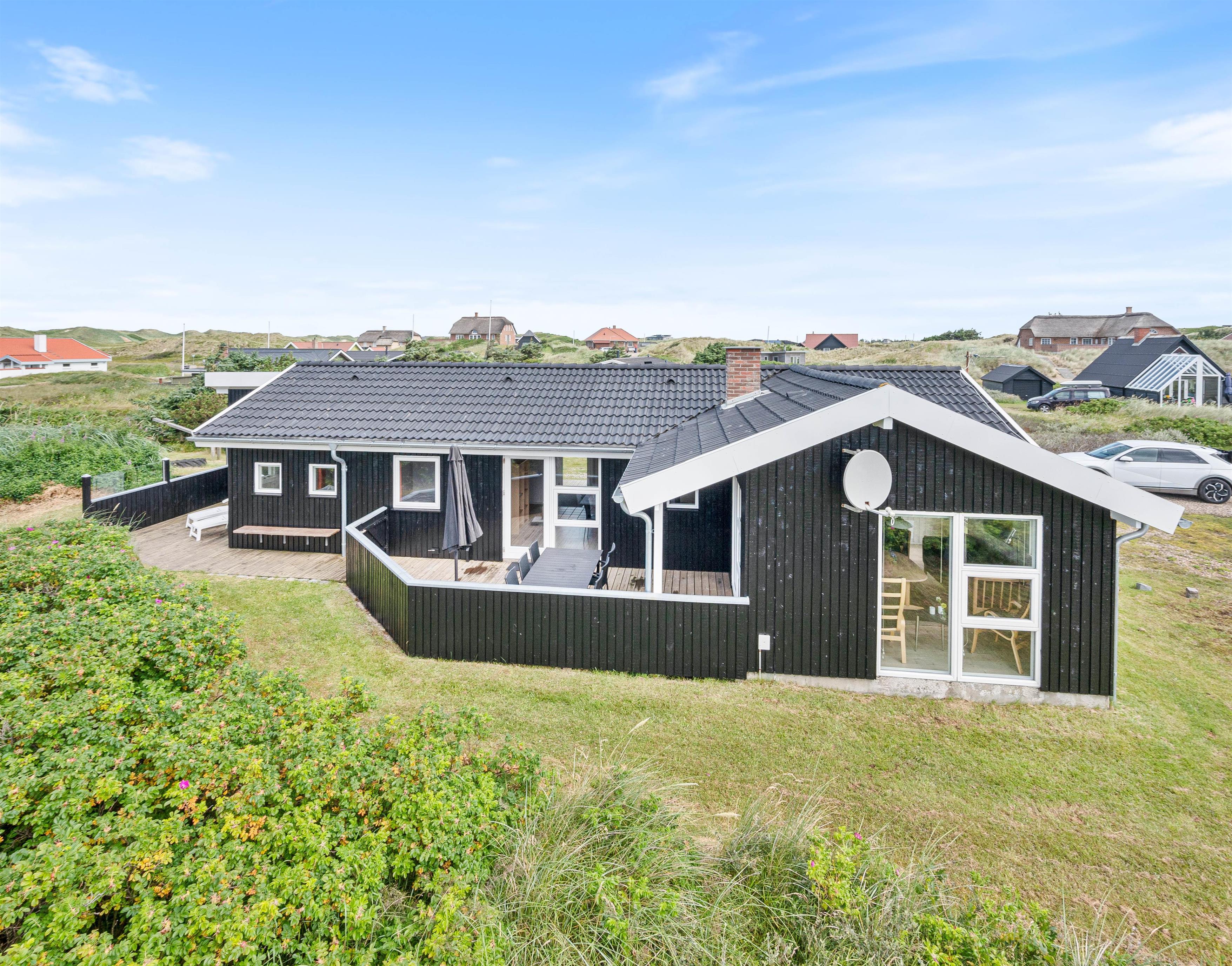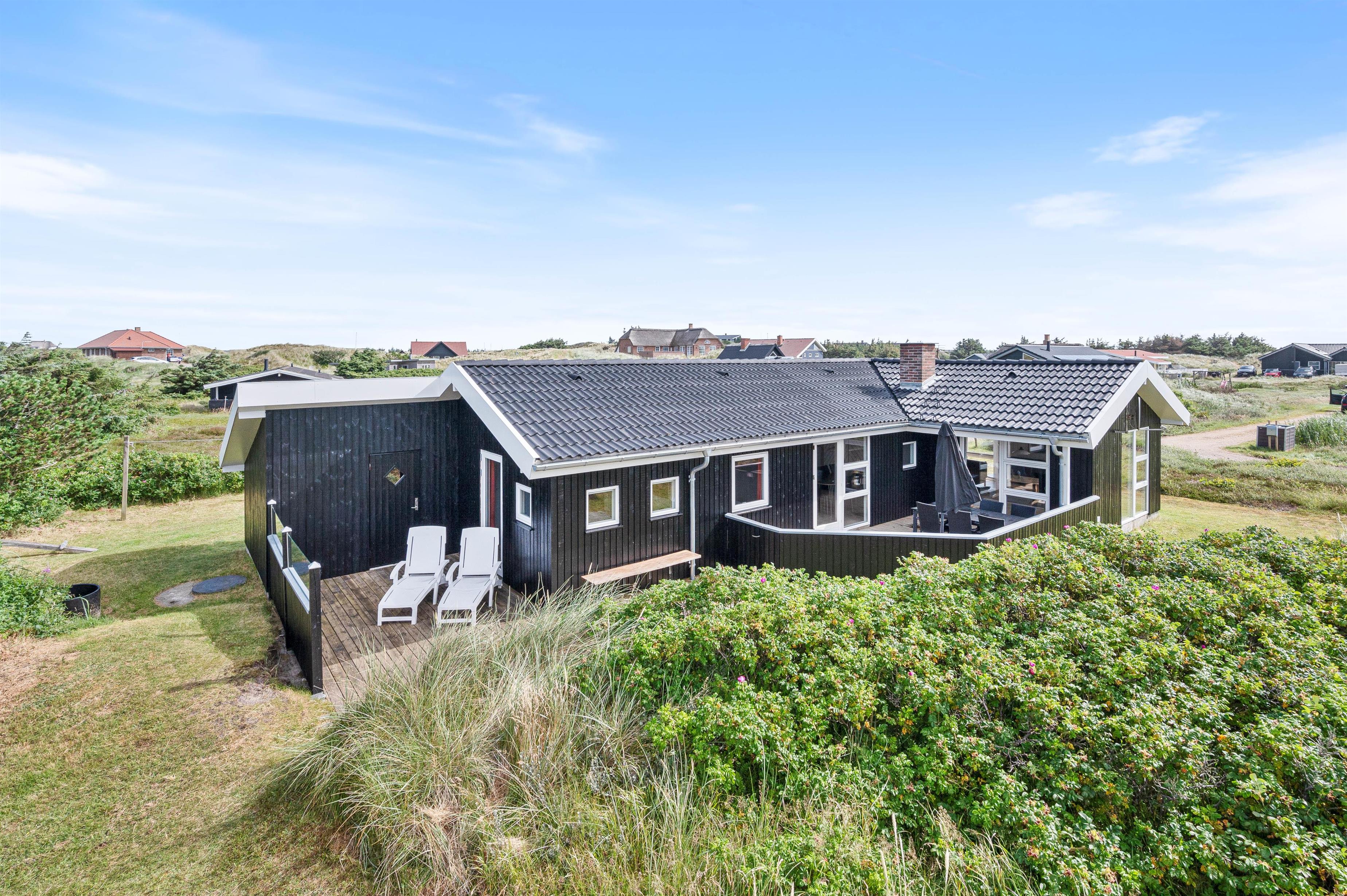 Sommerhuset er beliggende på en dejlig naturgrund, hvor hybenbuske og marehalm snor sig lystigt. Og I vil helt sikkert have lyst til at slå jer ned på en af feriehusets terrasser for at nyde udsigten og den friske havluft fra Vesterhavet.