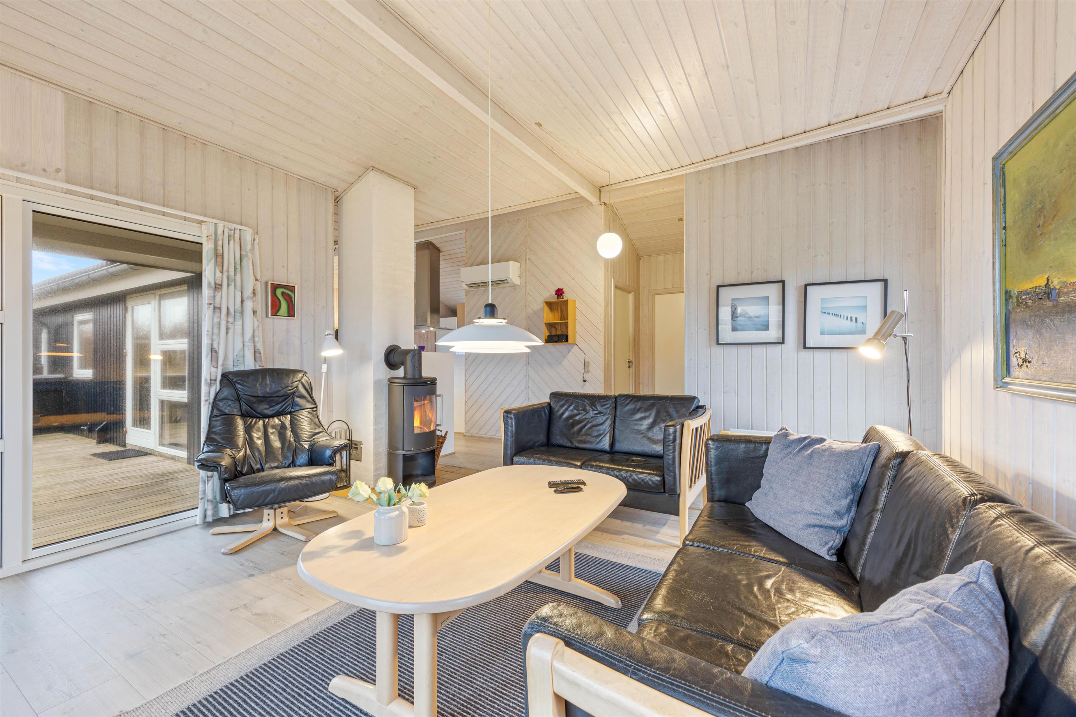 Den dejlige stue er indrettet med gode kvalitetsmøbler, hvor I med sikkerhed har lyst til at smække benene op. Herfra kan I nyde varmen fra brændeovnen og den flotte udsigt gennem vinduerne. Hvis I ikke ønsker at tænde op i brændeovnen, har feriehuset tilknyttet en varmepumpe, hvor I også kan nyde varmen fra. Eller I kan sætte en film i DVD-afspilleren og se en god film. Gerne med en stor portion popcorn i skødet.