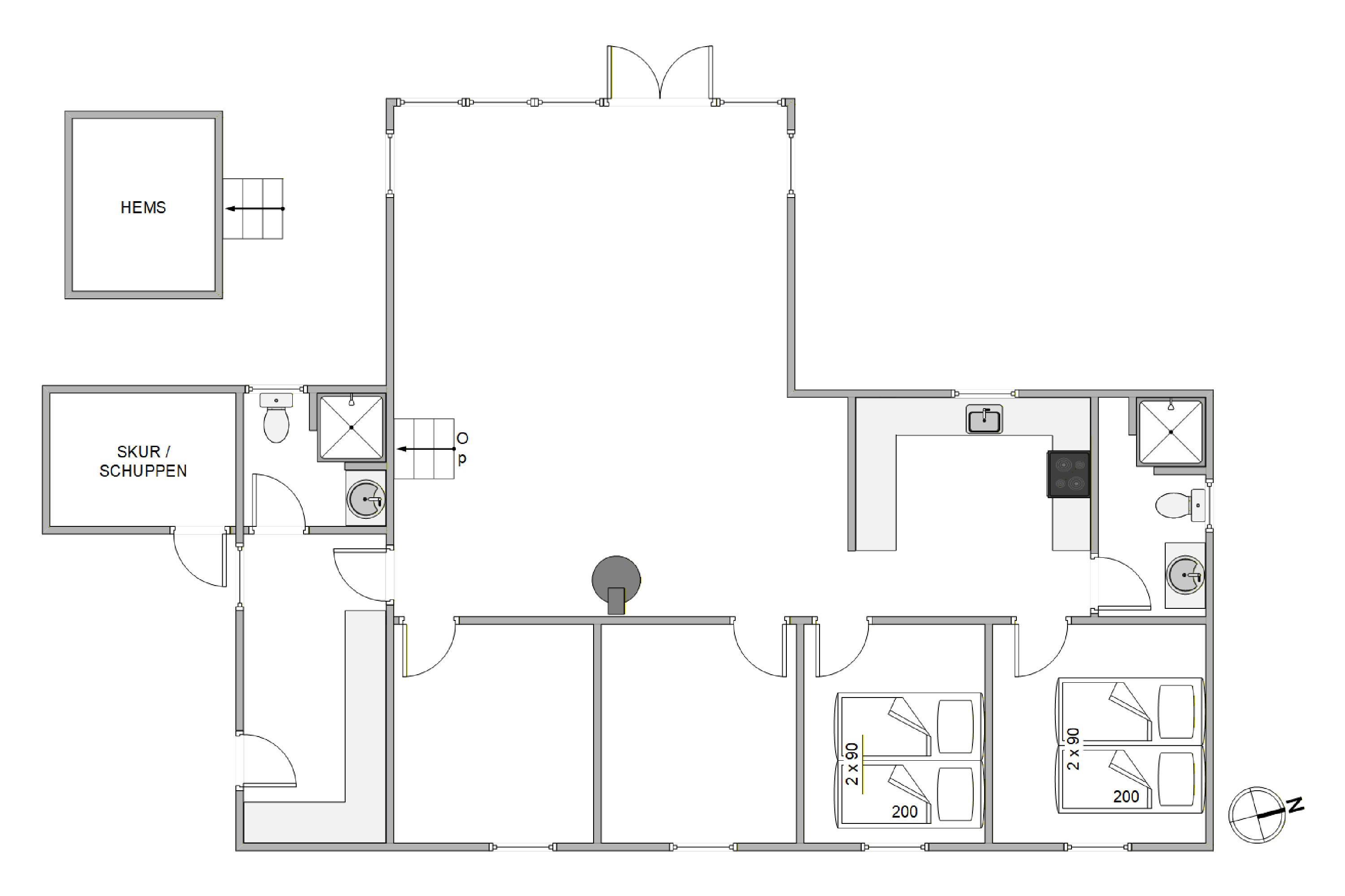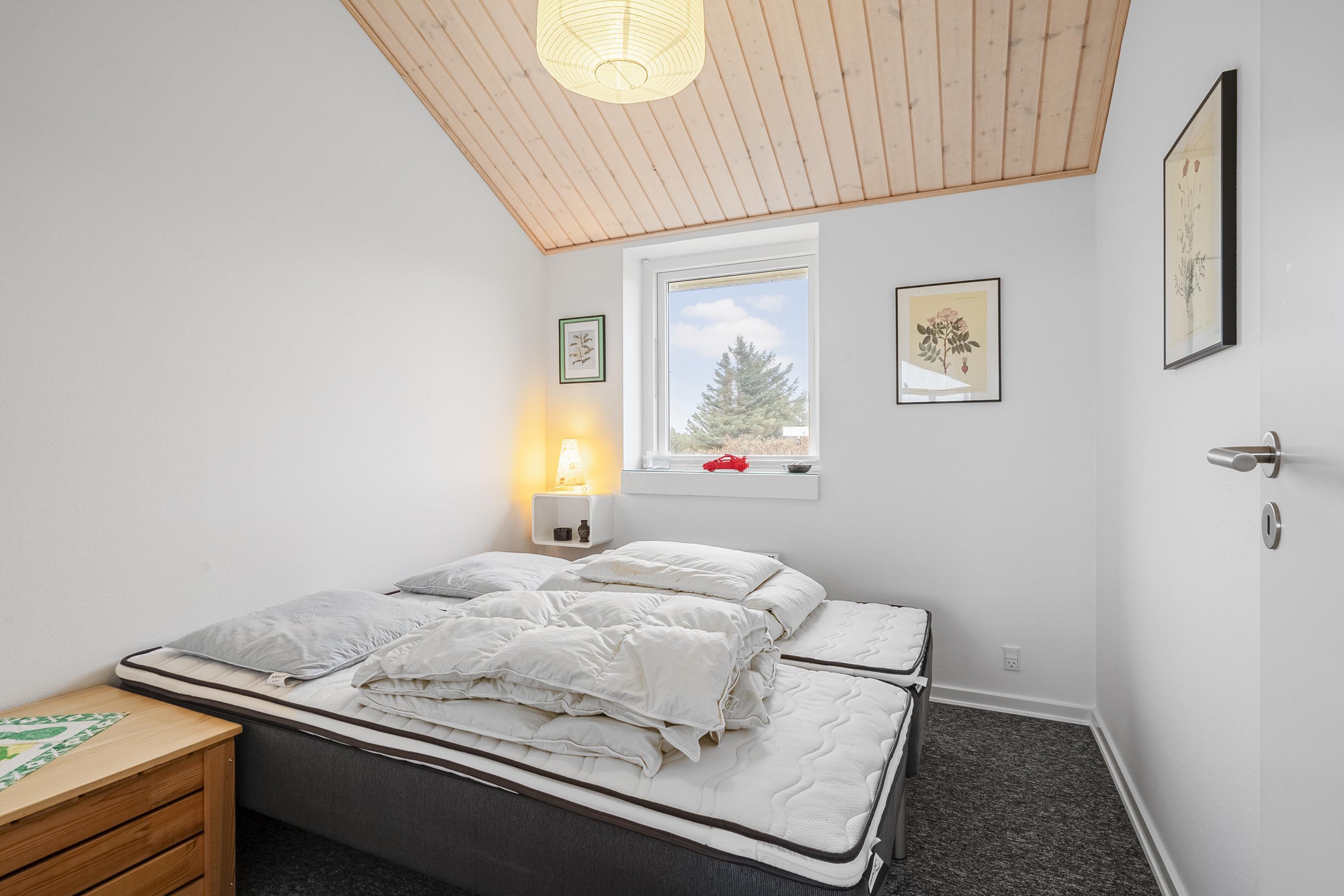 Sommerhuset på Troldedalen 28 fordeler sig over 117 m² og byder på rigelig plads til alle feriegæster. Det har 4 soveværelser: 2 med dobbeltsenge og 2 med hver 2 enkeltsenge, hvilket sikrer en komfortabel nattesøvn for både familier og vennepar. Begge badeværelser har gulvvarme, så fødderne holdes varme året rundt.