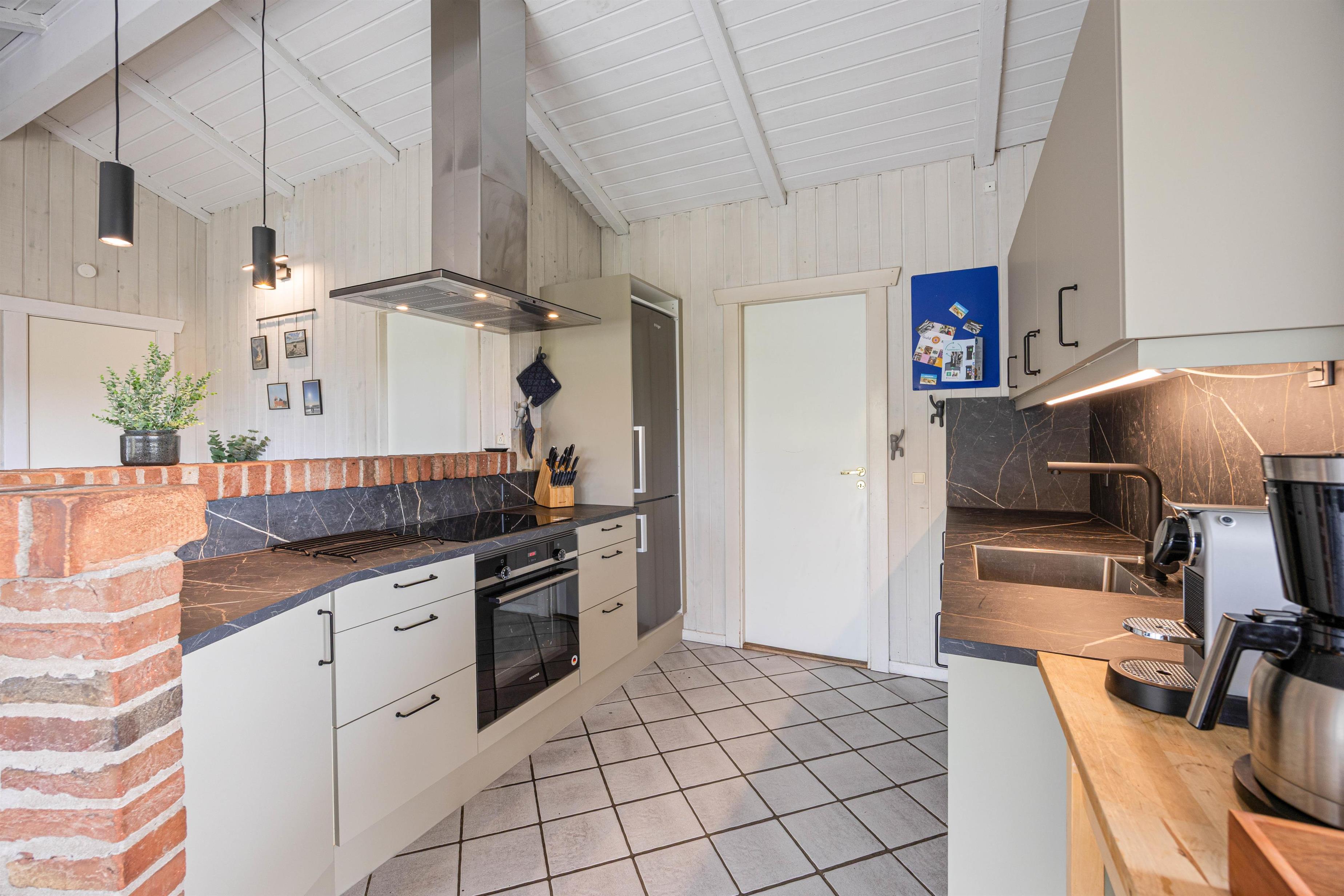 Her er en åben og hyggelig stue med brændeovn, hvor hele familien kan samles, og se en god film sammen, og nyde hinandens selskab. I forlængelse af stuen finder I her et rummeligt køkken, hvor her er alt hvad I skal bruge, for at tilberede et lækkert måltid mad til hele familien. Fra køkkenet er der en dør ud til bryggerset, som gemmer på en vaskemaskine og tørretumbler, så I har mulighed for at få frisket håndklæderne op i løbet af jeres ferie.