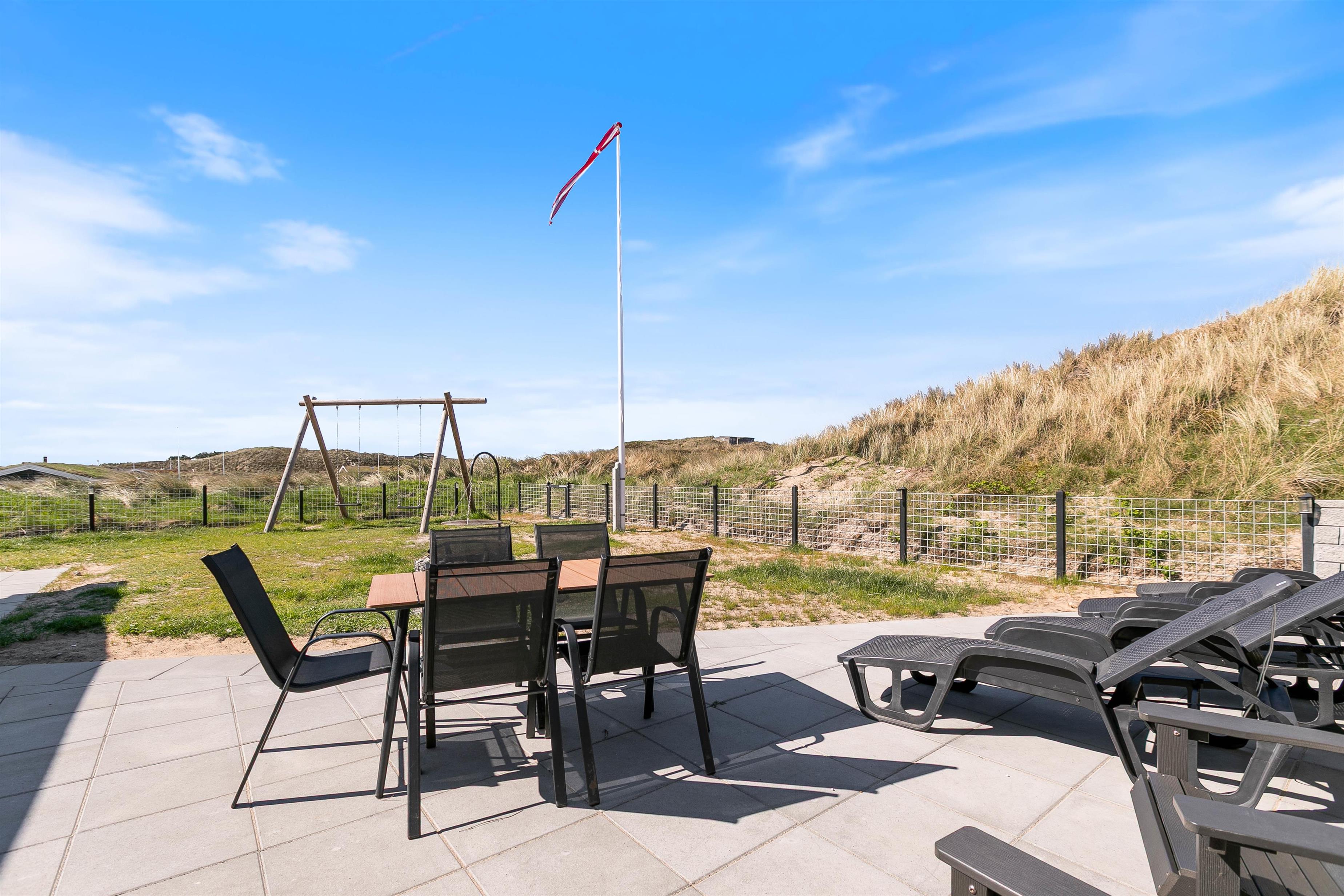 Hele haven er indhegnet, hvilket er en fordel, hvis I rejser med hunde og/eller børn. Det giver en god tryghed, så både børn og kæledyr kan lege frit uden at løbe væk. Til børnene er der også et gyngestativ, som helt sikkert vil bidrage til mange timers sjov og hygge.