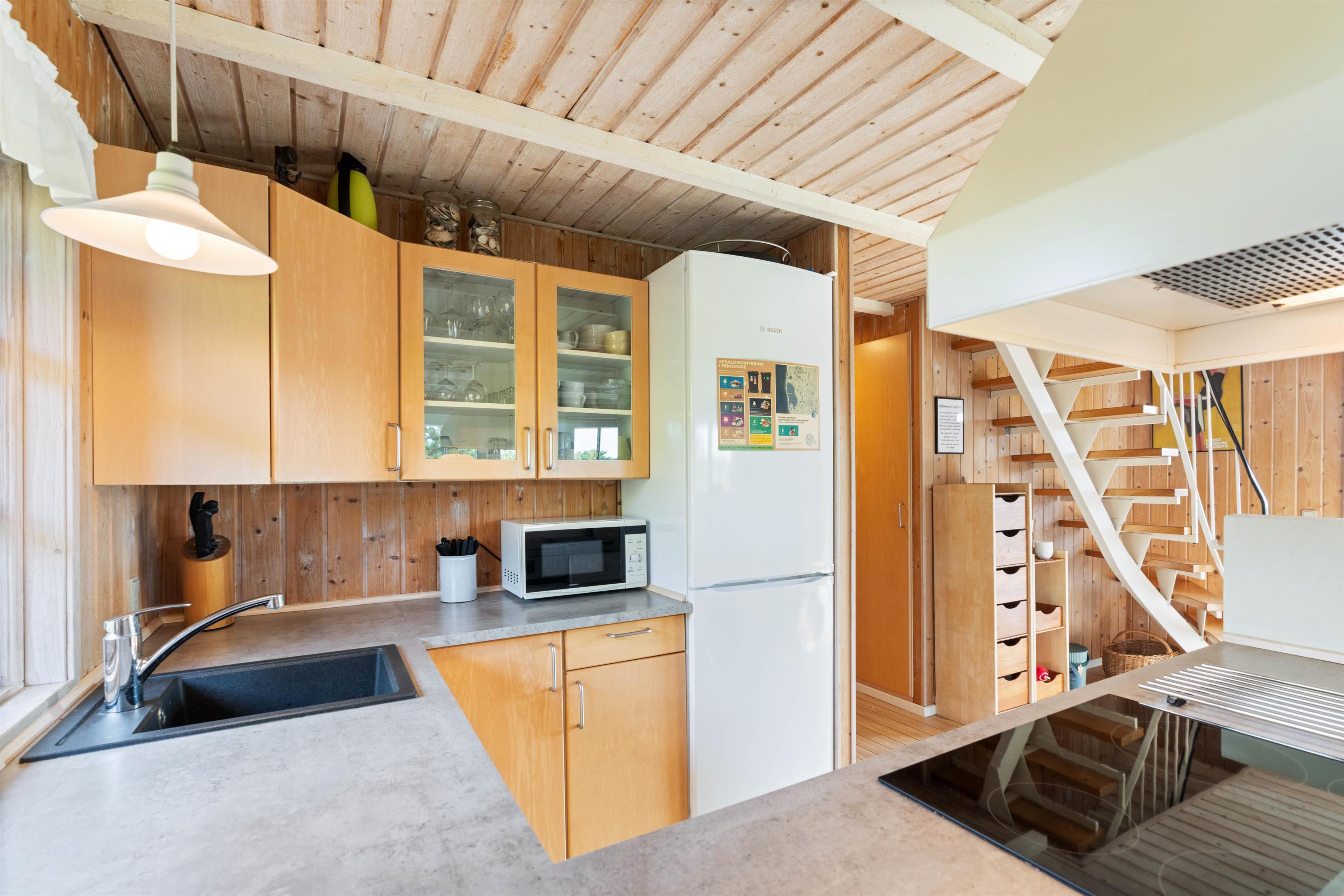 Lige så snart i træder ind i det åbne køkken/ alrum, vil I blive mødt af en rigtig hyggelig sommerhusstemning. Her har I mulighed for at have en samtale sammen, uanset om nogle står i det velindrettet køkken og tilbereder et lækkert måltid til hele familien, eller om I sidder i stuen og hygger sammen. I køkkenet finder I også en opvaskemaskine, som vil sørge for den kedelige opvask, så I i stedet kan bruge tiden på at hygge jer sammen.