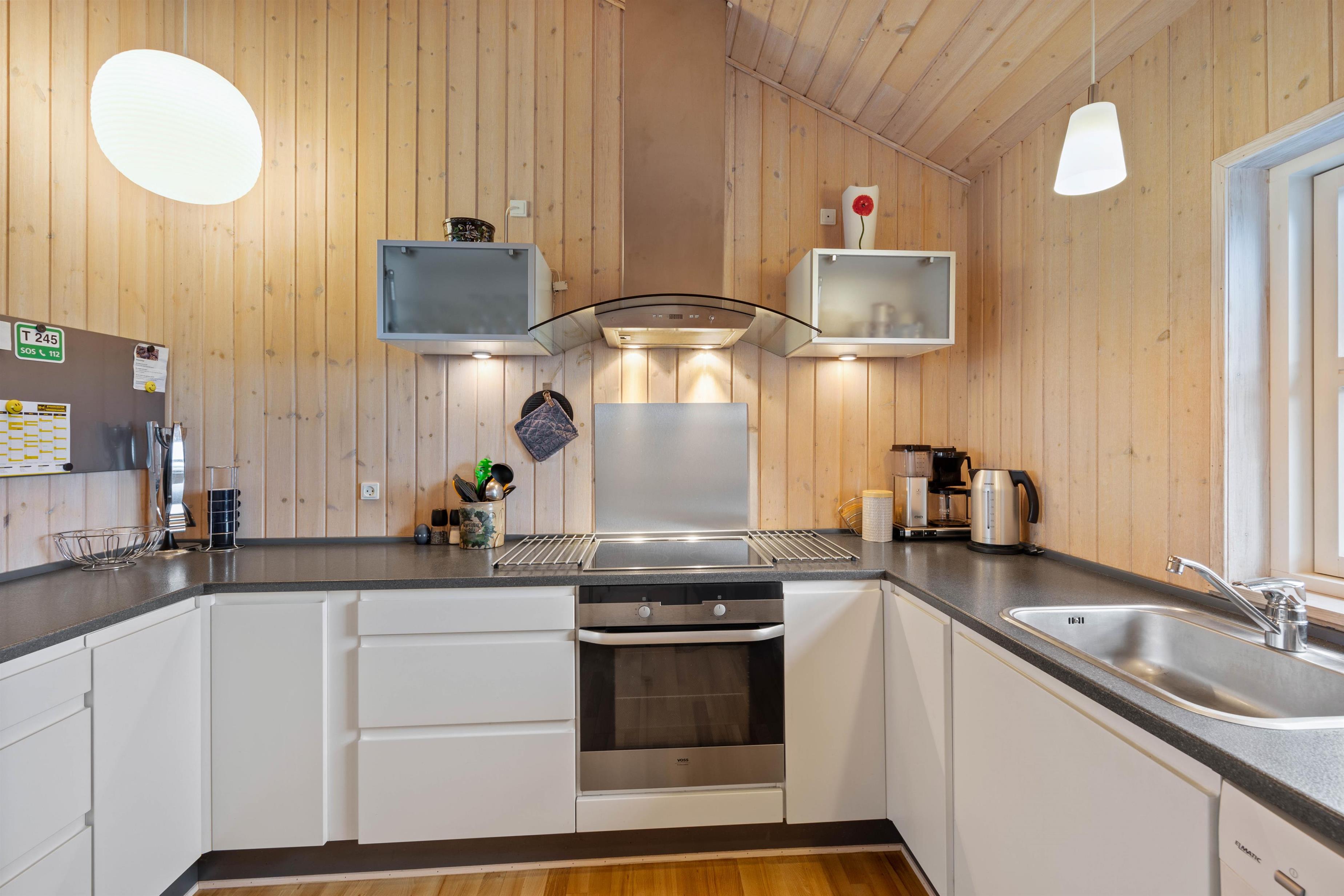 Det moderne køkken er udstyret med alt, hvad du behøver for at lave lækre måltider til familien eller vennerne. Der er også en spiseplads med plads til alle, hvor I kan samles og nyde måltiderne sammen.