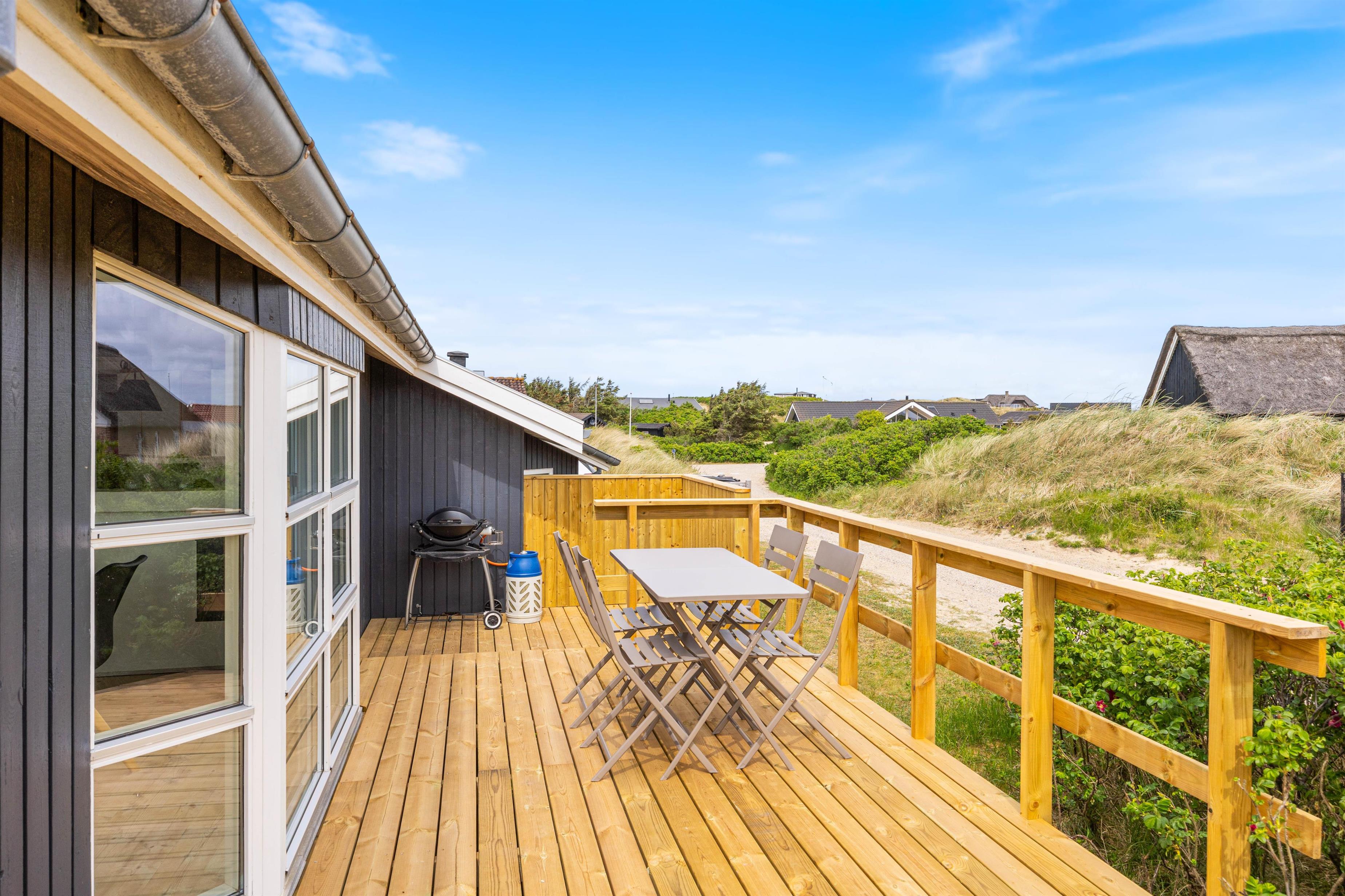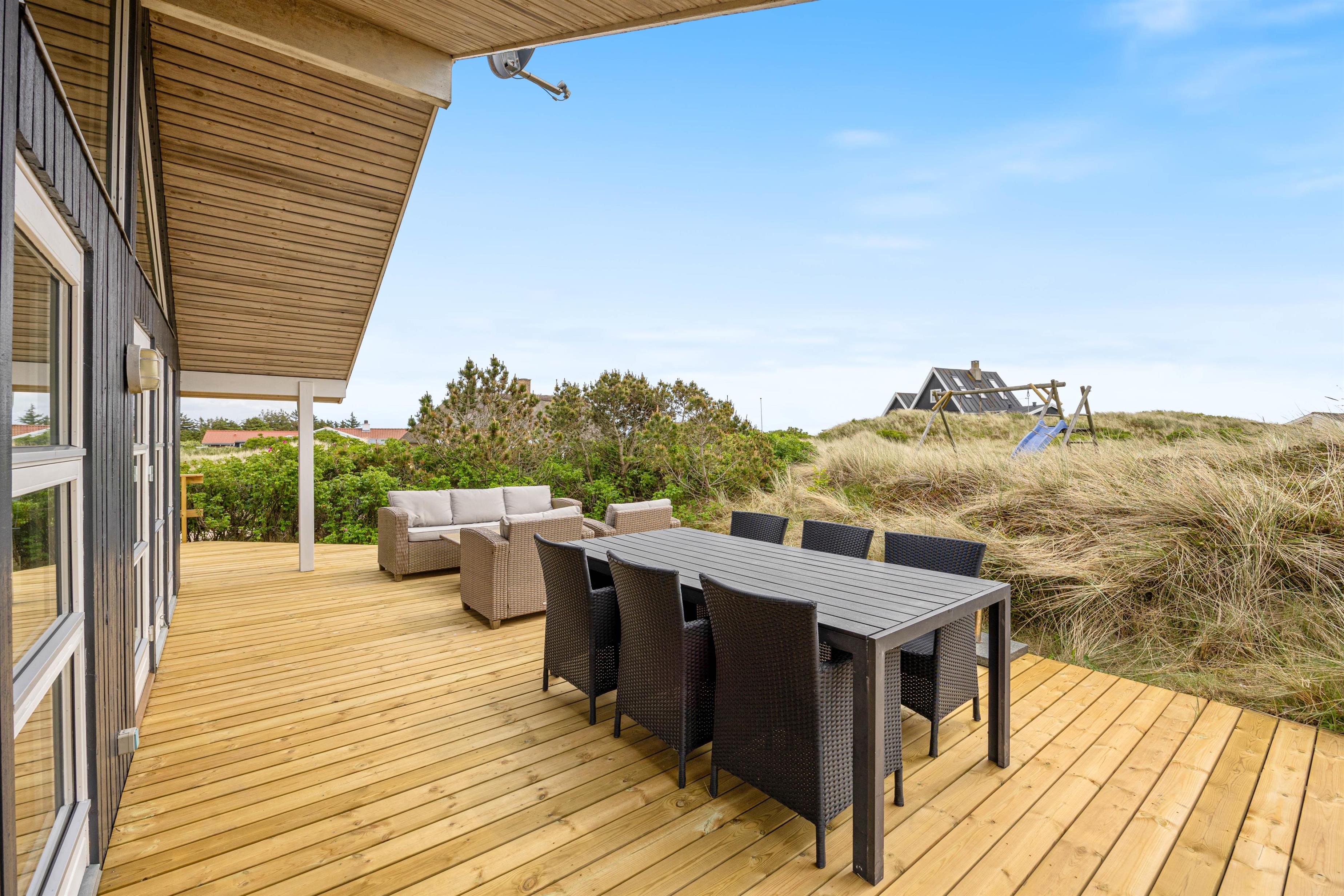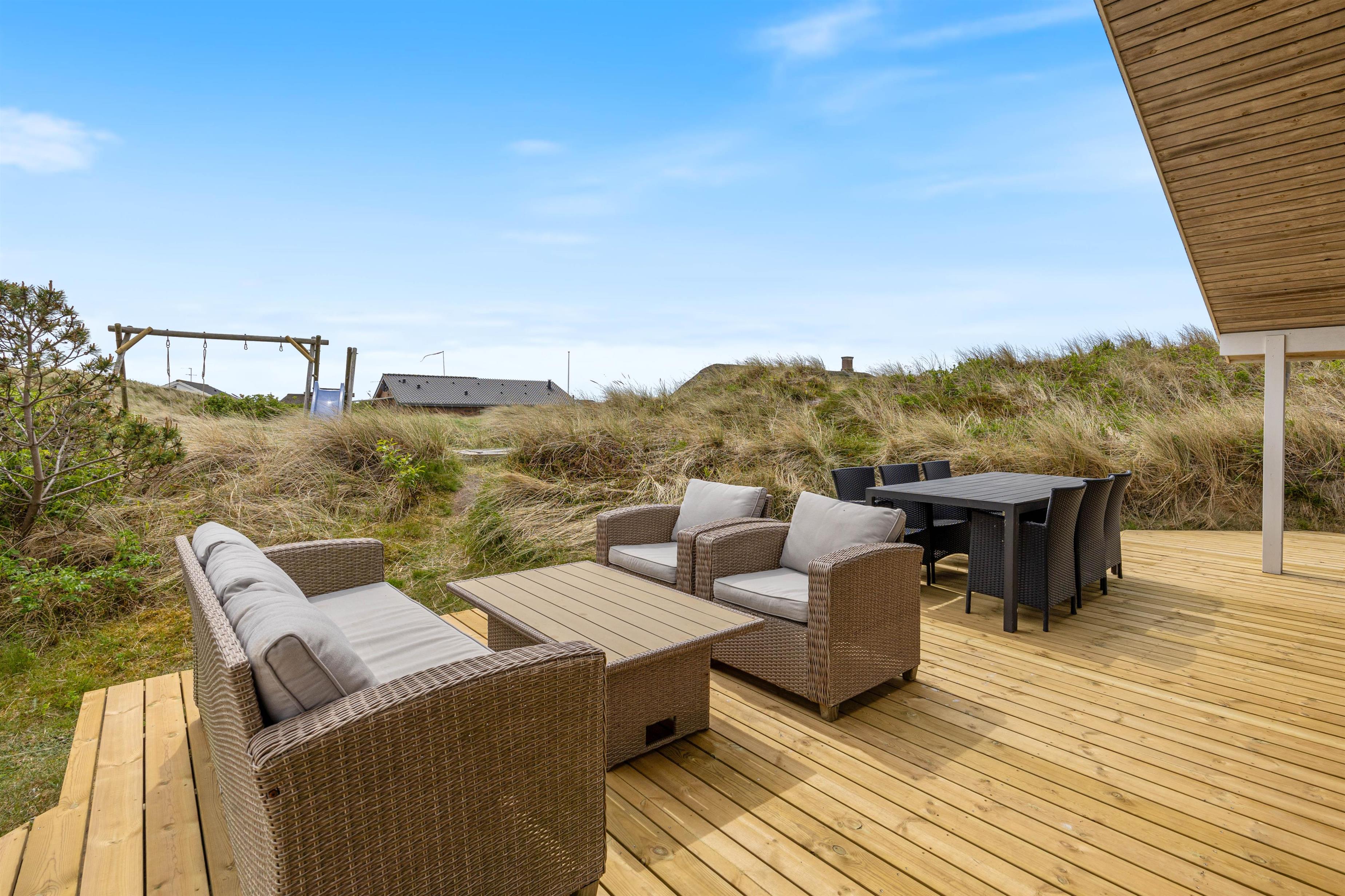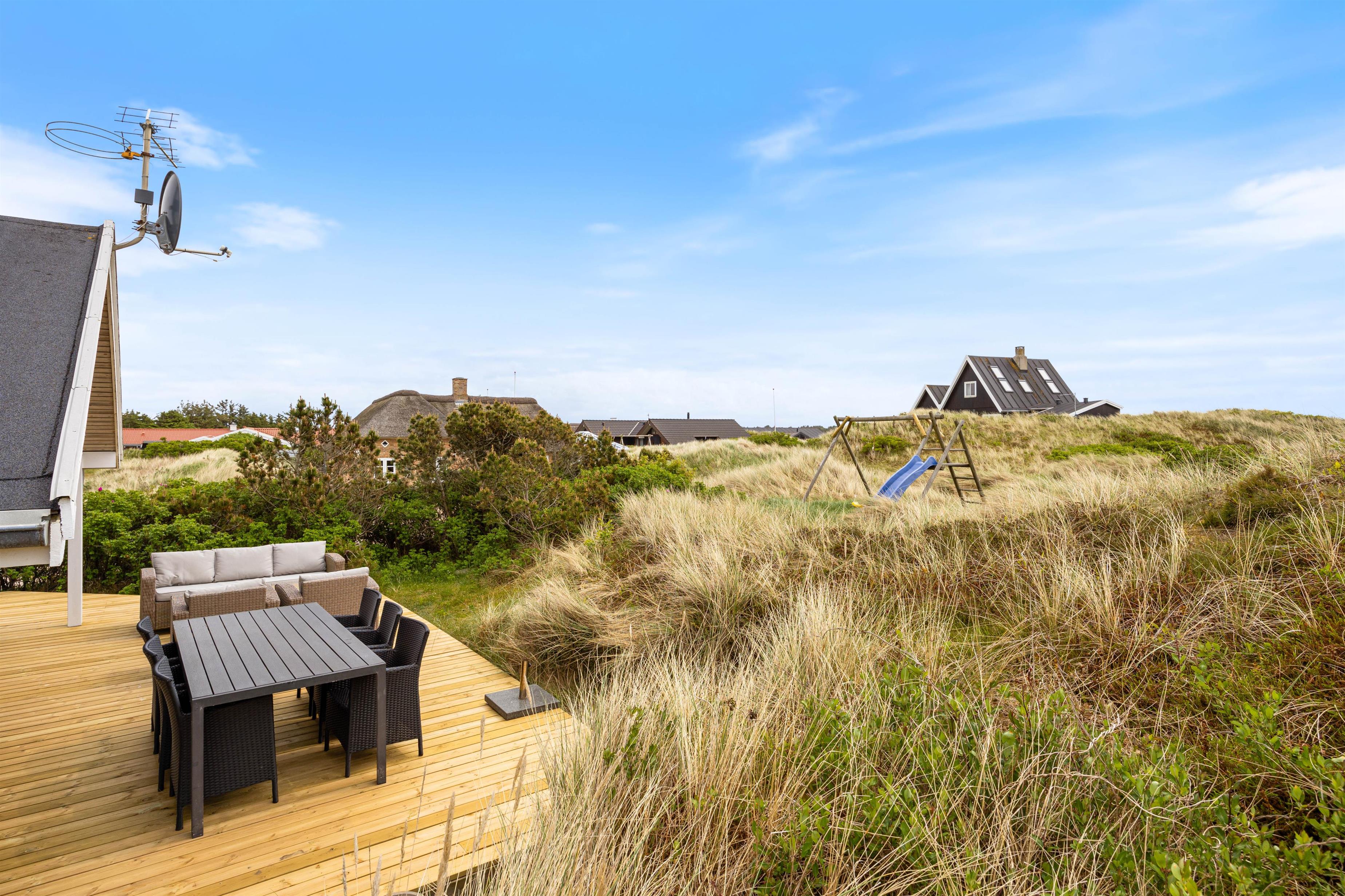 Feriehuset har en stor åben terrasse, og når vejret viser sig fra sin bedste side, er det oplagt at indtage havemøblerne og liggestolene. Høje klitter og små buske sørger for afskærmning og privatsfære, og om aftenen kan I tænde op i grillen og fejre endnu en dejlig feriedag med et lækkert grillmåltid. Udenfor er der også tænkt på de yngste feriegæster, med det dejlige gyngestativ og sandkassen, hvor de kan tilbringe mange timers leg og sjov.