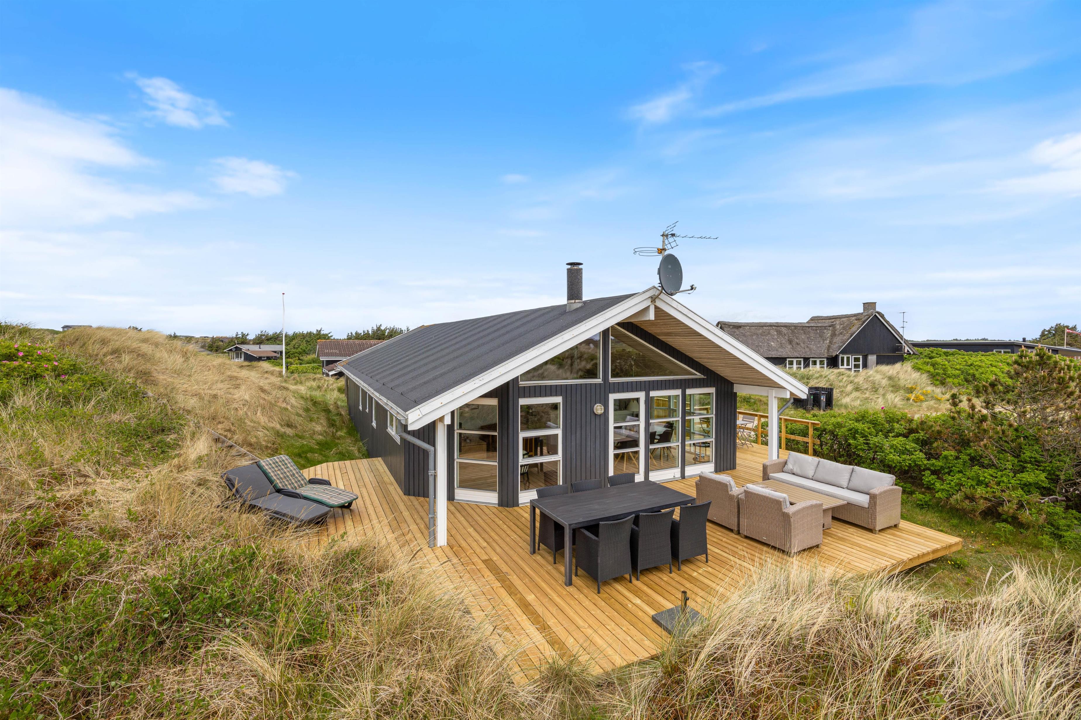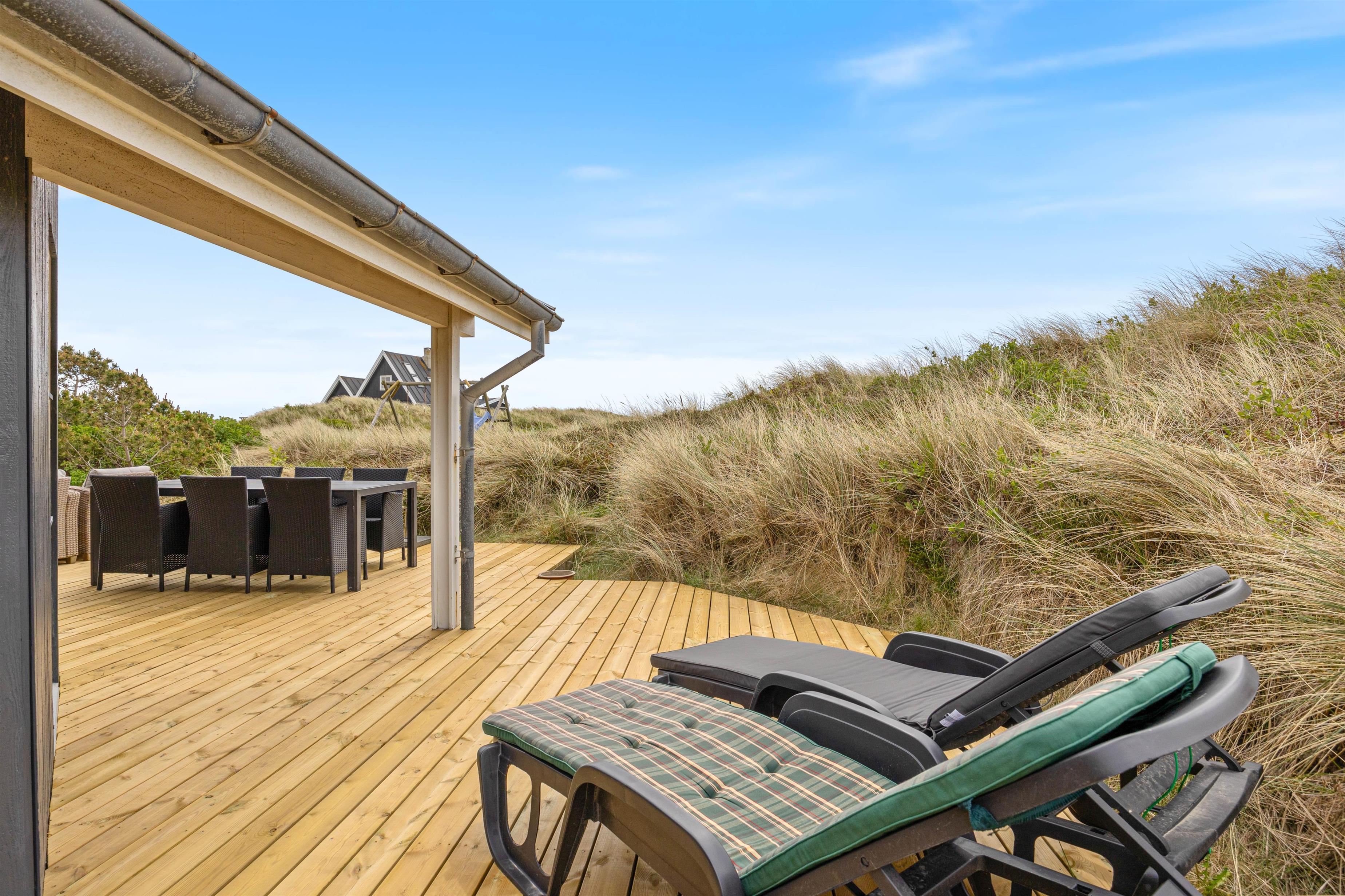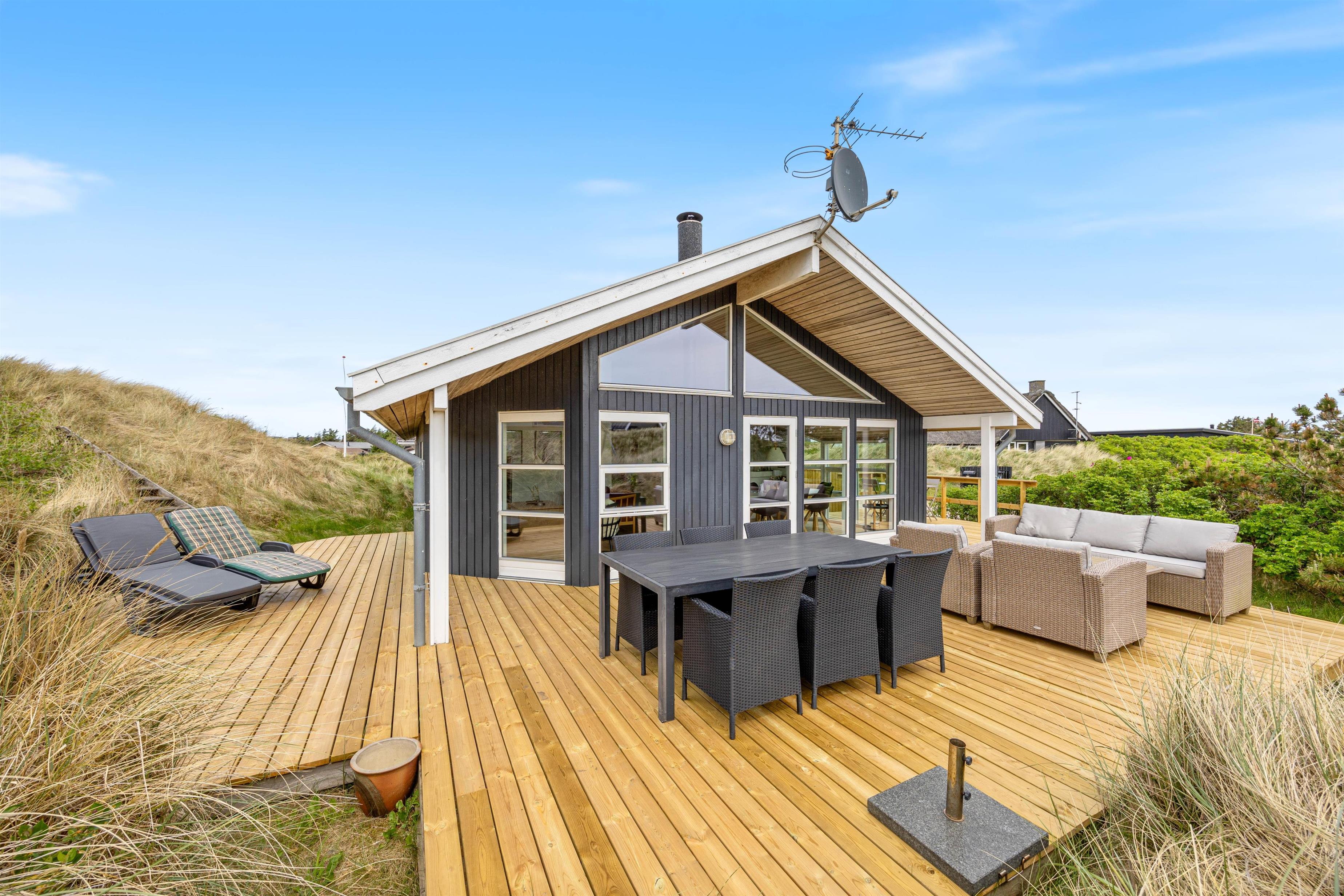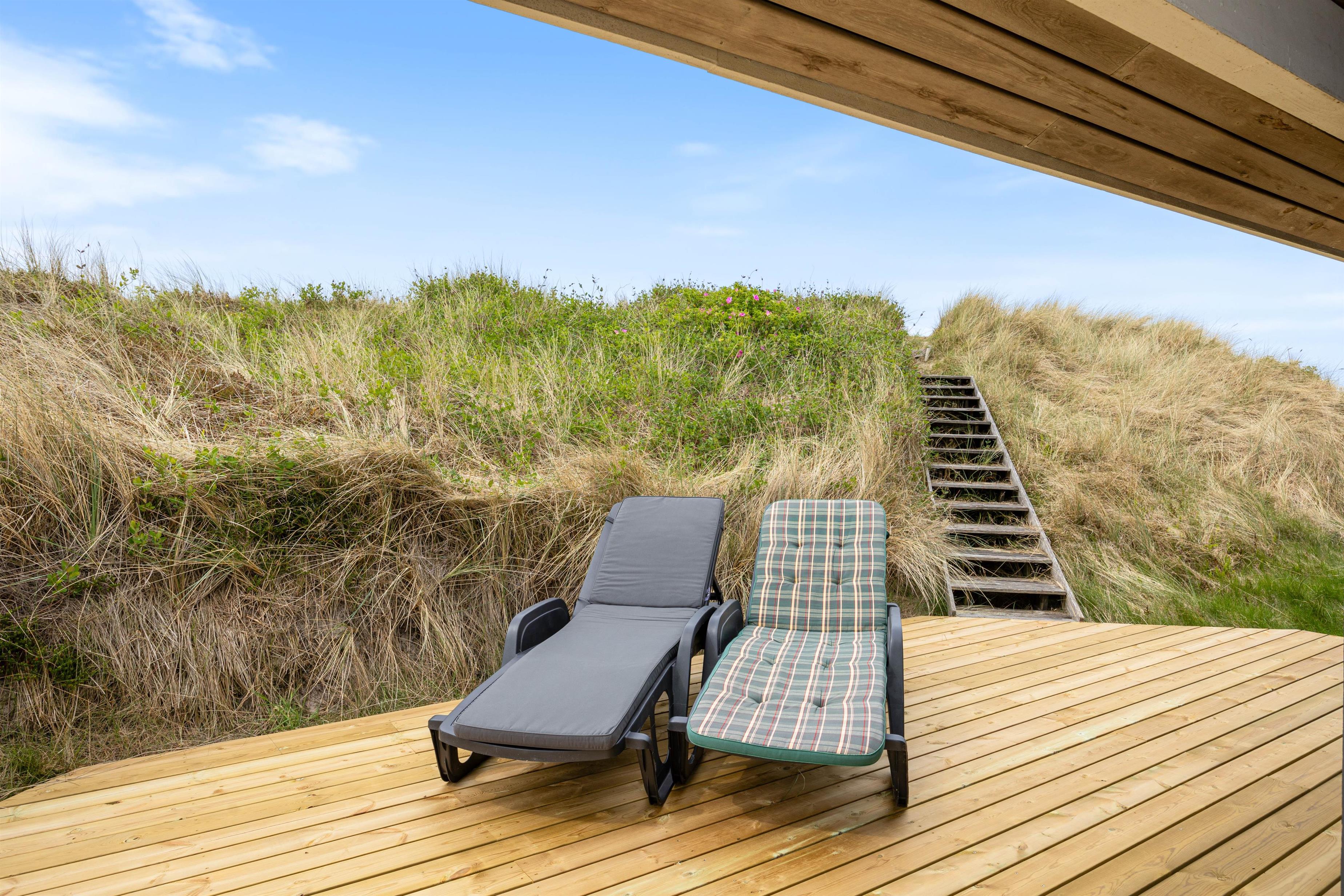 Feriehuset har en stor åben terrasse, og når vejret viser sig fra sin bedste side, er det oplagt at indtage havemøblerne og liggestolene. Høje klitter og små buske sørger for afskærmning og privatsfære, og om aftenen kan I tænde op i grillen og fejre endnu en dejlig feriedag med et lækkert grillmåltid. Udenfor er der også tænkt på de yngste feriegæster, med det dejlige gyngestativ og sandkassen, hvor de kan tilbringe mange timers leg og sjov.