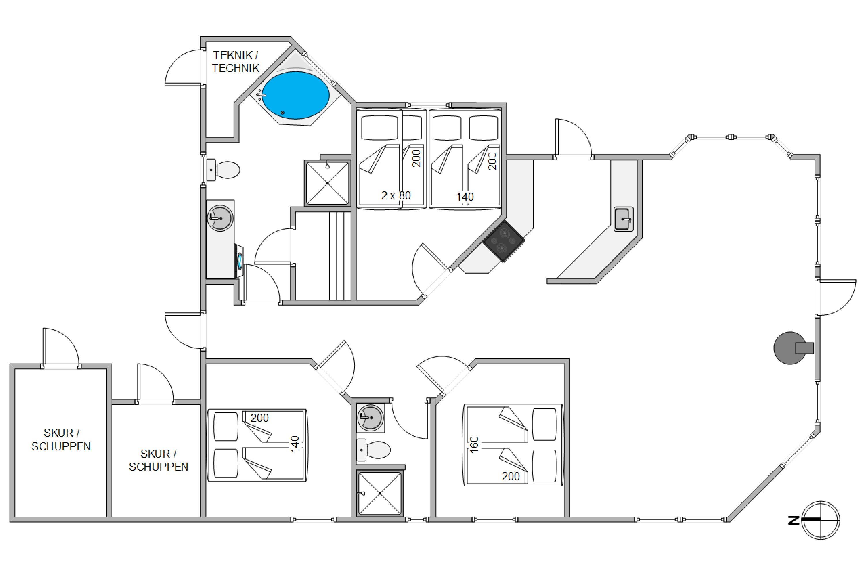 Det store opholdsrum med stue, køkken og spisebord i ét, byder op til masser af hyggelige familiestunder, og med loftet i kip og store vinduespartier bliver rummet kun endnu mere imødekommende. I centrum er den klassiske brændeovn, som vil sørge for dejlig varme og skøn feriestemning året rundt. En ekstra god overraskelse finder I på det største af de to badeværelser, hvor spabadet og saunaen står klar til at forkæle jer lidt ekstra. Og efter en lang dag ude i den friske havluft kan I hvile jer i varmen, inden det er tid til at kravle i seng.