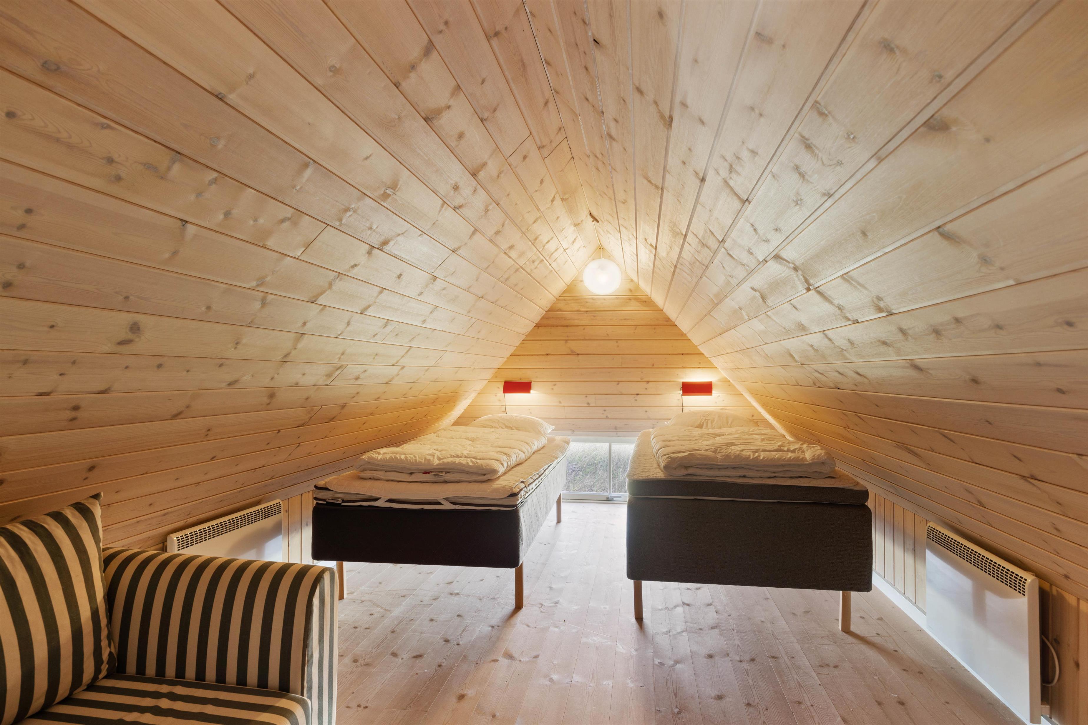 Fra opholdsrummet er der adgang til en dejlig hems via en god og praktisk trappe, der på ingen måde er stejl. Hemsen er indrettet med to enkeltsenge, en lille sofa samt et tv, hvor de lidt ældre børn kan trække sig lidt tilbage og rigtig hygge sig. Derudover er der yderligere to værelser – begge med dobbeltseng.