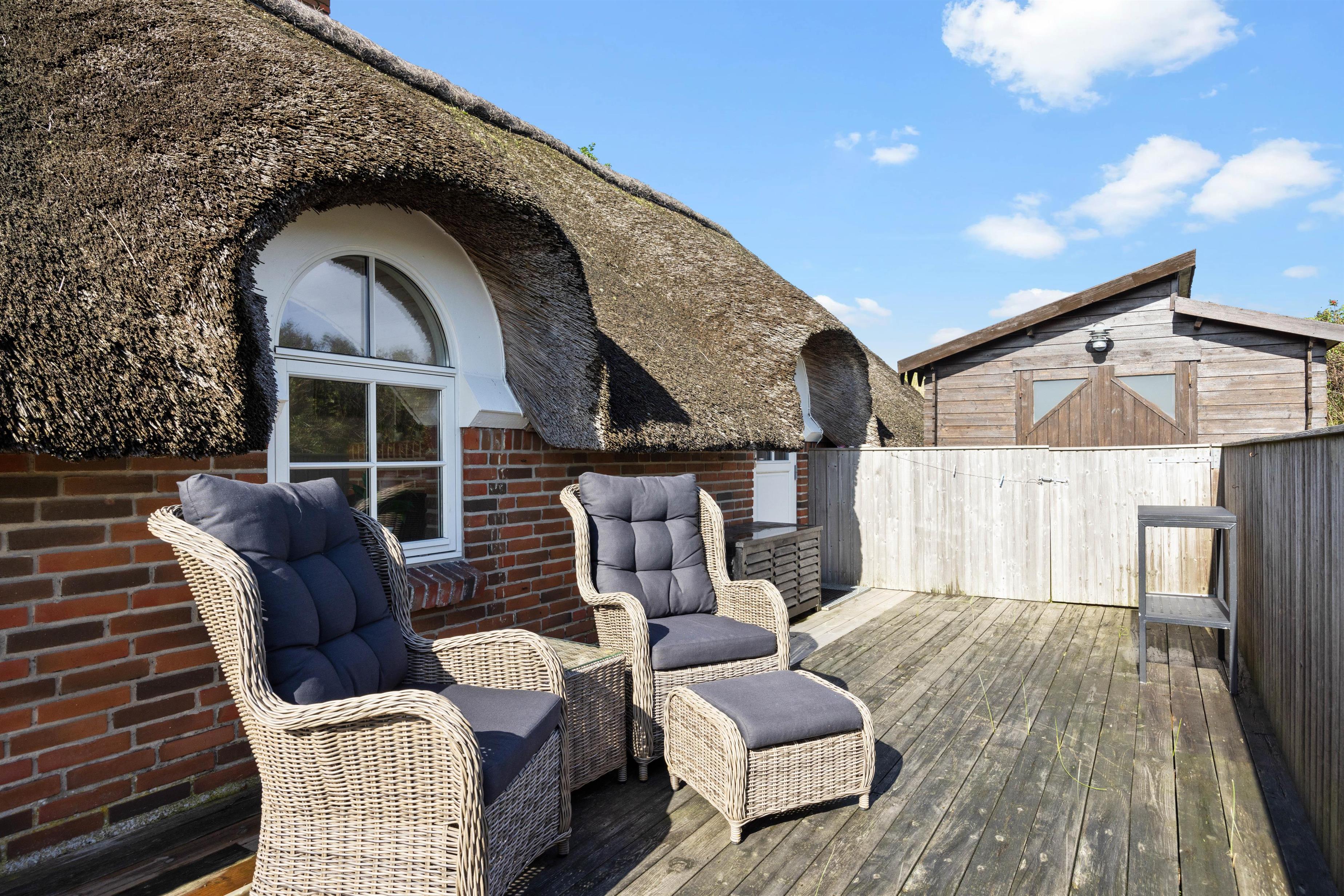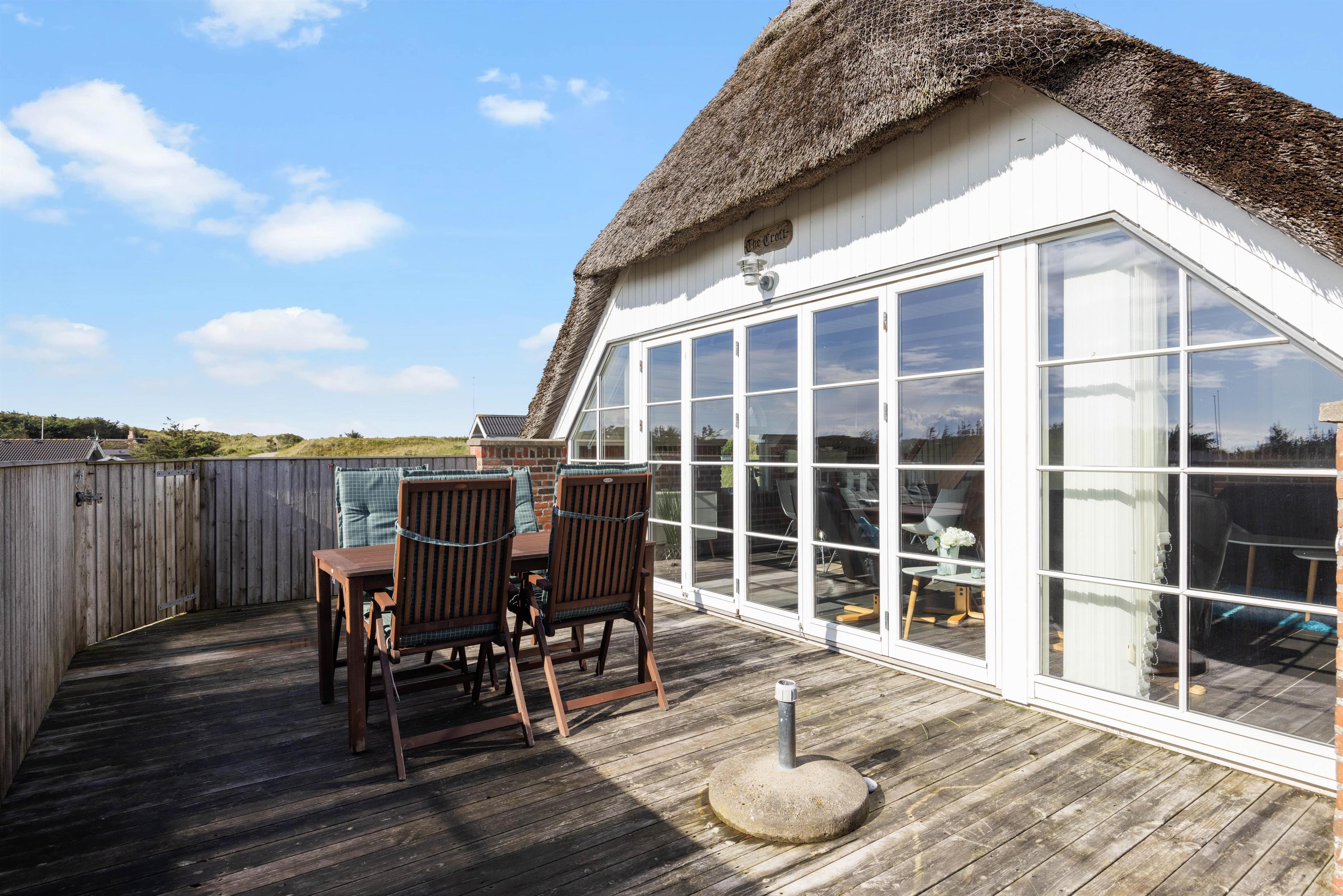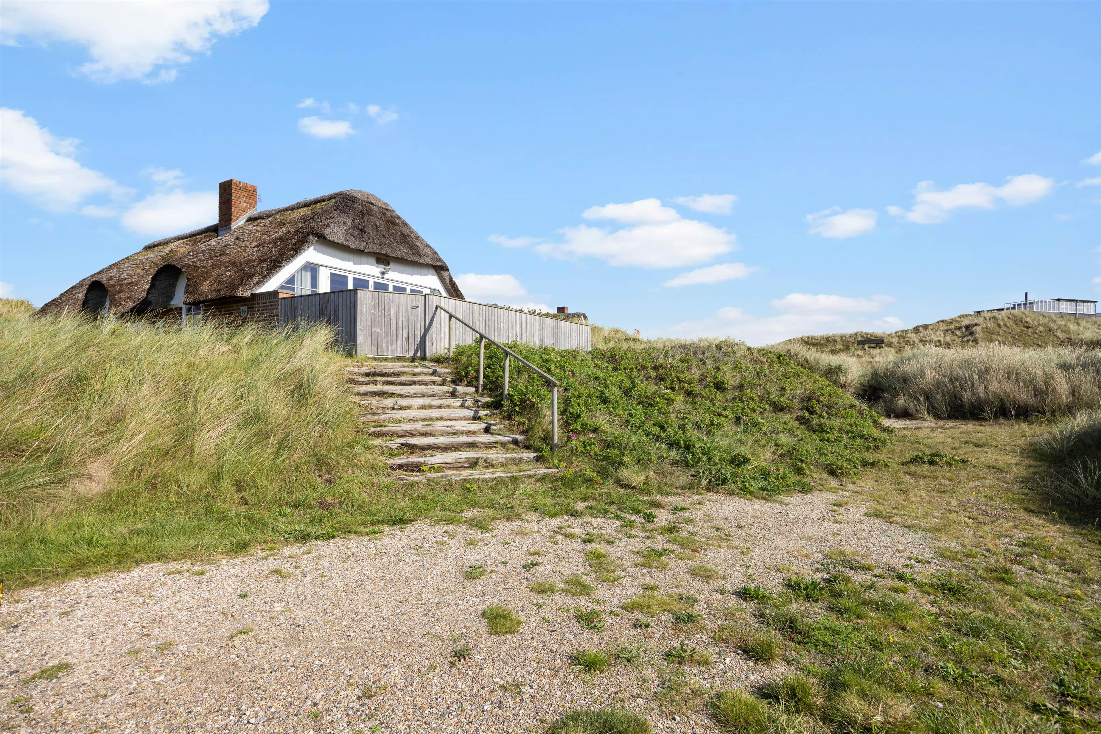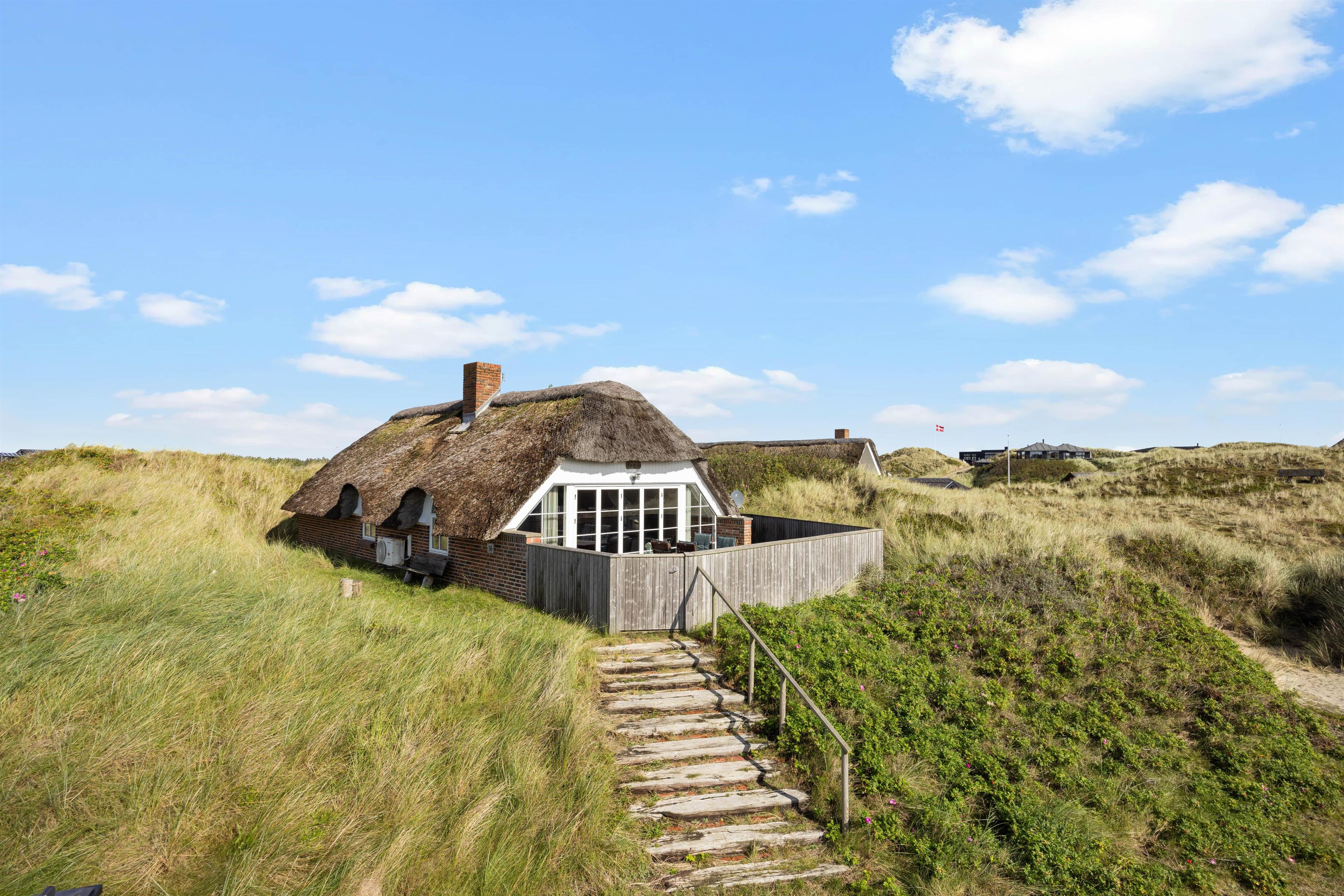 Det stråtækte sommerhus er beliggende på en stor, ugeneret og kuperet klitgrund. Fra stuen kan I træde direkte ud på husets store syd- østvendte terrasse, der er praktisk aflukket. Det gør huset ideelt til børnefamilier med mindre børn.