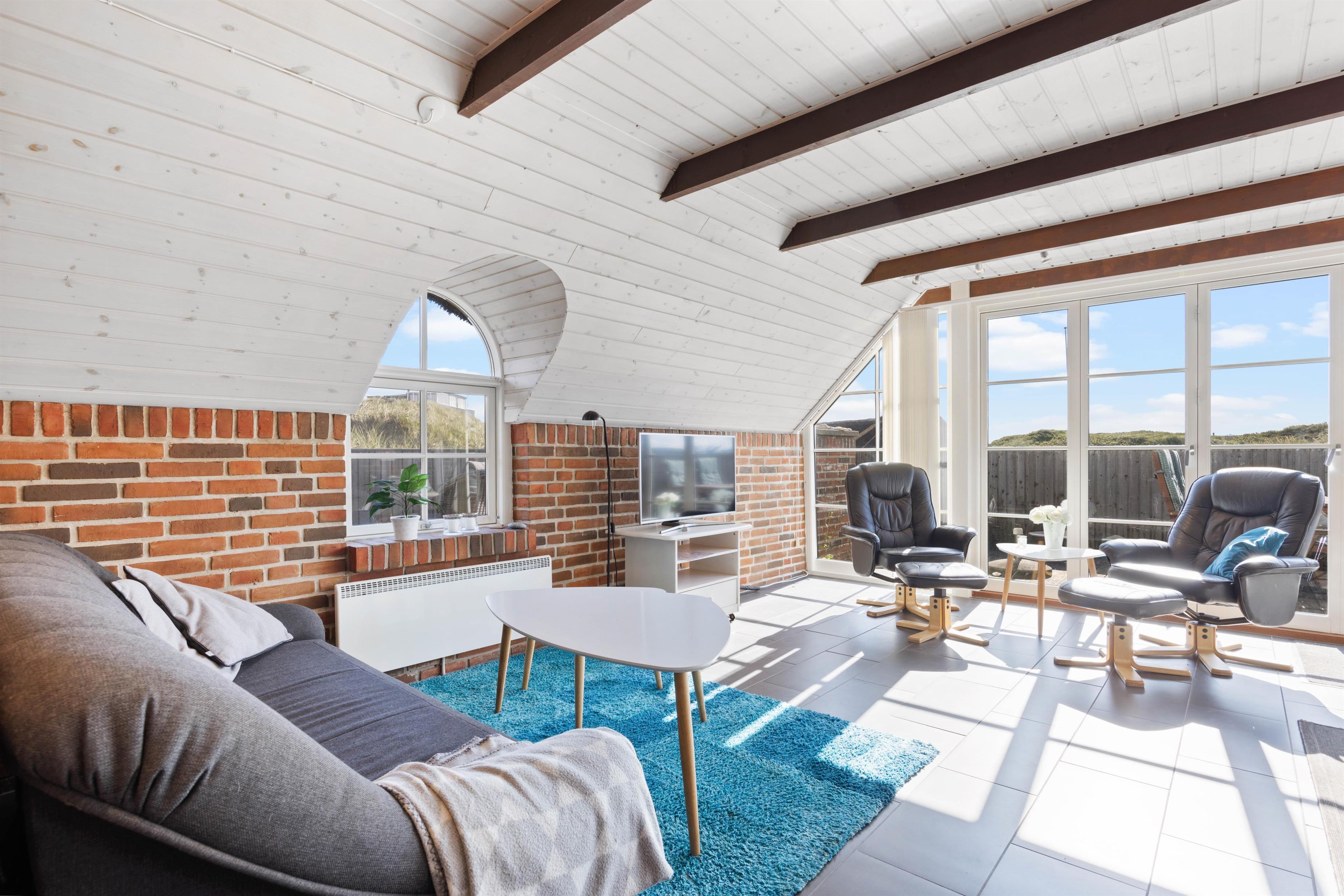 Sommerhuset er velindrettet med lyse vægge og lofter, et praktisk flisegulv og gode kvalitetsmøbler. Og de særlige detaljer, såsom de synlige bjælker og murstensvæggene er virkelig med til at give huset karakter og personlighed.