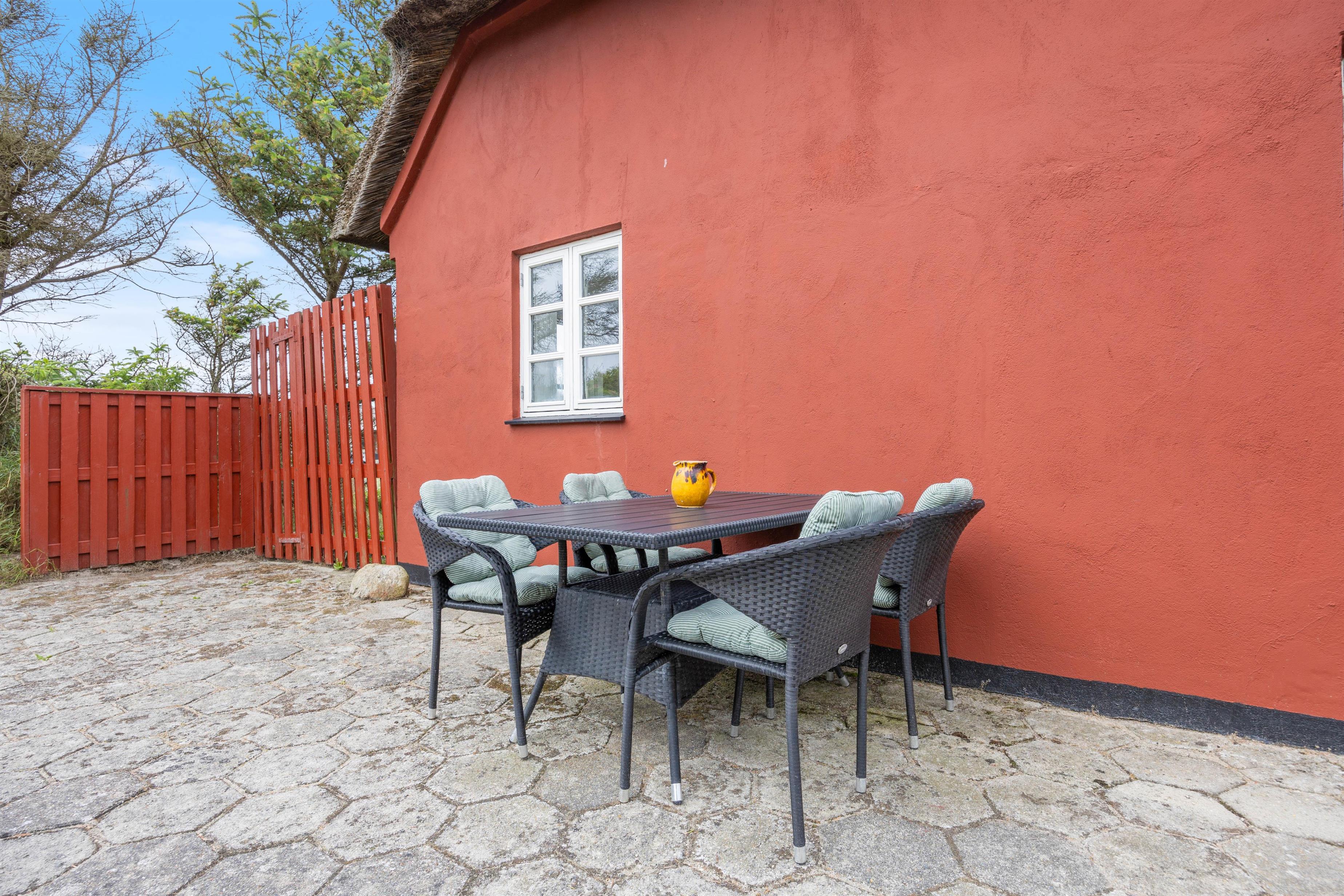 Den hyggelige delvis lukkede terrasse bidrager til samme romantiske bondegårdsidyl, som resten af det røde stråtækte hus. Her kan I nyde morgenkaffen i selskab med strunke stokroser, svajende græsser og sødmefyldte hybenbuske. Mere idyllisk bliver det næppe. I sommerhalvåret har de mindre børn mulighed for en dejlig gyngetur og mulighed for at lege i sandkassen.