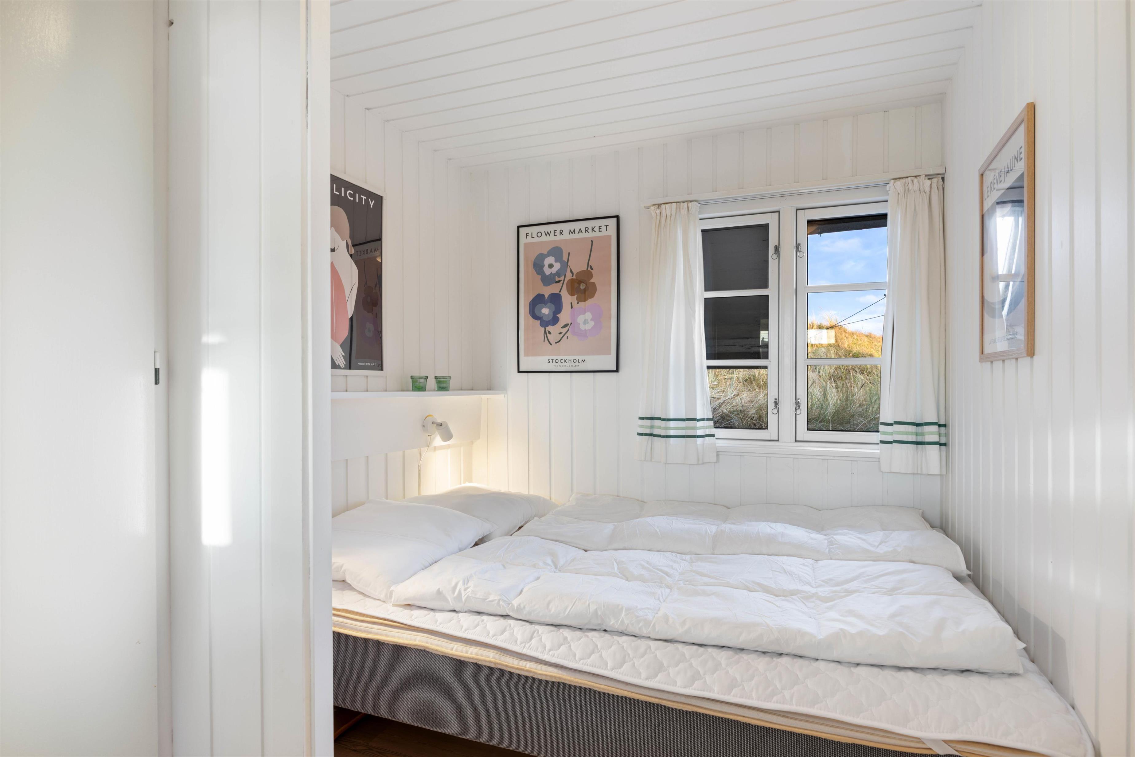 Stemningen i sommerhuset i Houvig emmer af ægte sommerhusidyl. Det kan til dels tilskrives den knitrende brændeovn, de panelbeklædte vægge og ikke mindst den mageløs udsigt, der møder jer, så snart I vender blikket mod vinduerne. Man mærker virkelig den vestjyske natur helt tæt på.