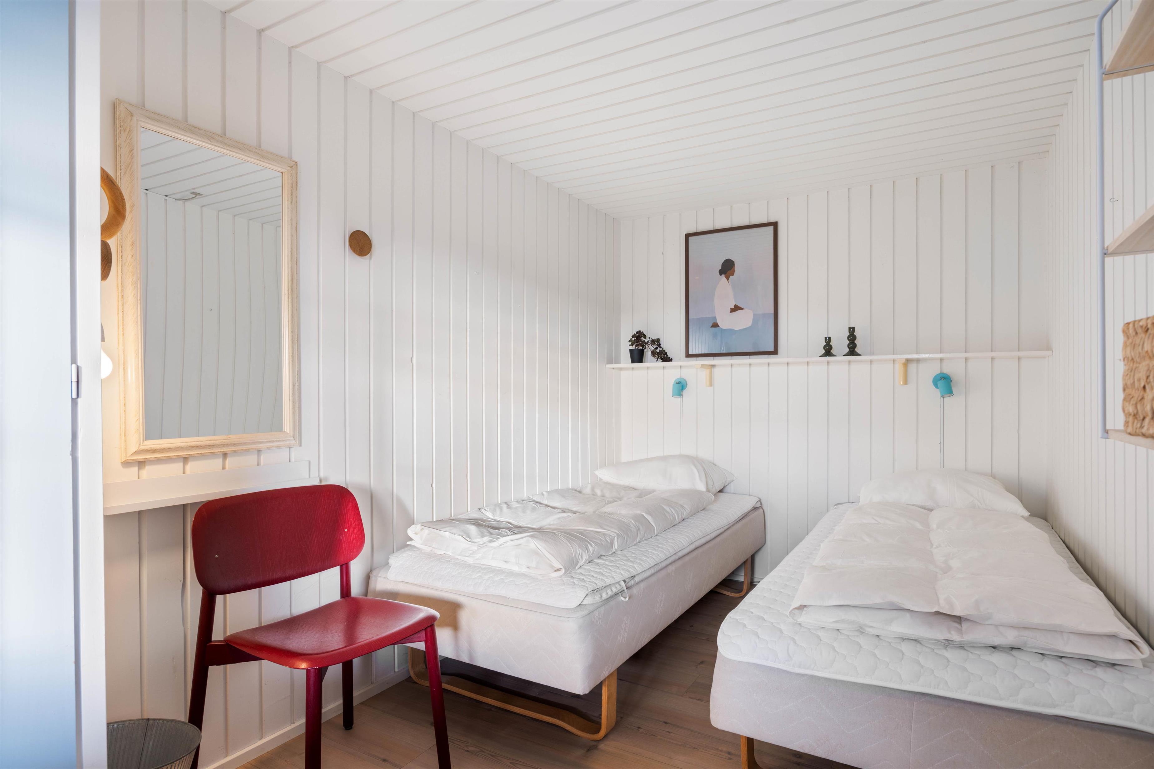Sommerhuset er indrettet med 3 gode værelser, hvoraf 1 værelse er udstyret med en komfortabel dobbeltseng. De resterende 2 værelser har henholdsvis 2 enkeltsenge og køjeseng med 2 pladser. Herudover er der et praktisk nyrenoveret badeværelse med bruseniche fra 2025. Feriehusets varmtvandsbeholder er på 30 Liter.