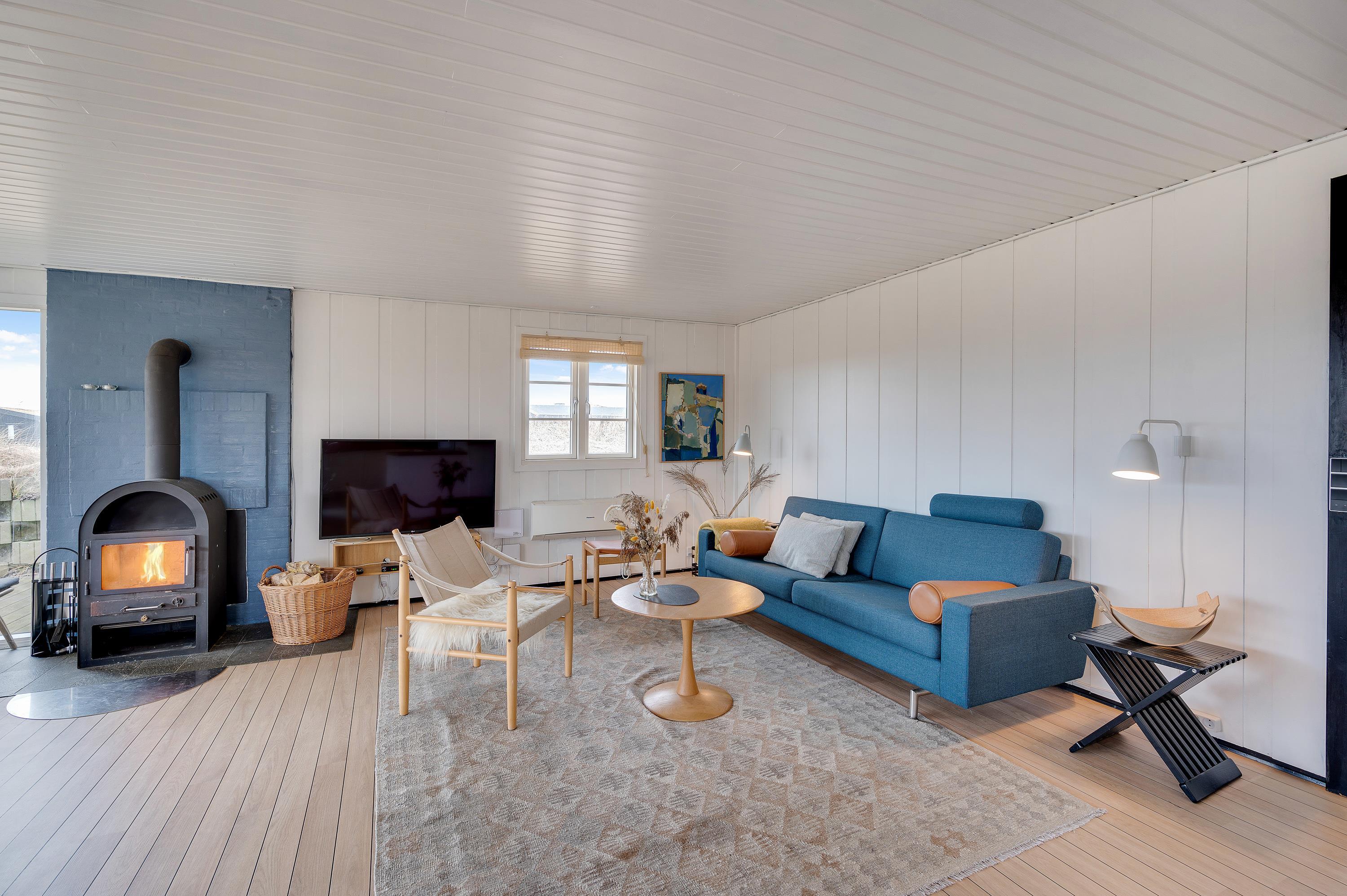 Moderne indretning med brændeovn, varmepumpe og Chromecast