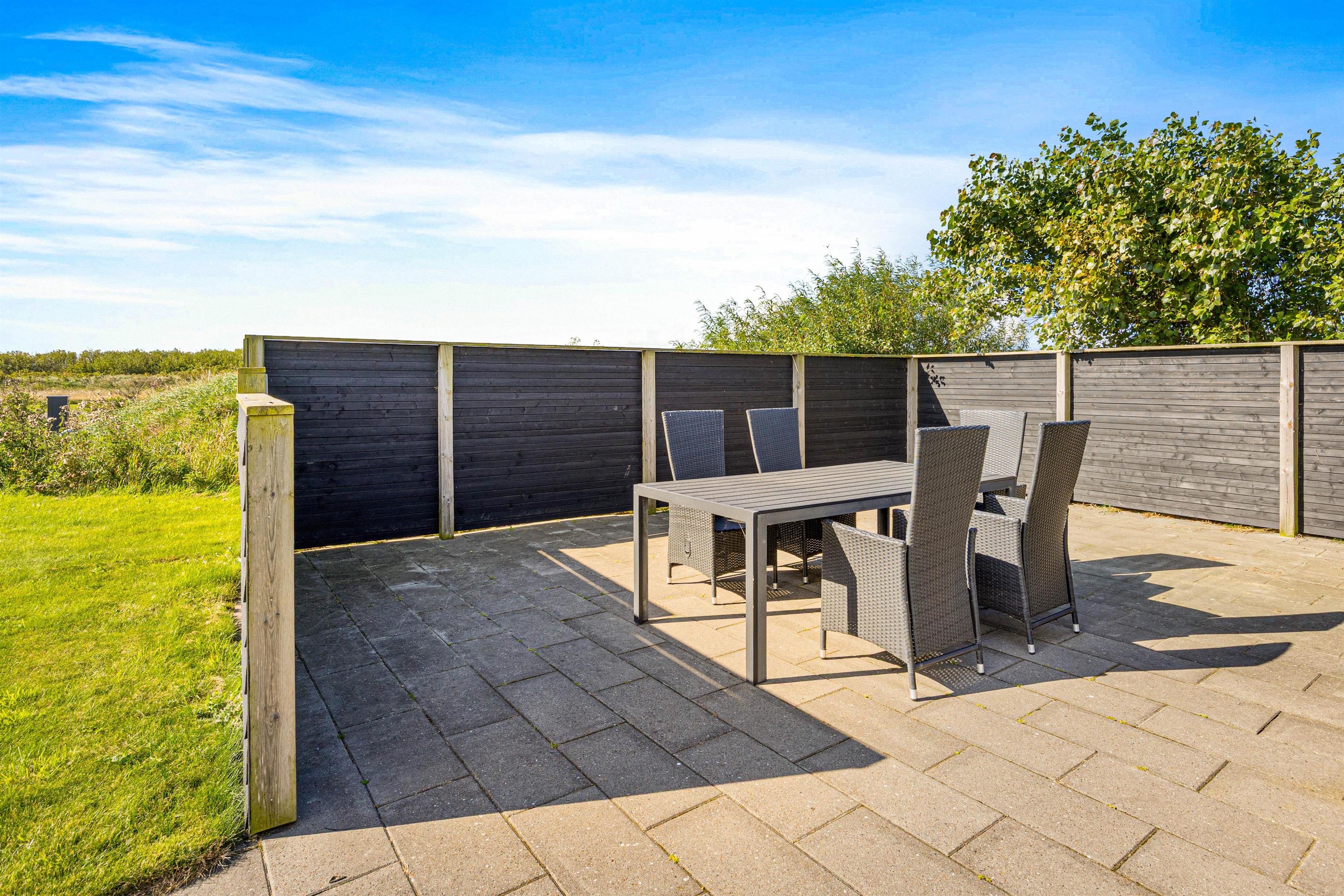 Fra opholdsrummet er der udgang til den østvendte, afskærmede terrasse. Nyd en friskbrygget kop kaffe ved havebordet i morgensolen, eller læn jer tilbage i liggestolene og tank nye kræfter på en solrig sommerdag. Mens I slapper af, kan børnene spille bold på den tilhørende fodboldbane eller volleyballbane, som deles med de to ferielejligheder ved siden af. Her er masser af mulighed for sjov og leg!