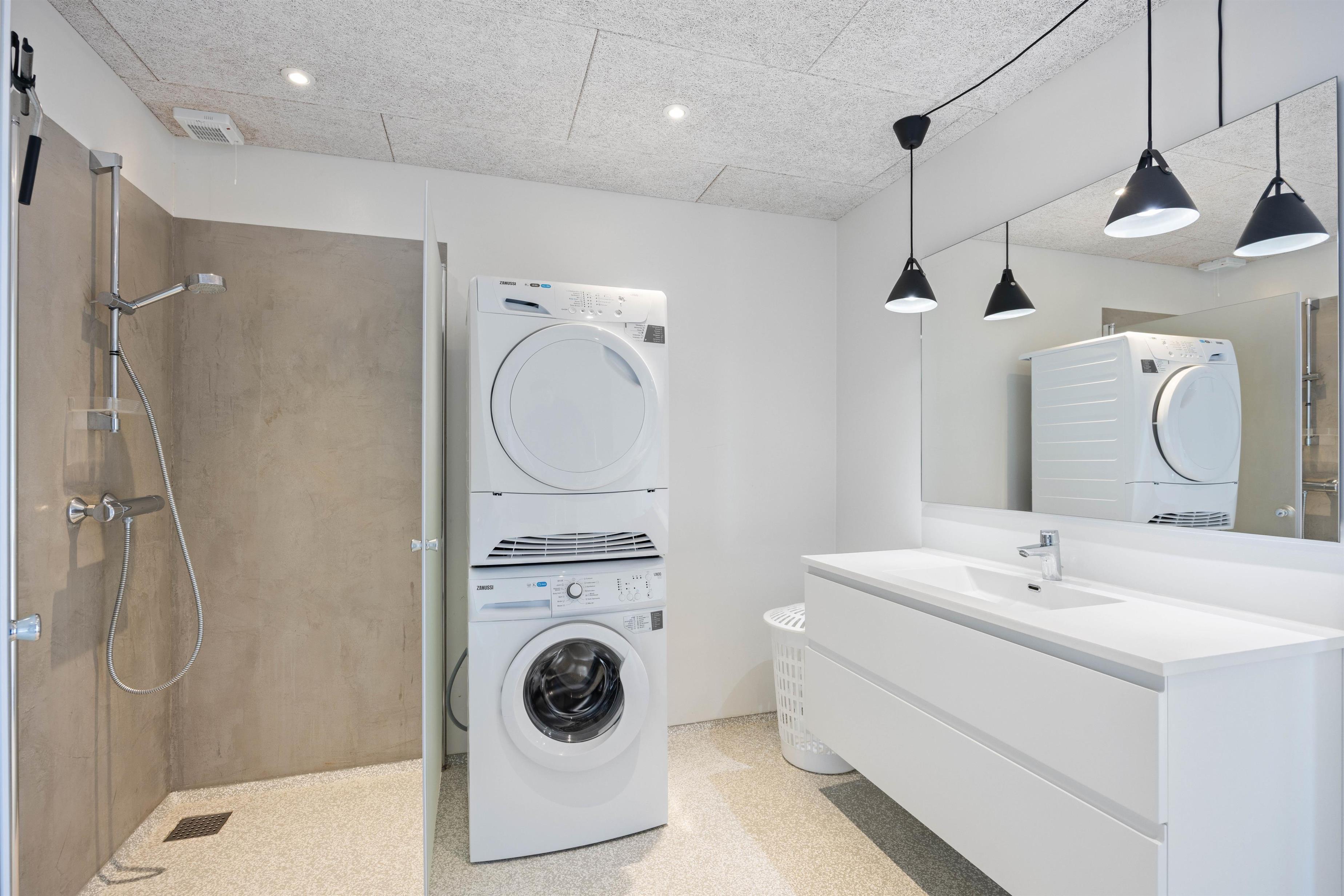 Indretningen indeholder gode praktiske faciliteter, som giver en hjælpende hånd med, når de huslige pligter skal overstås - både opvaskemaskine i køkkenet og vaskemaskine og tørretumbler. Badeværelset er udstyret med gulvvarme og en god bruseniche.