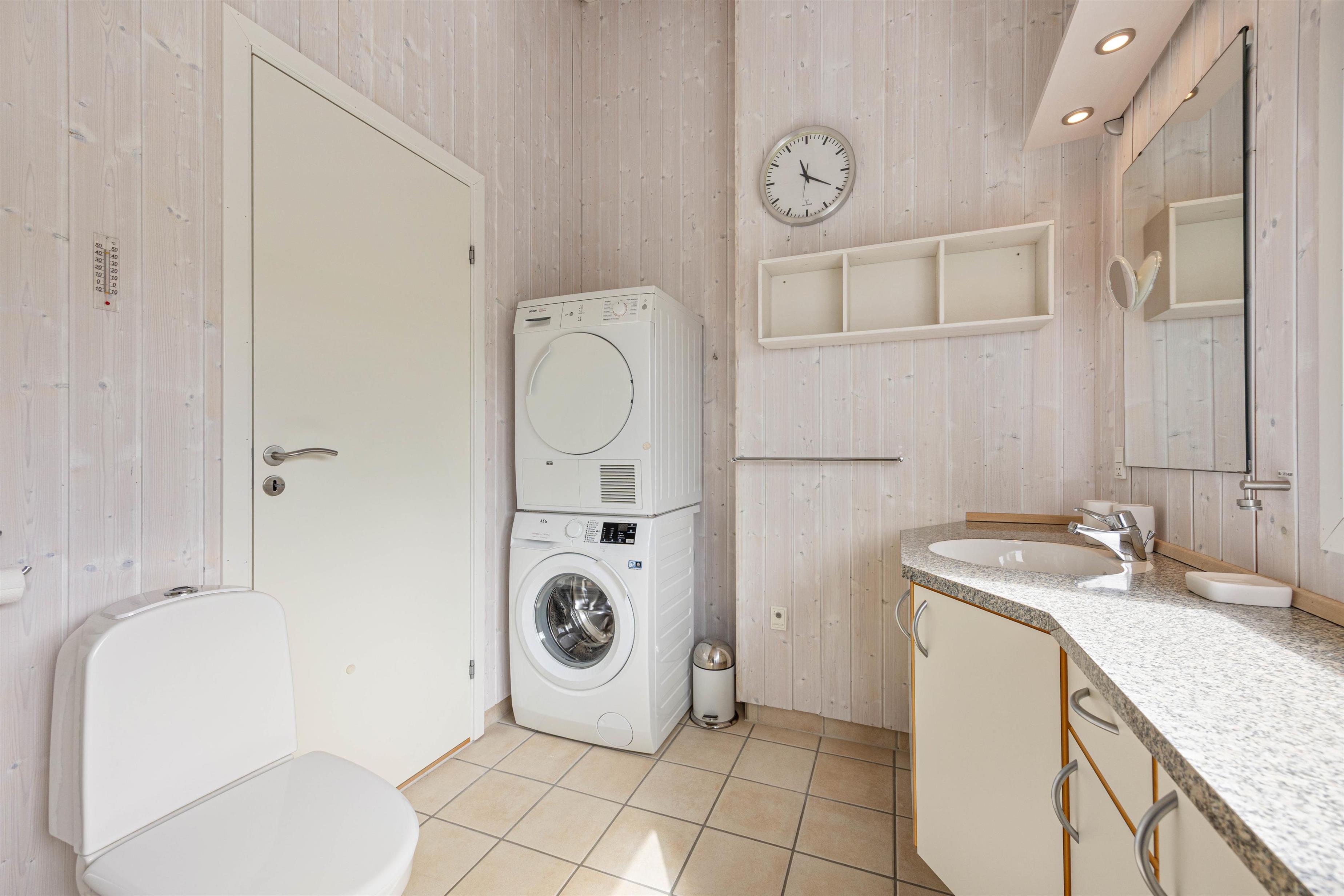 Sommerhusets køkken-alrum er særligt hyggeligt, og her er der virkelig skruet op for hyggen. Gennem de store vinduespartier kan I nyde en helt enestående panoramaudsigt, mens de samtidig sørger for et godt lysindfald. På kølige aftener kan du tænde op i brændeovnen, som spreder en hyggelig varme og skaber den perfekte atmosfære til familiestunder. Alternativt kan luft-til-luft-varmepumpen sørge for en behagelig temperatur året rundt, og badeværelset er udstyret med gulvvarme, så kolde fødder bliver ikke et problem.