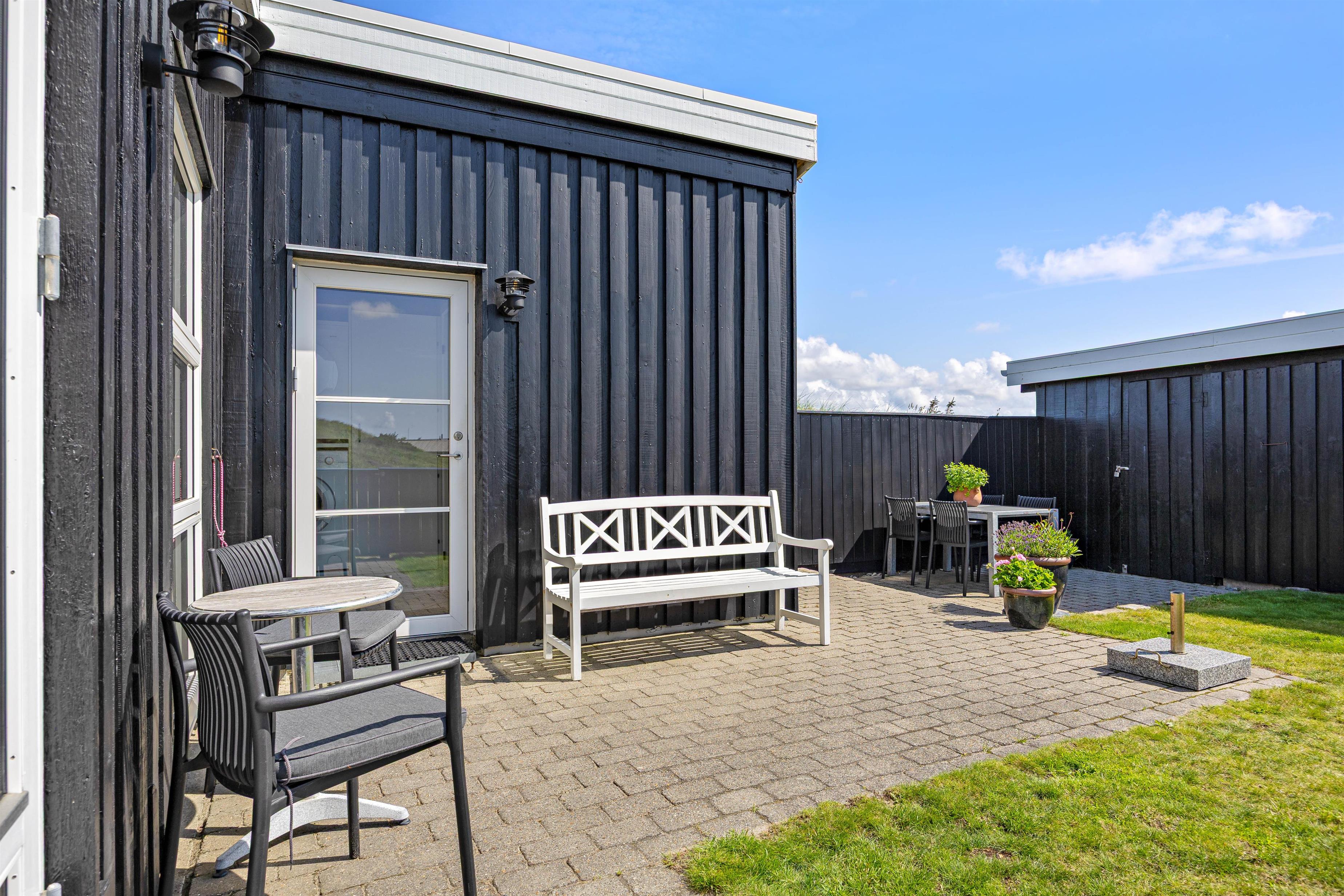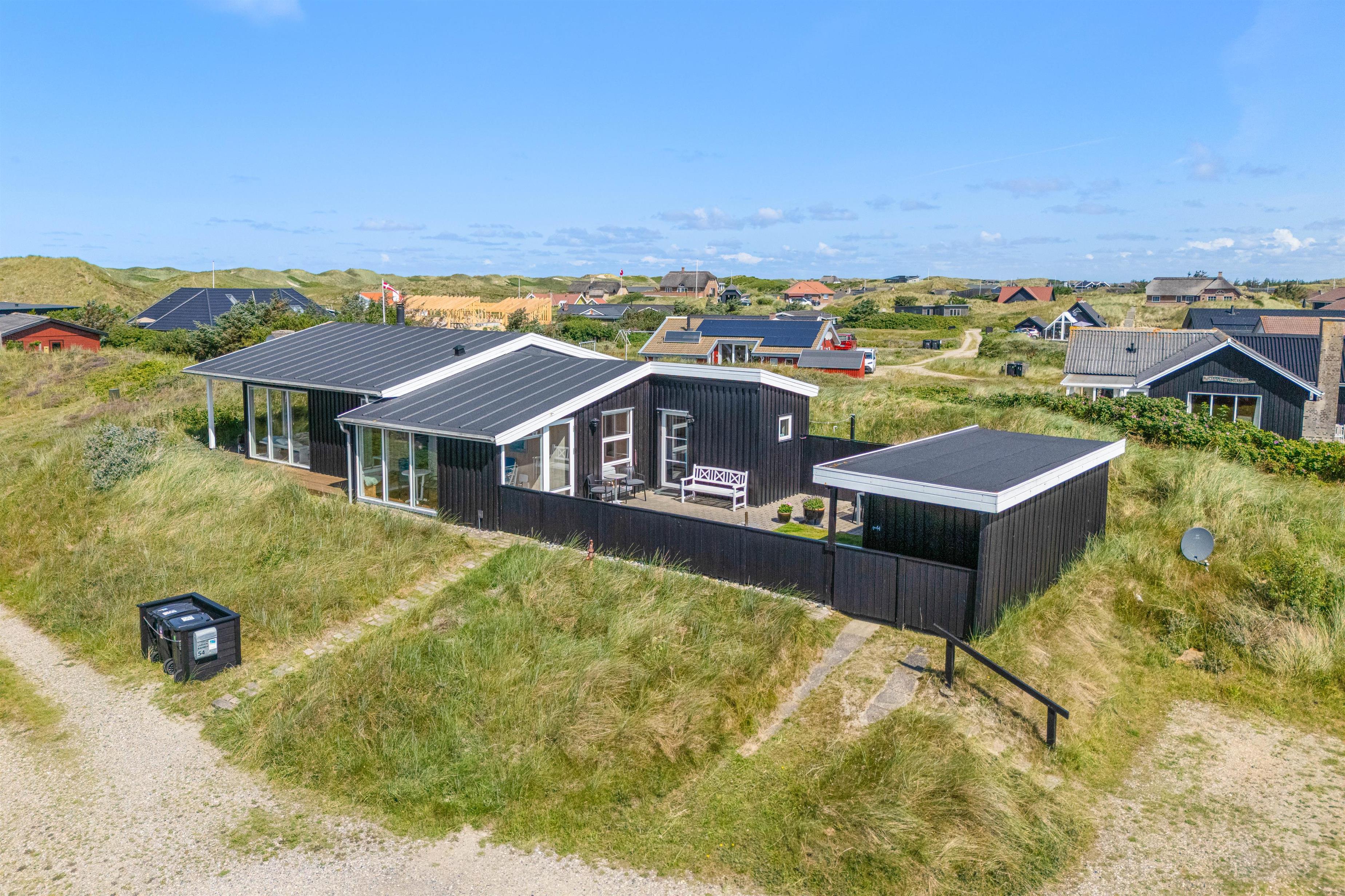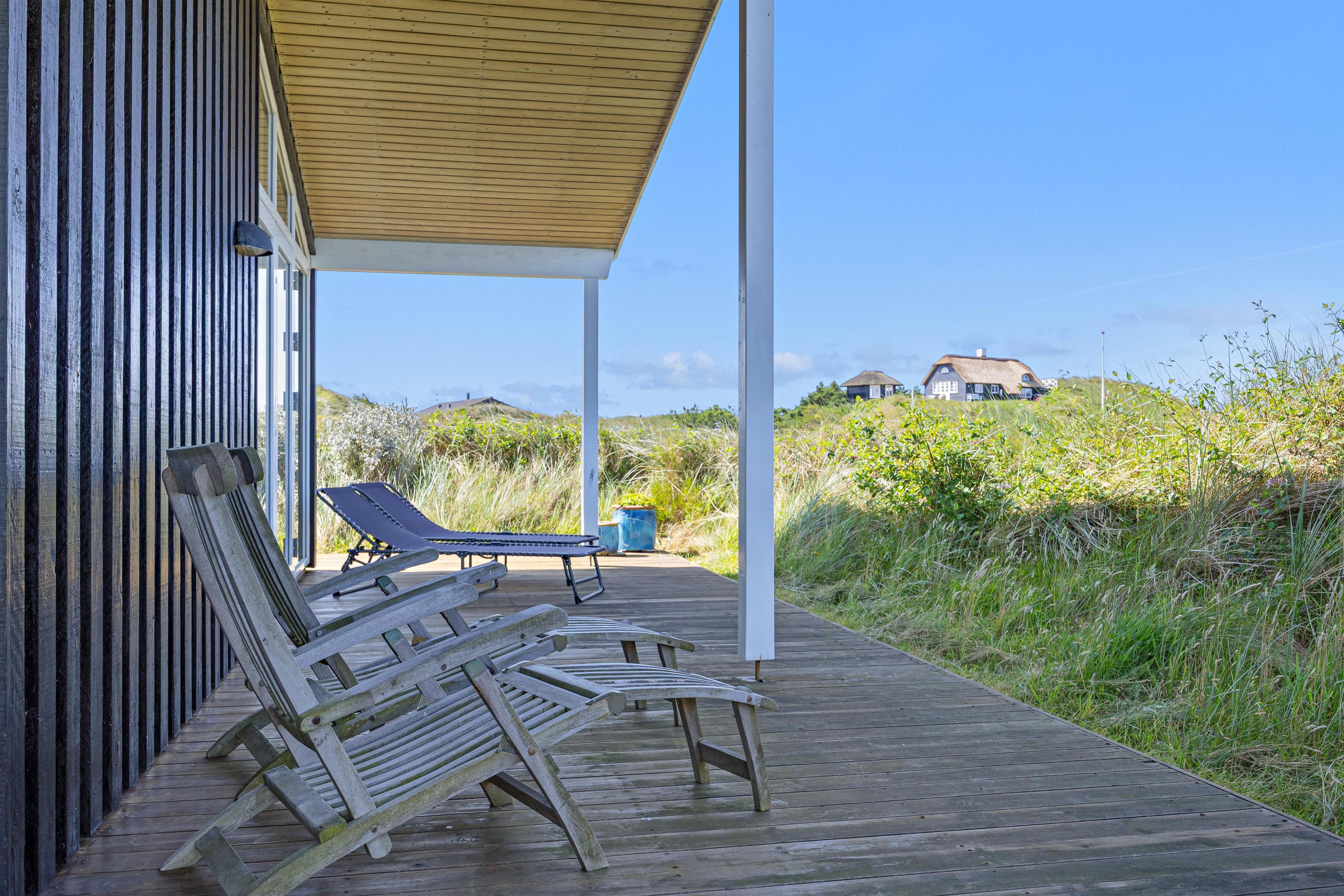 Sommerhuset har en skøn beliggenhed på en forhøjning, og både indefra og udefra får I en rigtig fin udsigt ud over klitlandskabet og ferieomgivelserne. Mod sydøst ligger en helt lukket terrasse, hvor børnene og hundene kan få fri leg, mens I læser en god bog i solen. Mod vest har I en delvist overdækket terrasse, hvor I kan sidde i skygge, hvis solen bliver for varm.
