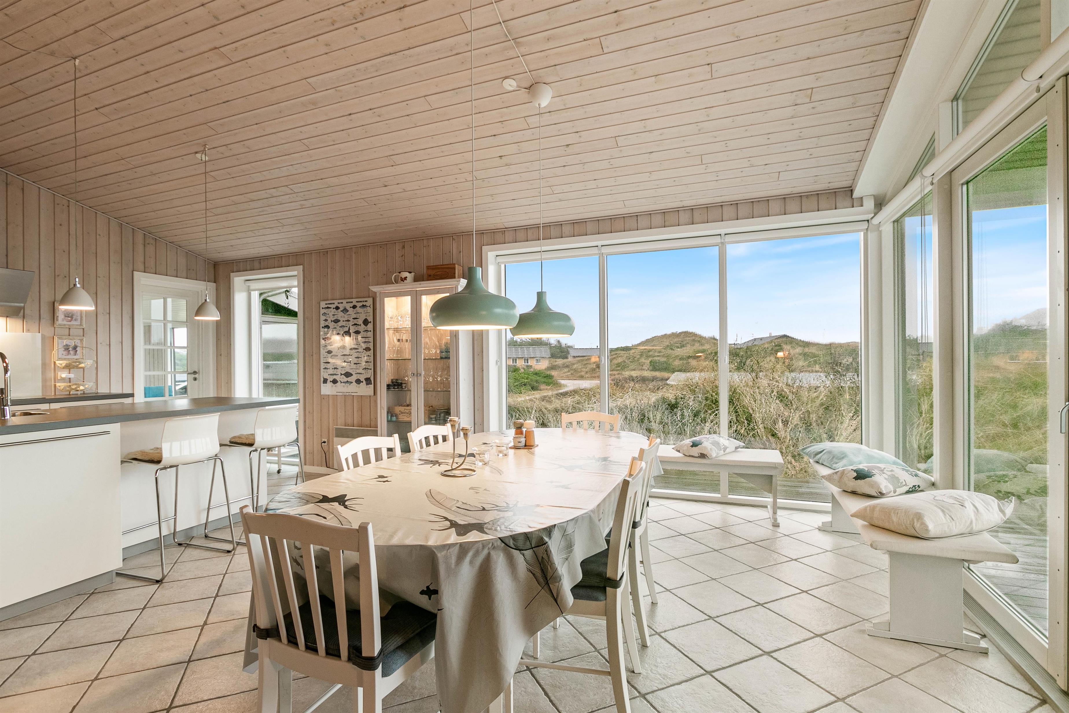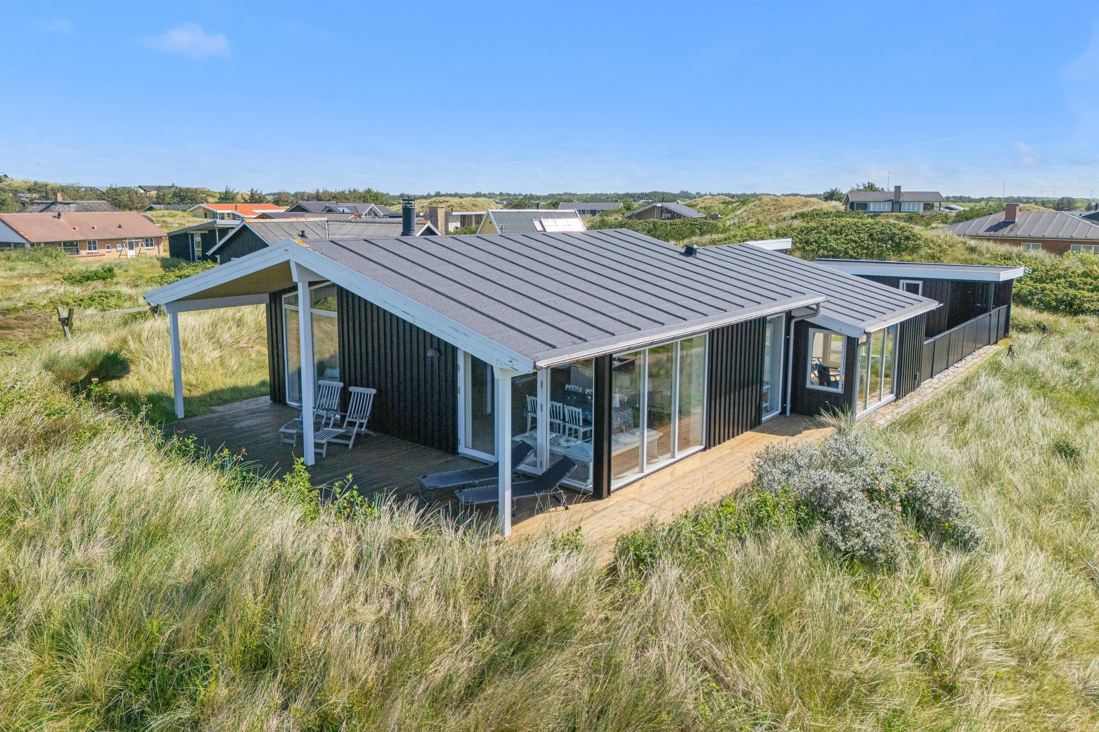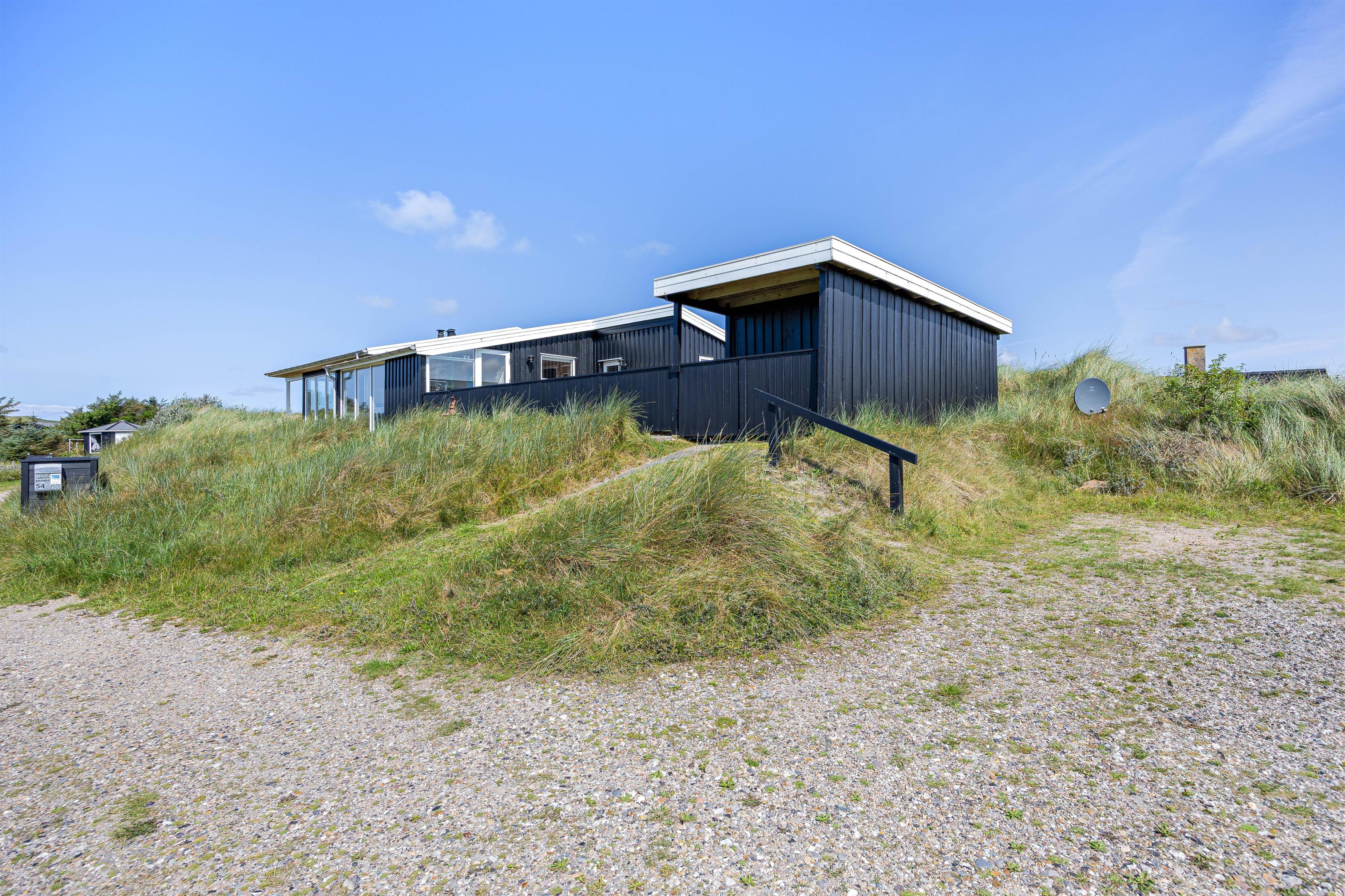 Sommerhuset har en skøn beliggenhed på en forhøjning, og både indefra og udefra får I en rigtig fin udsigt ud over klitlandskabet og ferieomgivelserne. Mod sydøst ligger en helt lukket terrasse, hvor børnene og hundene kan få fri leg, mens I læser en god bog i solen. Mod vest har I en delvist overdækket terrasse, hvor I kan sidde i skygge, hvis solen bliver for varm.