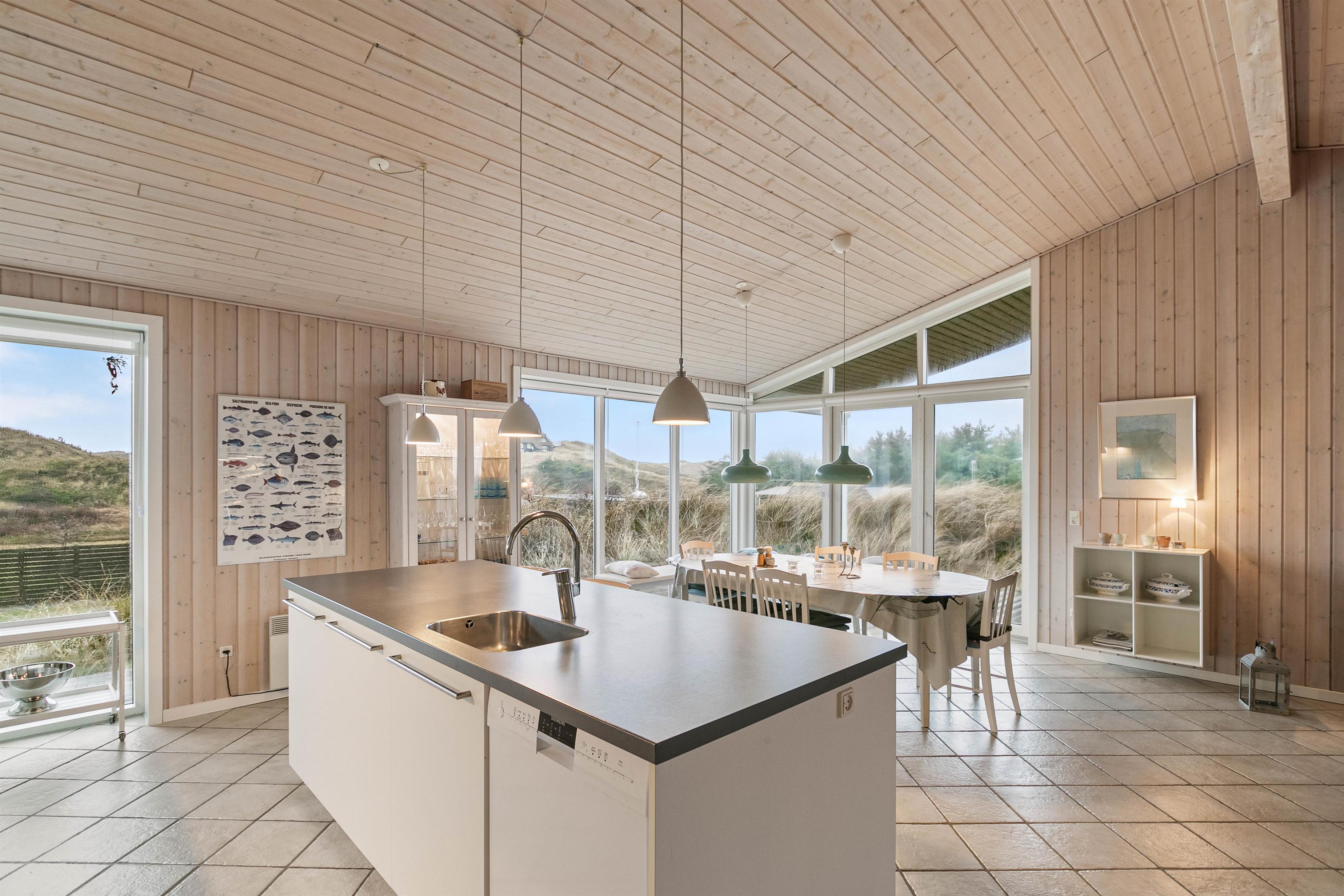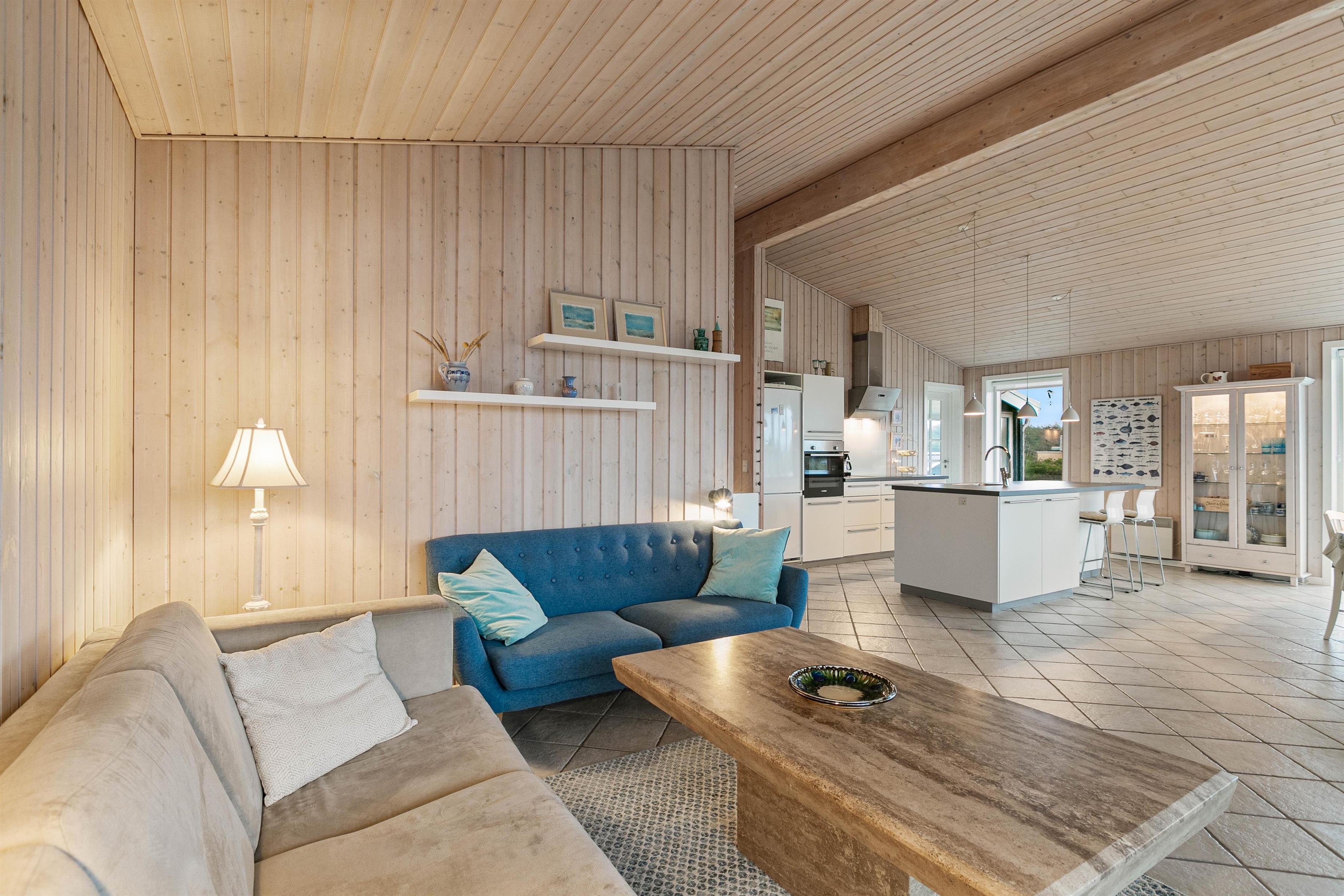 I det 120 kvadratmeter store hus er der mere end god plads til hele familien, og den lyse og venlige indretning med trævægge og -lofter sammen med de store vinduespartier får feriehjemmet til at virke endnu større.