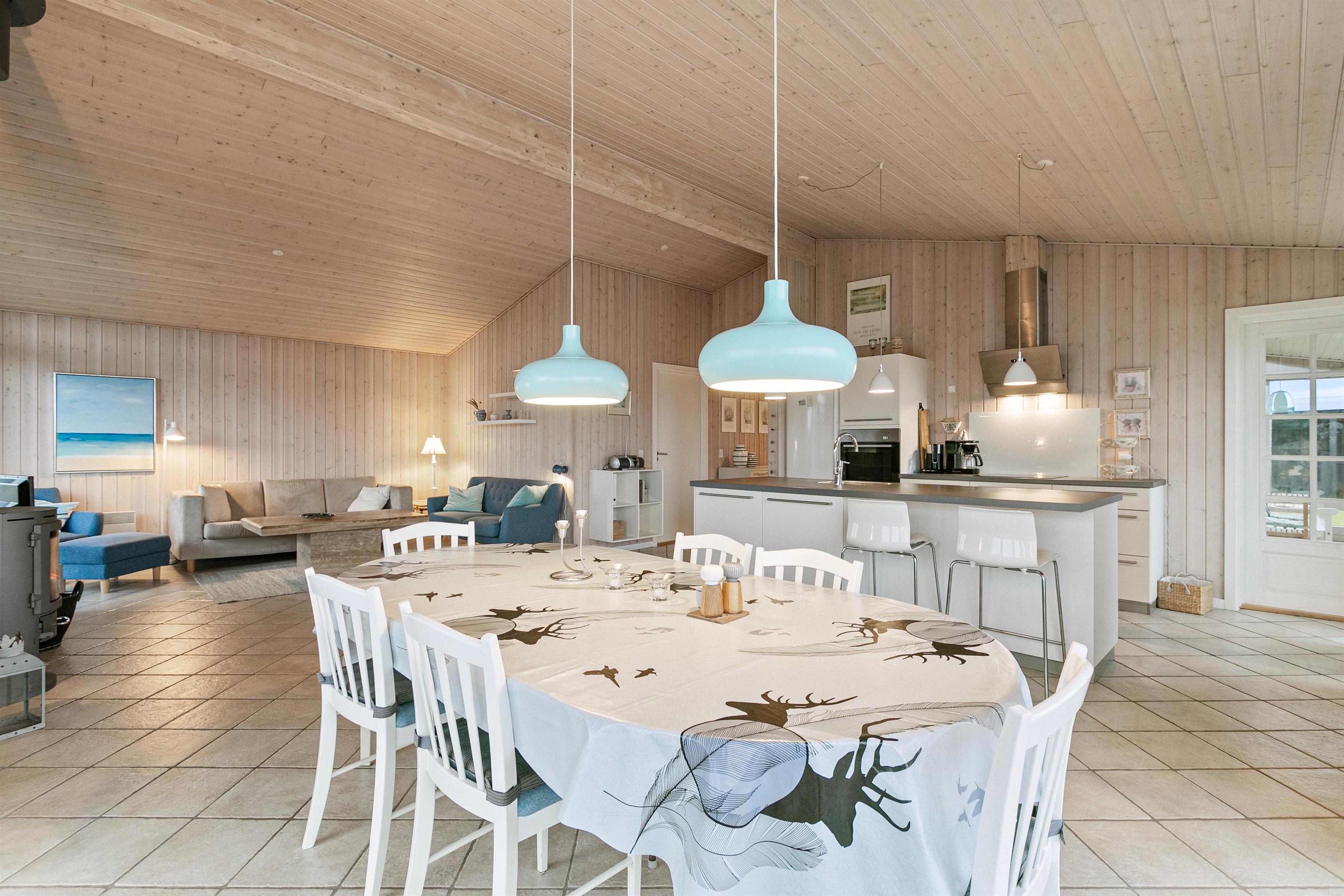 Det veludstyrede køkken, det fine stuehjørne og spiseafdelingen flyder sammen i ét stort opholdsrum, som kommer til at danne rammerne om masser af hyggelige feriestunder med samvær og afslapning. Især brændeovnen vil sprede ægte feriestemning og god atmosfære på de kolde feriedage, og de knitrende flammer vil fylde rummet med varme.
