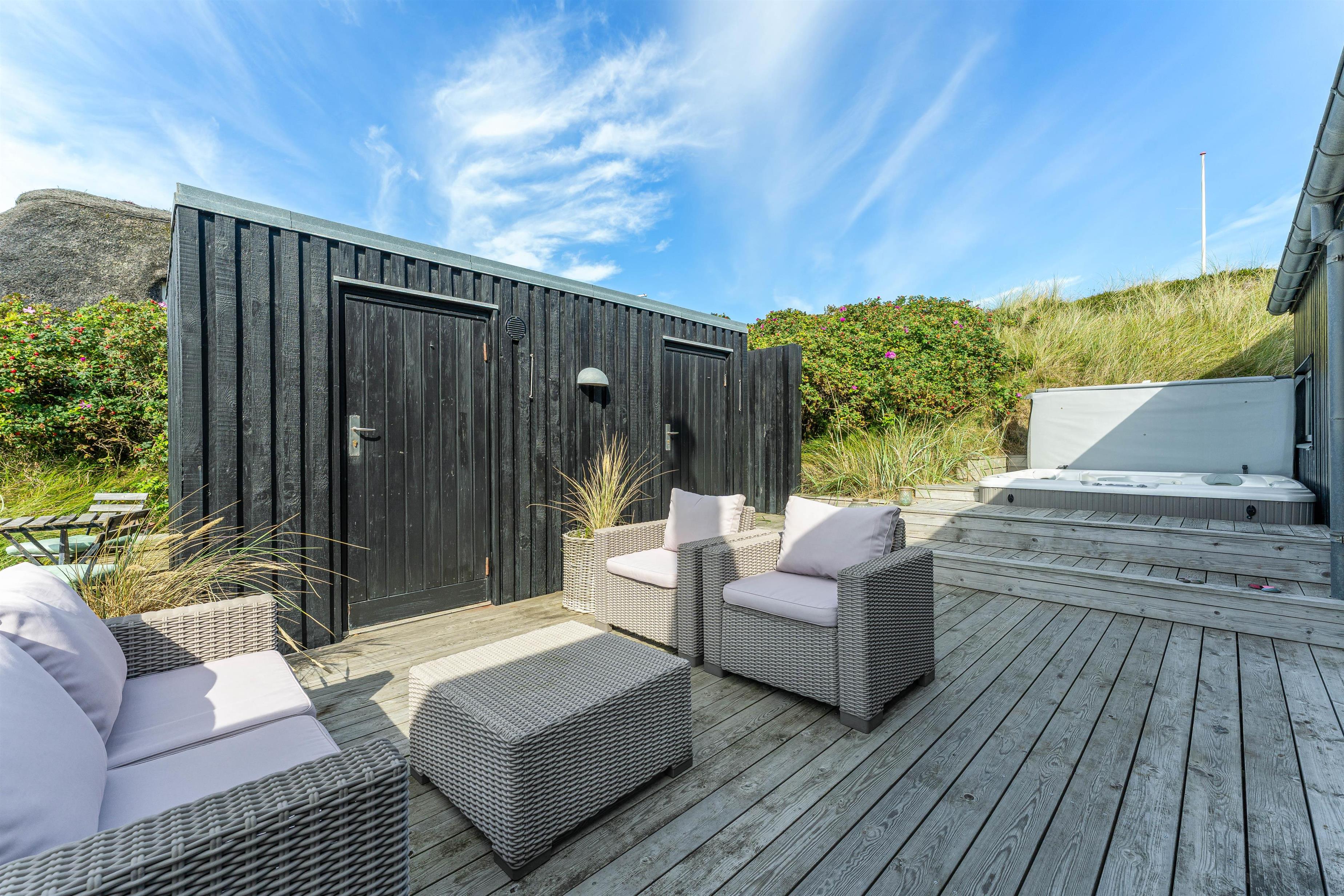 Her bor I så tæt på havet, at I blot behøver smide håndklædet over skulderen og smutte ned over klitterne for at få en morgendukkert. Og holder I ferie i den koldere årstid, så har I jo muligheden for at tænde op i husets sauna og efterfølgende lade jer varme godt igennem.– En særlig facilitet ved huset og skøn oplevelse er at tænde op i den udendørs spa, og sidde og slappe af i det skønne varme vand under åben himmel - måske læne sig tilbage og på en skyfri aften tælle stjernerne?