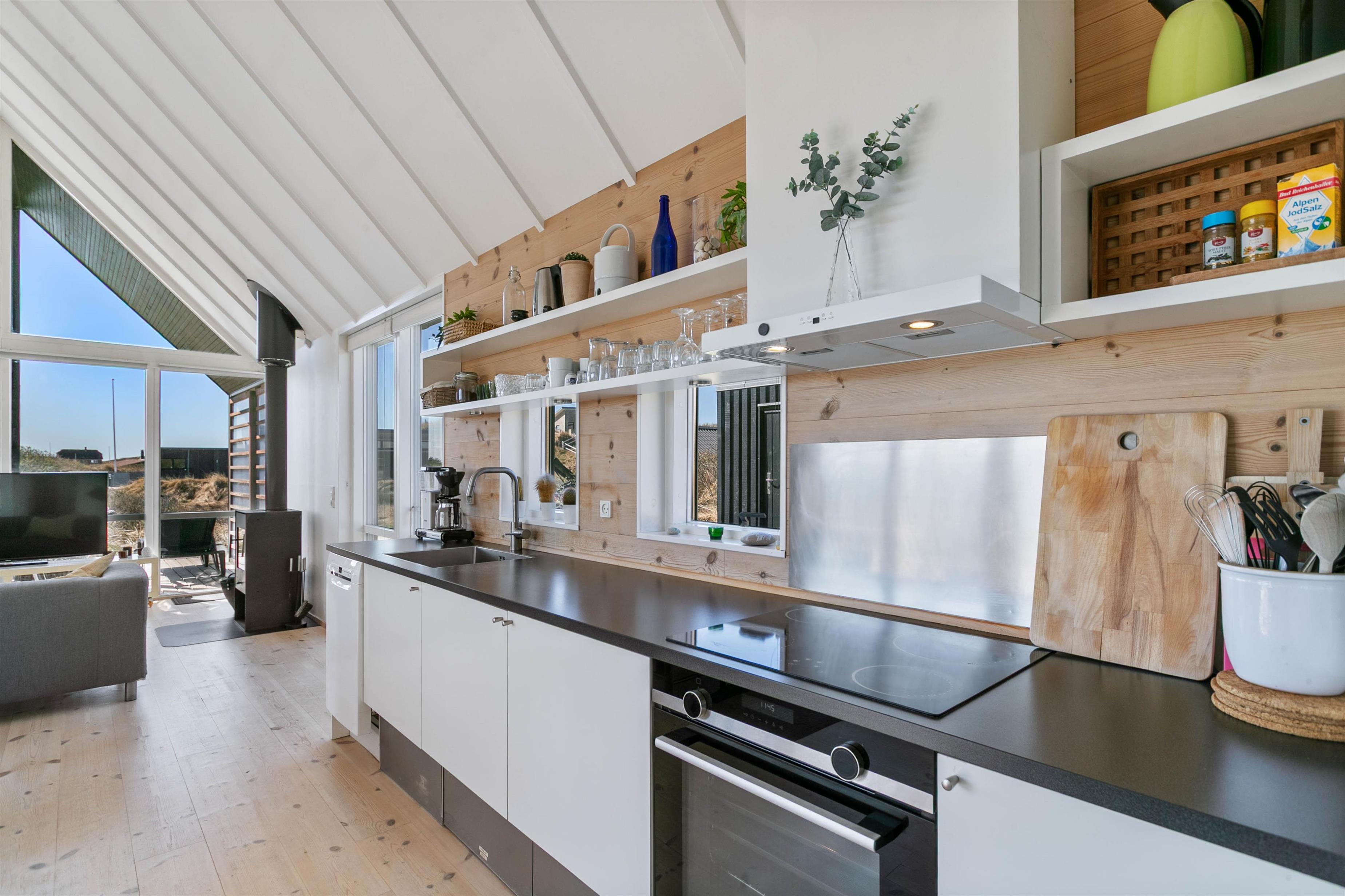 Et moderne velindrettet køkken og en spiseplads med udsigt indbyder til i fællesskab at tilberede lidt godt til ganen. Efter maden kan I tænde op i brændeovnen og sætte jer til rette i den grønne sofa foran fjernsynet.