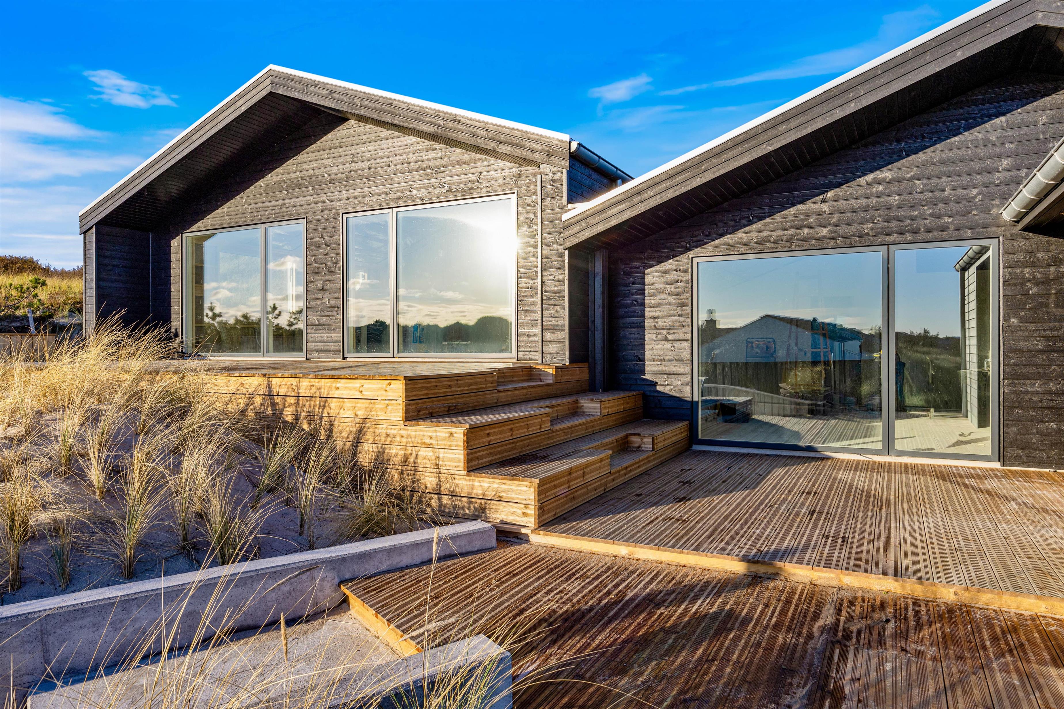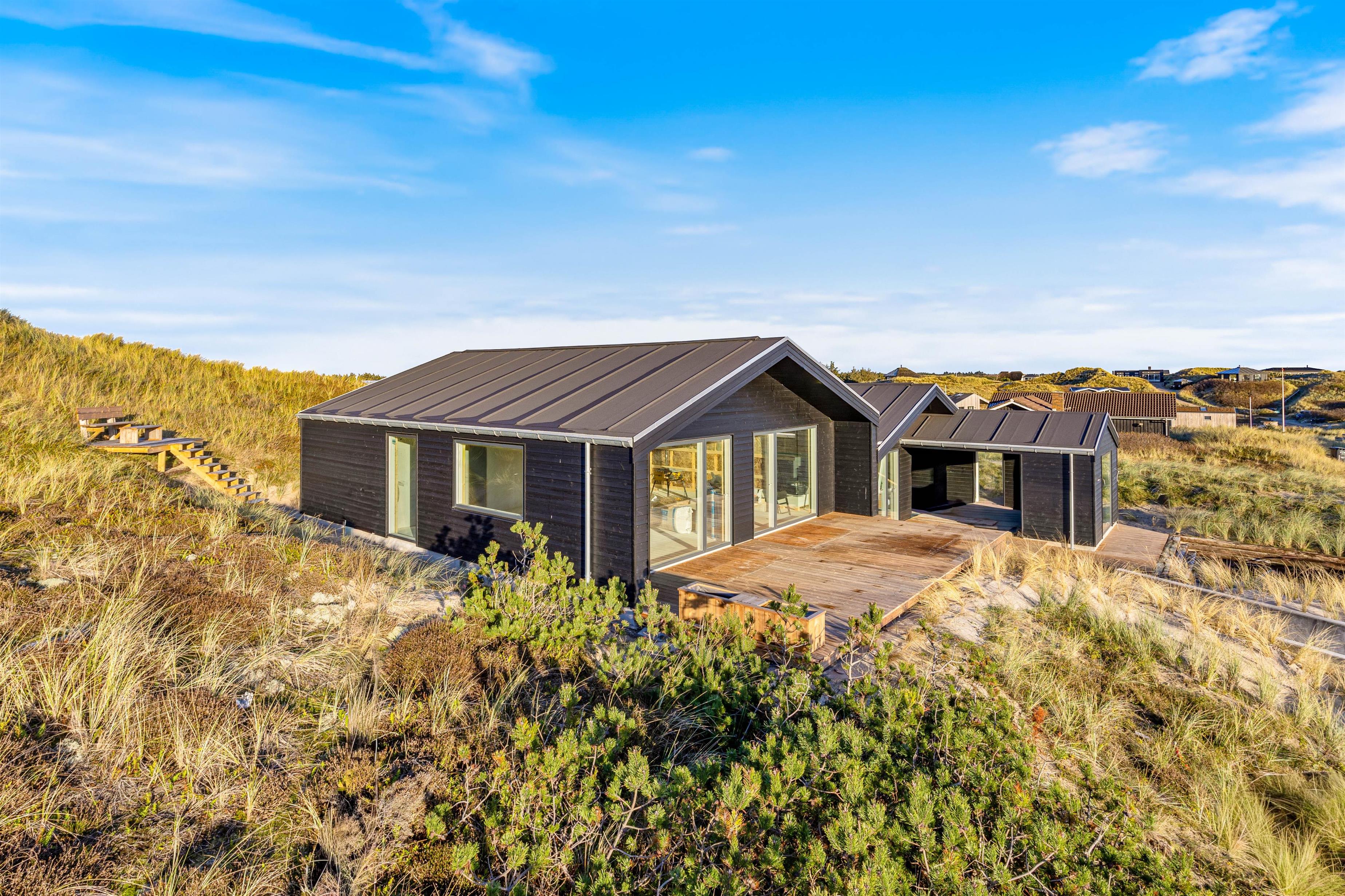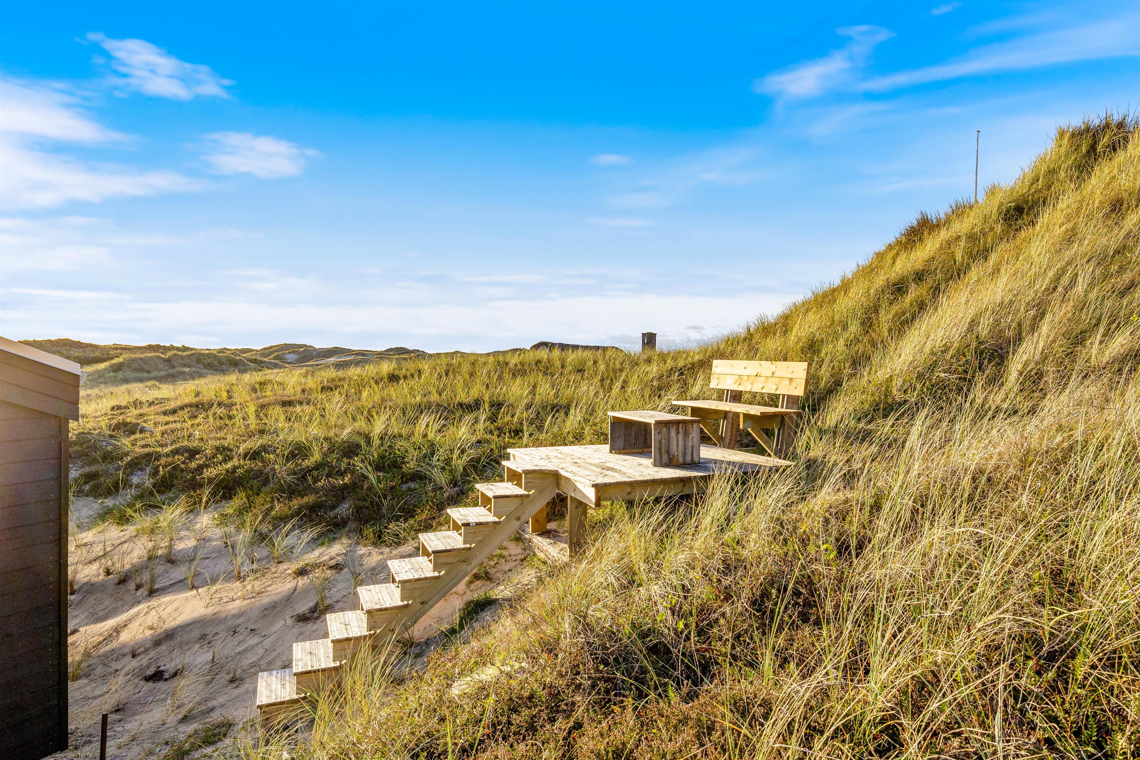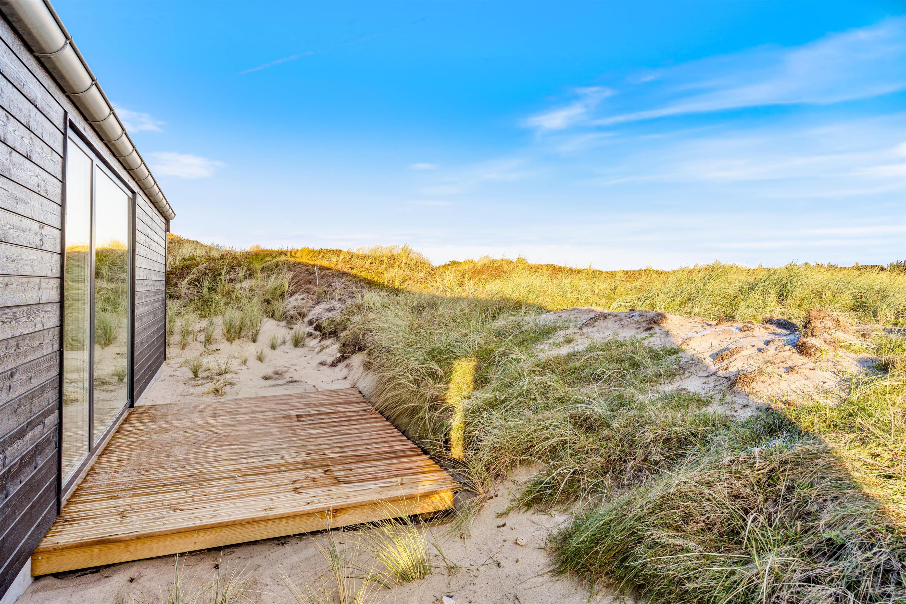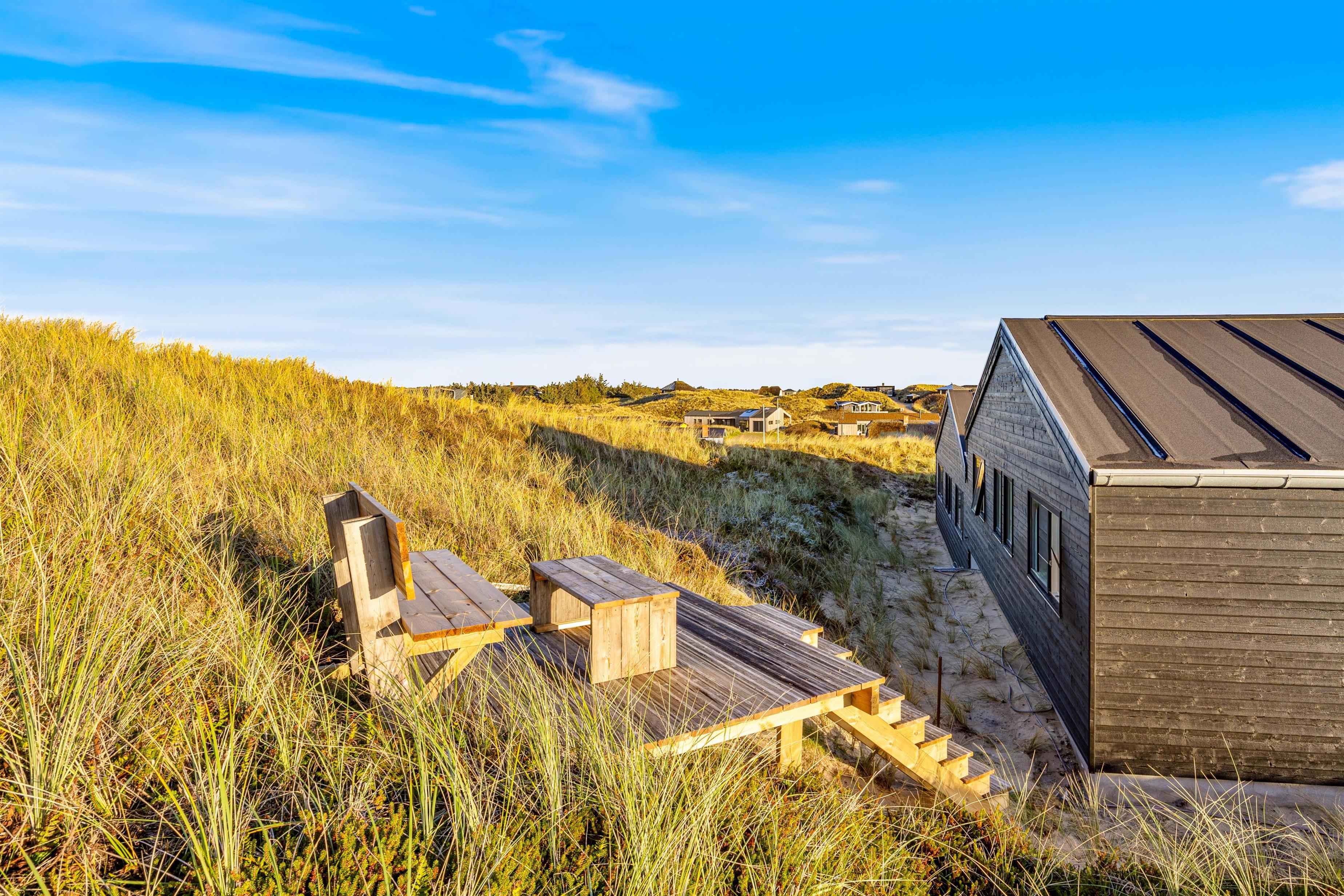 Sommerhuset er beliggende på en 1.222 kvadratmeter stor natur- og klitgrund fyldt med hyggelige siddekroge og muligheder for afslapning. På sommerhusets forside finder I en stor afskærmet og overdækket terrasse, hvor I kan læne jer tilbage i liggestolene og nyde den fantastiske udsigt over klitlandskabet. Her kan I også tænde op i gasgrillen og nyde en lækker middag med et godt glas vin. Slut dagen af i sommerhusets udendørs spa og oplev den danske stjernehimmel, eller nyd blot roen og nærværet i de naturskønne omgivelser.